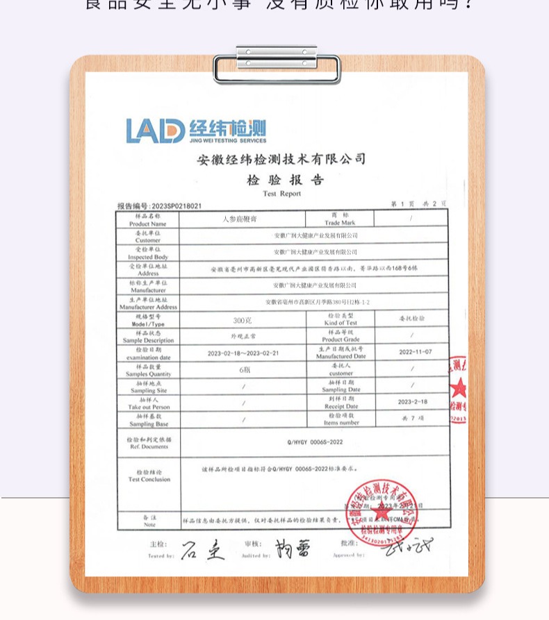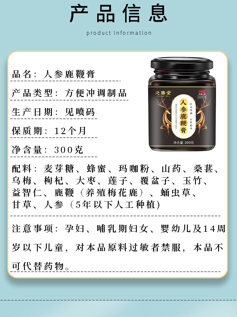 配料:麦芽糖、蜂蜜、玛咖粉、山药、桑葚、乌梅、枸杞、大枣、莲子、覆盆子、玉竹、益智仁、鹿鞭(养殖梅花鹿)、虫草甘草、人参(5年以下人工种植)