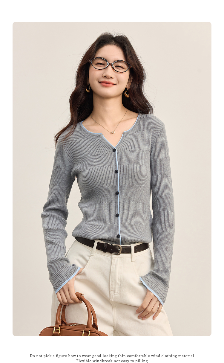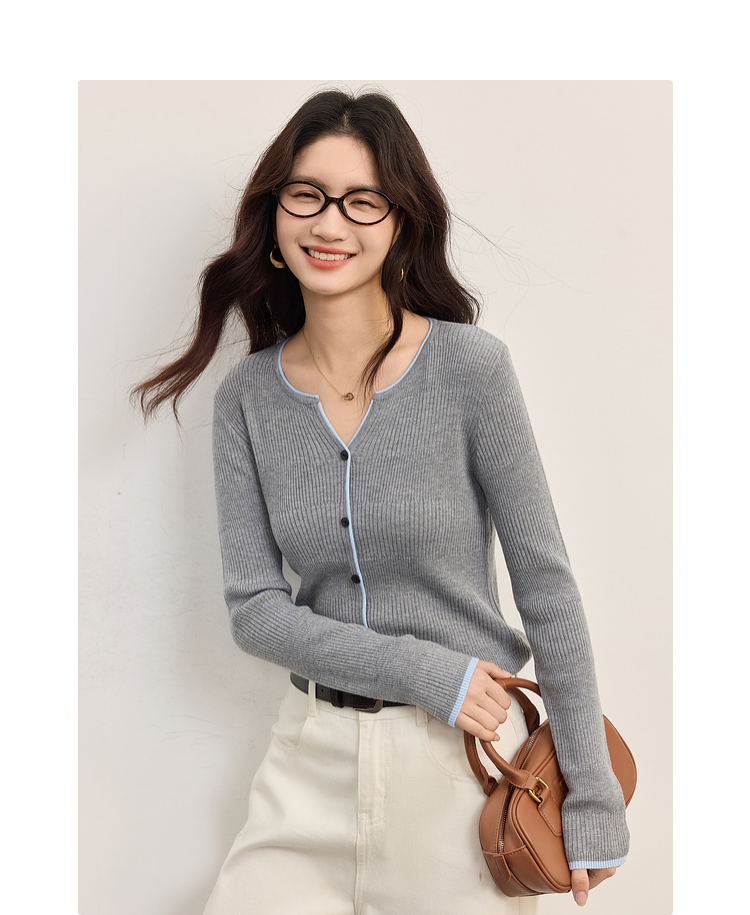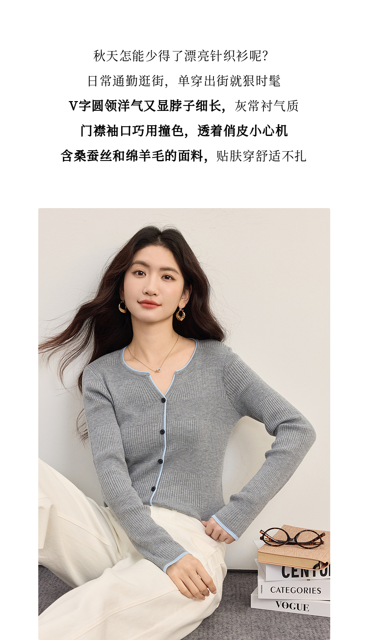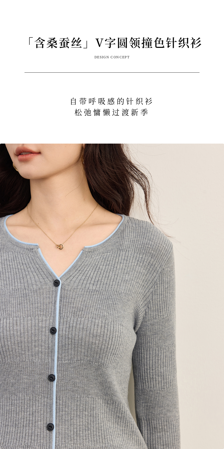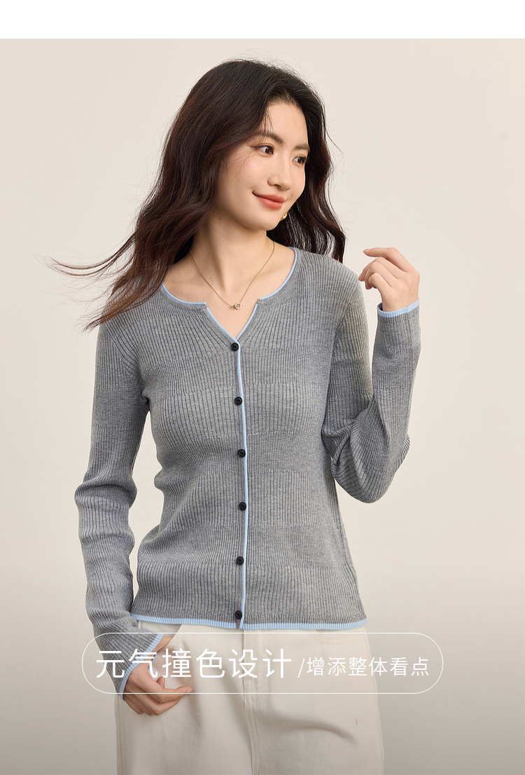 【09/03新品】熙世界桑蚕丝羊毛针织衫女士长袖2025秋季新款撞色边坑条软糯上衣