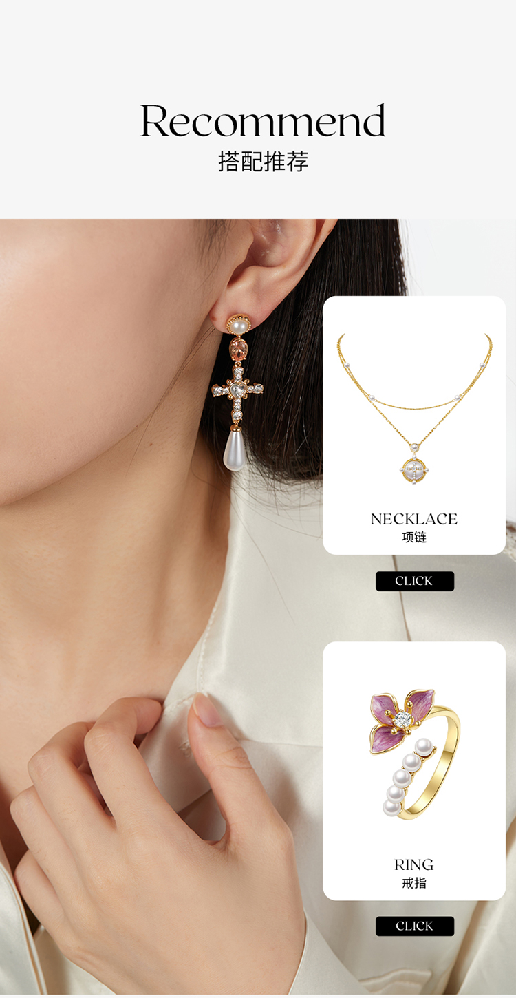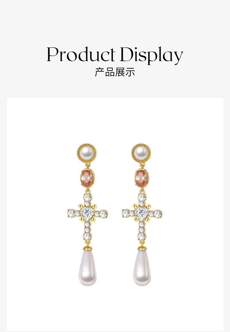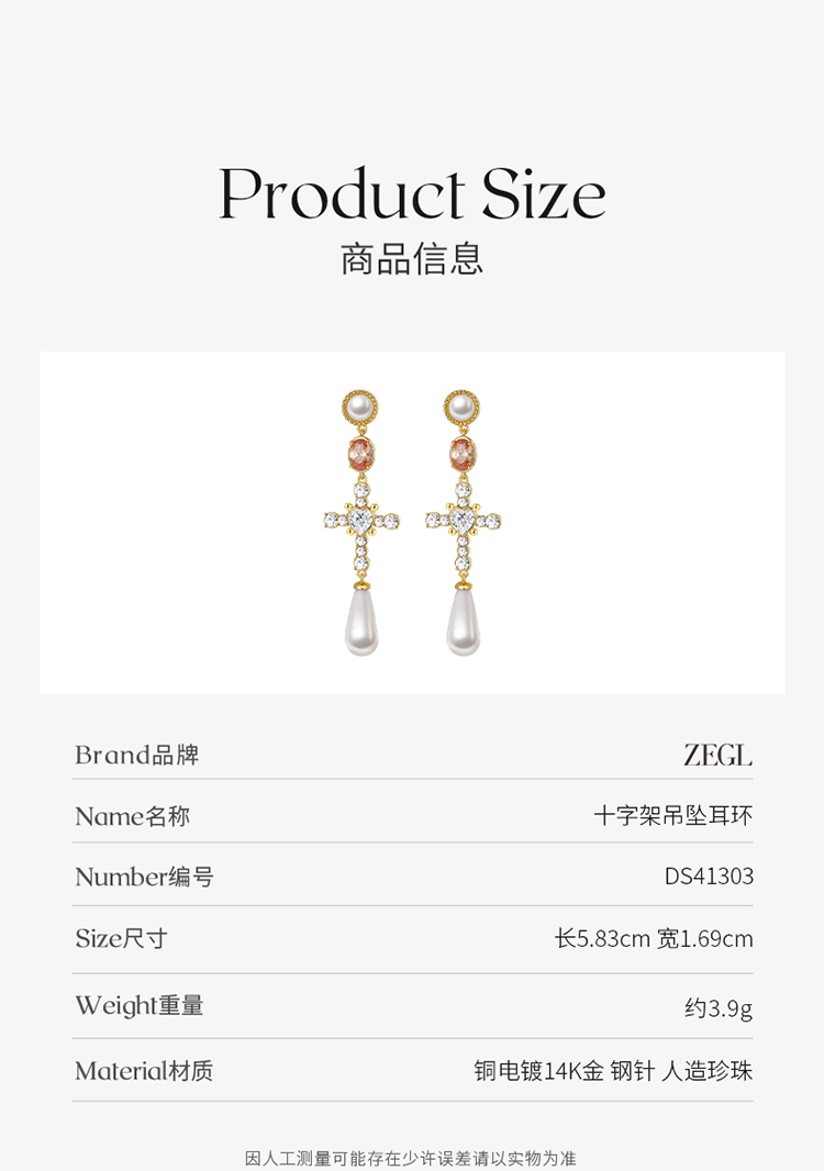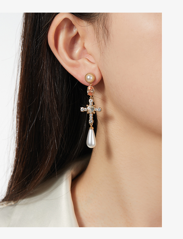 ZEGL设计师法式十字架系列流苏人造珍珠耳环女高级感耳钉银针耳饰