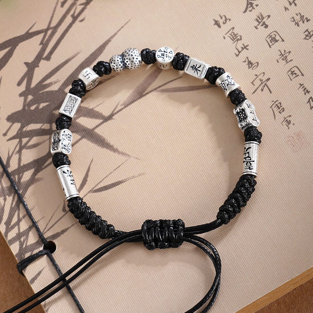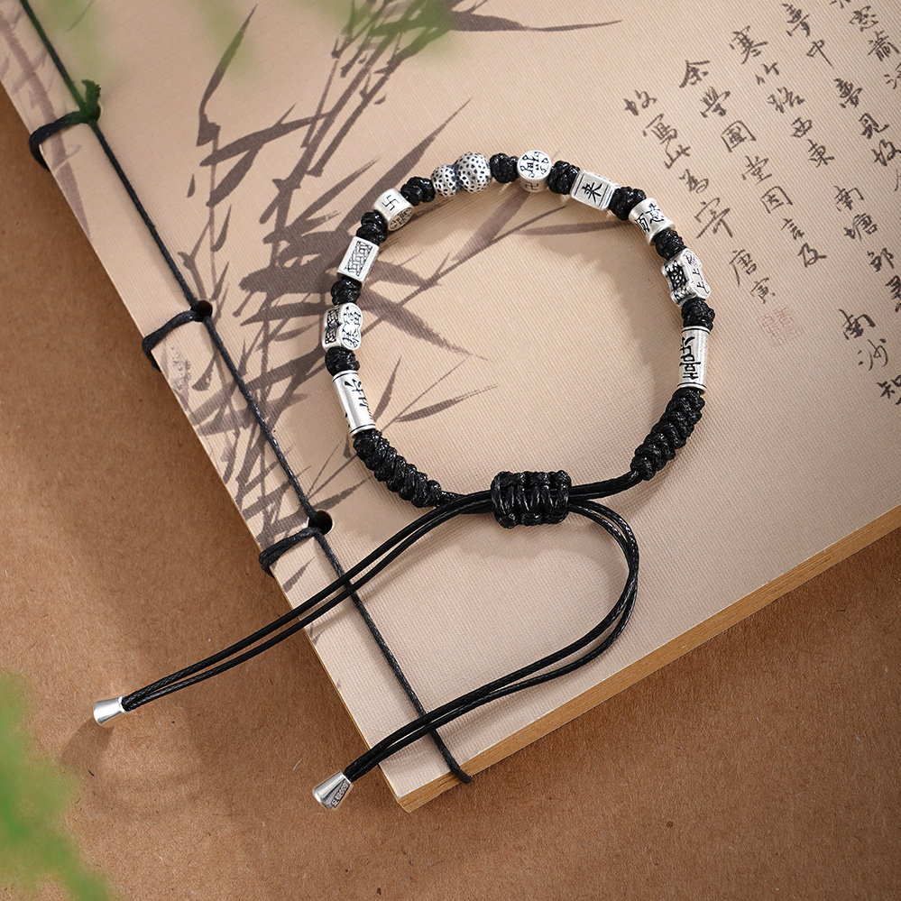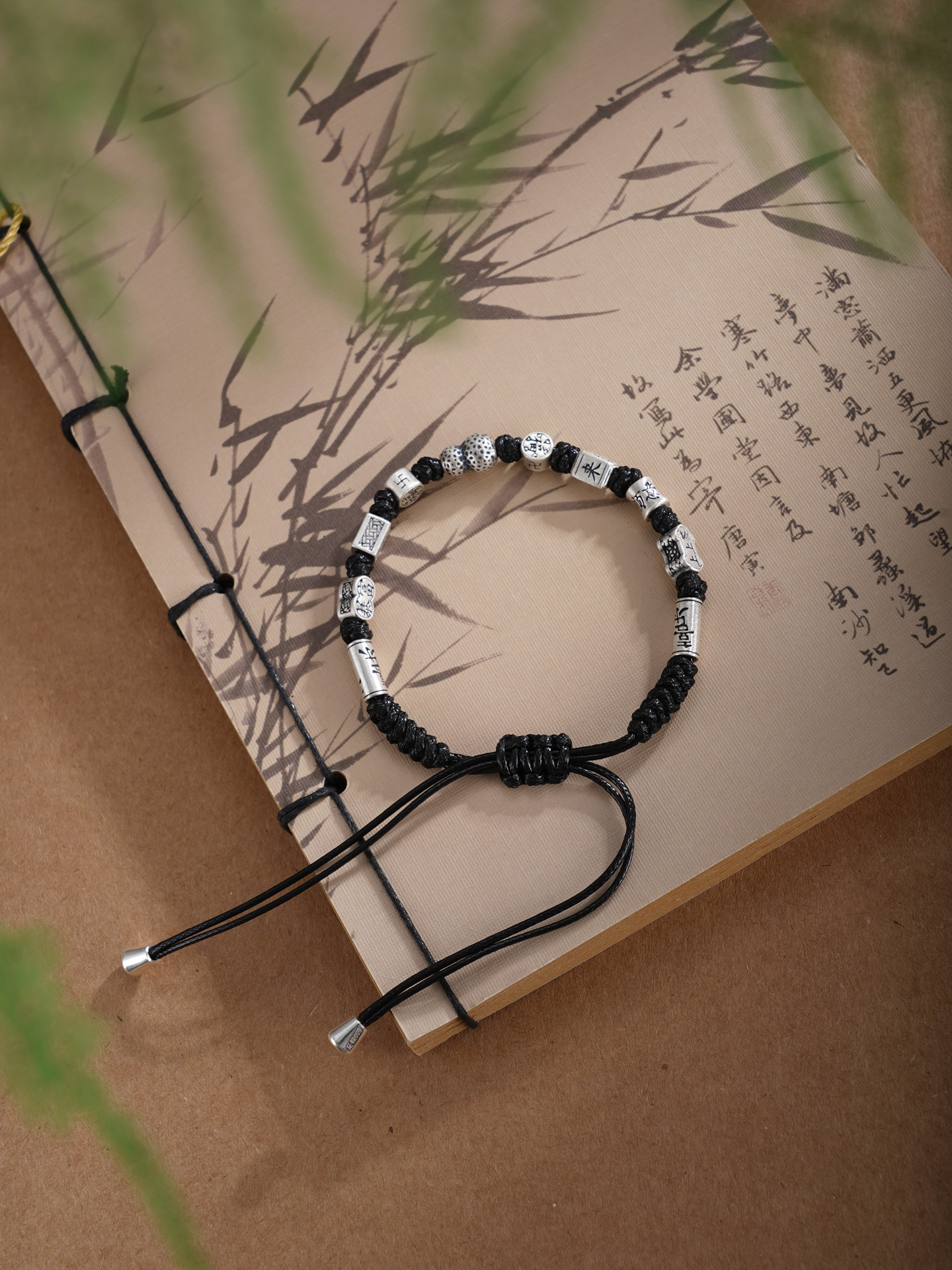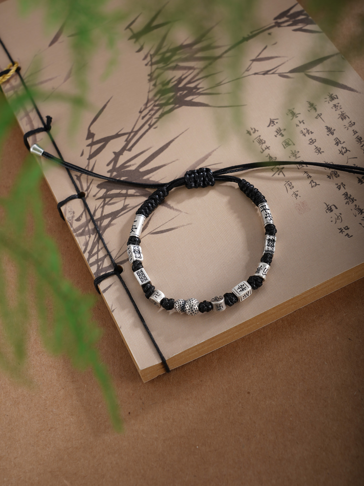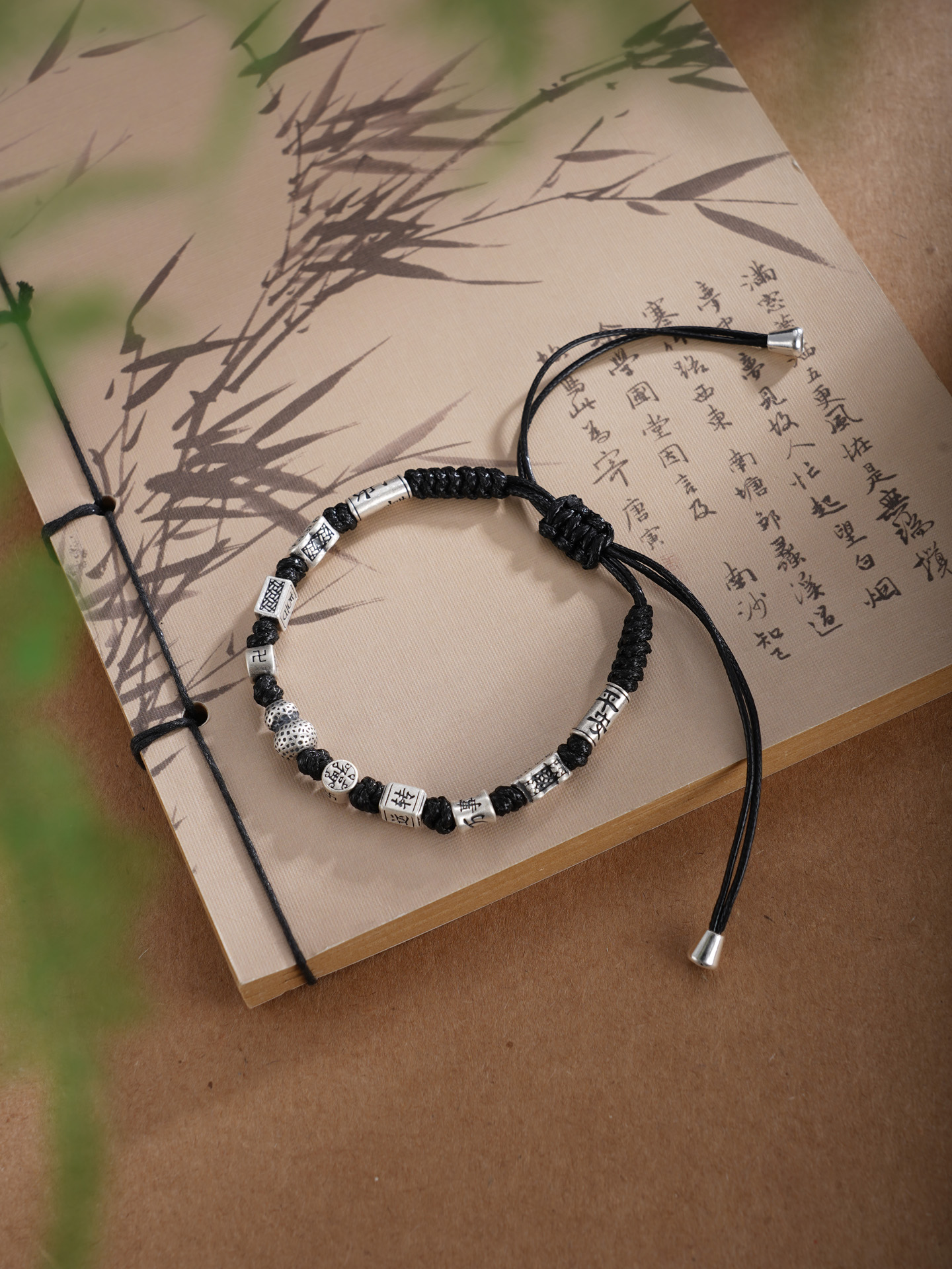 【寓意】:纯银链身与黑色编织绳交织,平安喜乐字样点缀其间,寓意平安喜乐常伴,生活安康顺遂,岁岁皆成圆满。