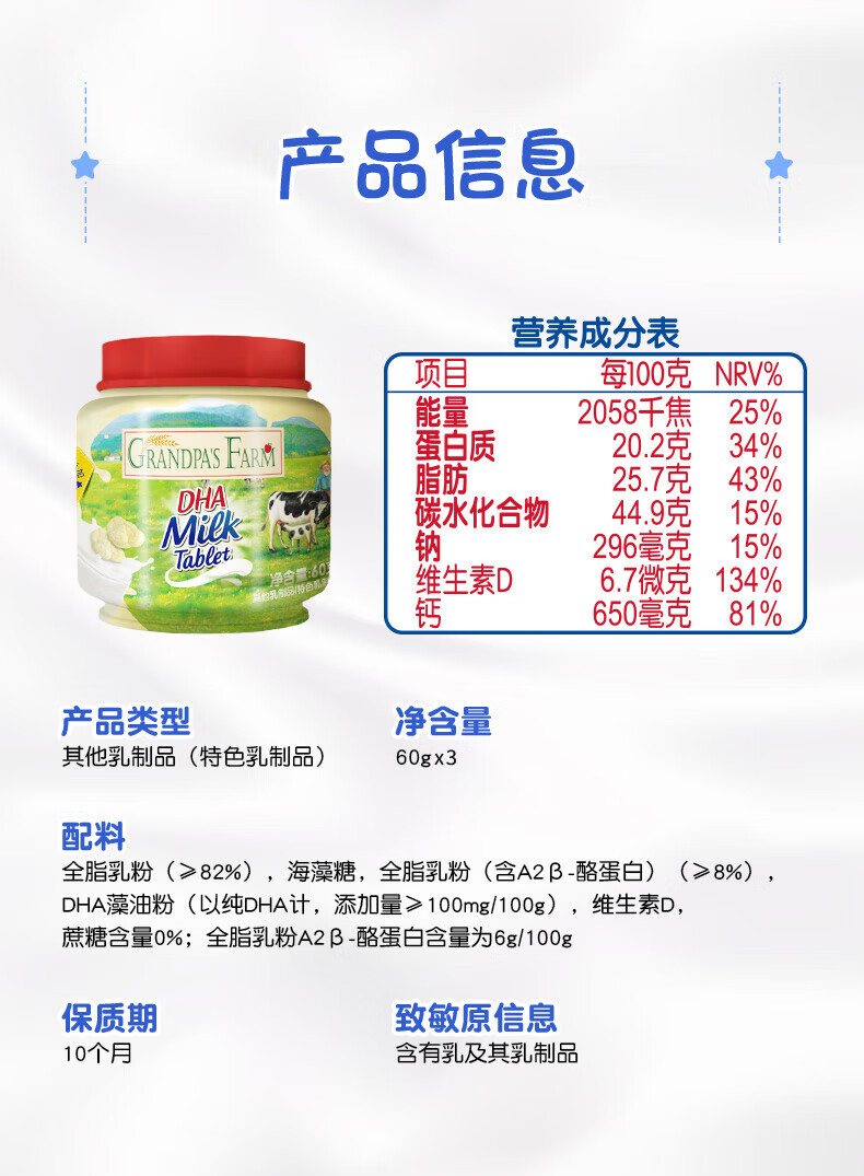 【分仓直发包邮】爷爷的农场DHA牛乳奶片60g*4罐装 高钙无添加白砂糖儿童营养零食