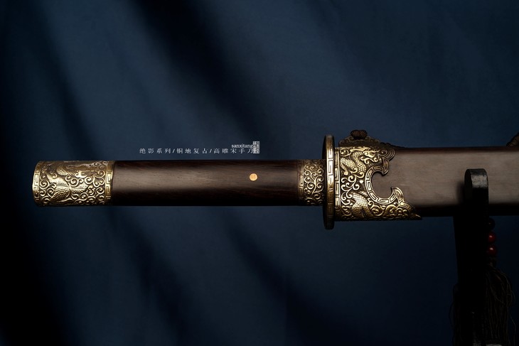 这只是之前给国外做的款 在国外零售5600+ 现在做了一些给大家入手 这只作品的特点就是 霸气实用 4000余层手工锻打 密罗纹拼水波纹 专门针对这款东西进行的热处理 性能相当不错 根据出土实物进行的复刻 这个刀型非常强悍 练过两天的兄弟应该都明白 我们独有的金具 几个大块都是铜地复古纹路清晰 带一些自然锈出来的感觉 后期继续盘的话还会包浆 效果相当不错 刀夹也是订做的型 海龙造型 刀像水波一样从龙嘴里吐出 全黑檀木的柄和鞘很稳定 收藏是非常不错的!