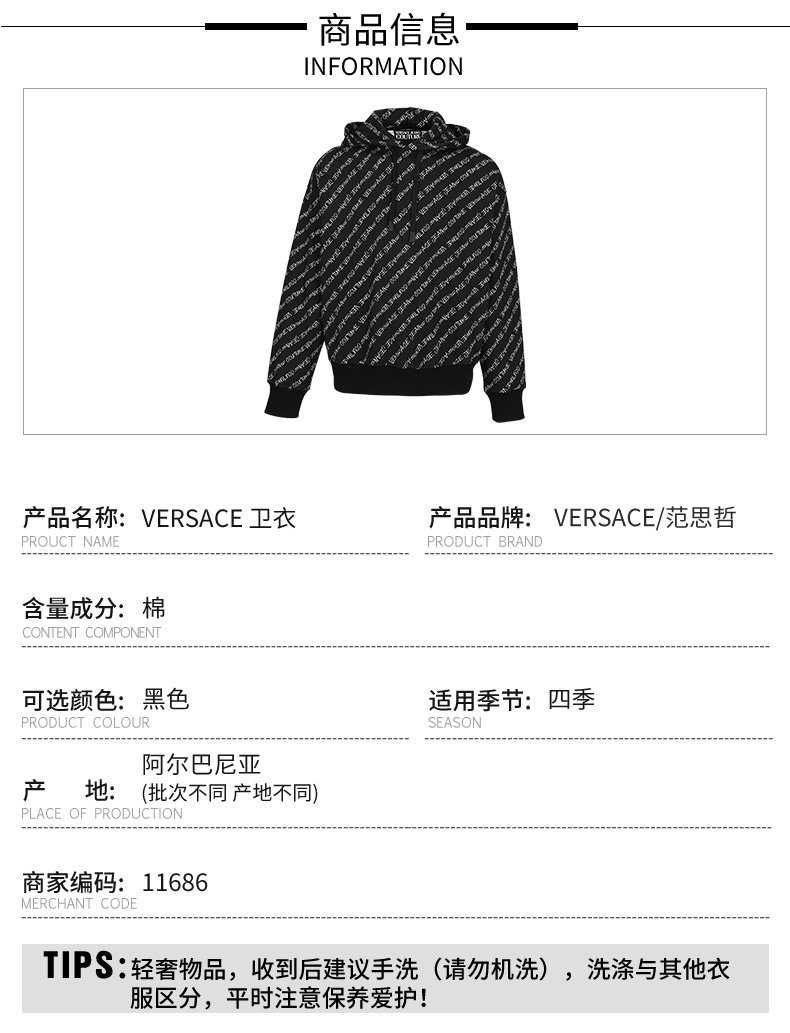 Versace 范思哲 男士全棉连帽字母印花休闲卫衣外套 11686