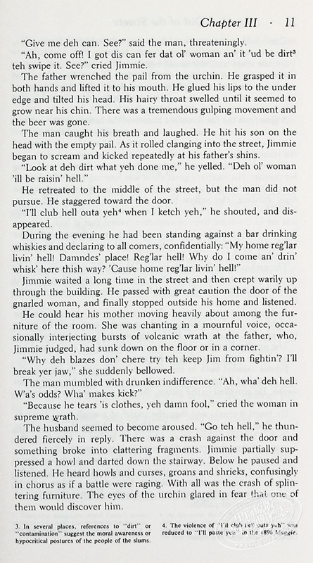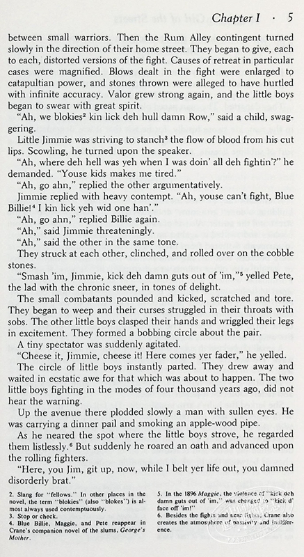 Footnotes indicate changes in wording Crane made for the 1896 edition and explain slang expressions and customs of the day. Maps of the novel’s New York City locales are also provided.