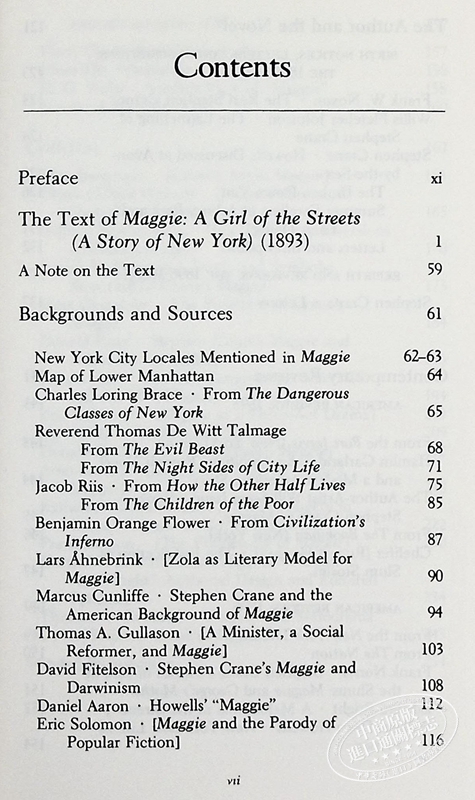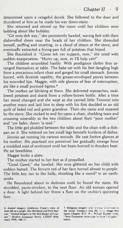 脚注指出了克兰为 1896 年版所做的措辞变化,并解释了当时的俚语表达和习俗。 还提供了小说中纽约市的地图。