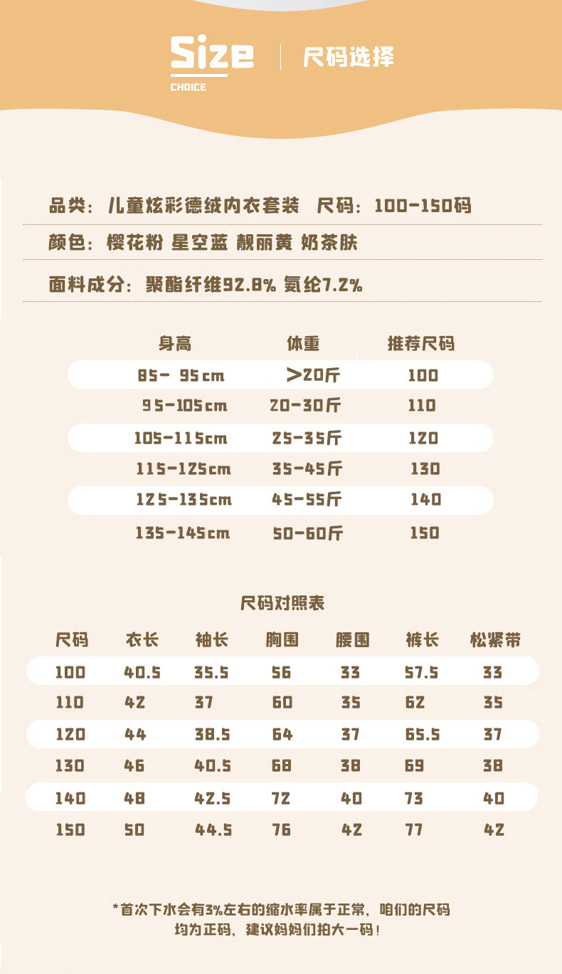 儿童款:首次下水洗涤会有3%的缩水属正常现象哦,宝宝长的快建议拍大一码哦,男女同款哈