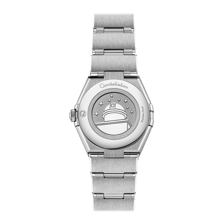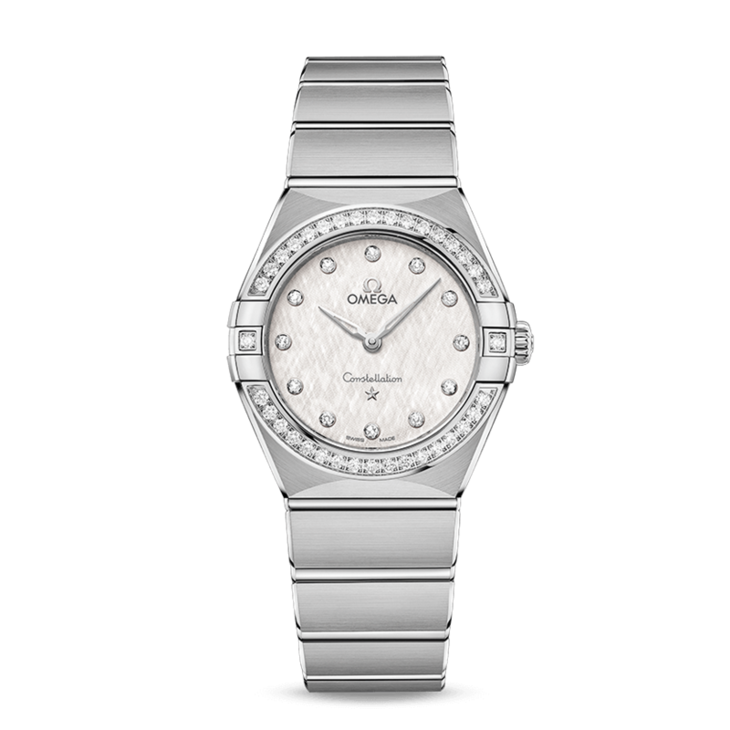 镜面材质 | 蓝宝石水晶玻璃 | 表盘 | 经典的半月形切面、“托爪”以及mono-rang表链。 精钢腕表,表圈铺镶钻石,亮白银表盘呈现丝绸纹理,饰有钻石小时刻度,覆有耐磨损蓝宝石玻璃表镜。指针、欧米茄品牌标识、星座徽标以及钻石托槽以白色18K金打造而成。 密底 |