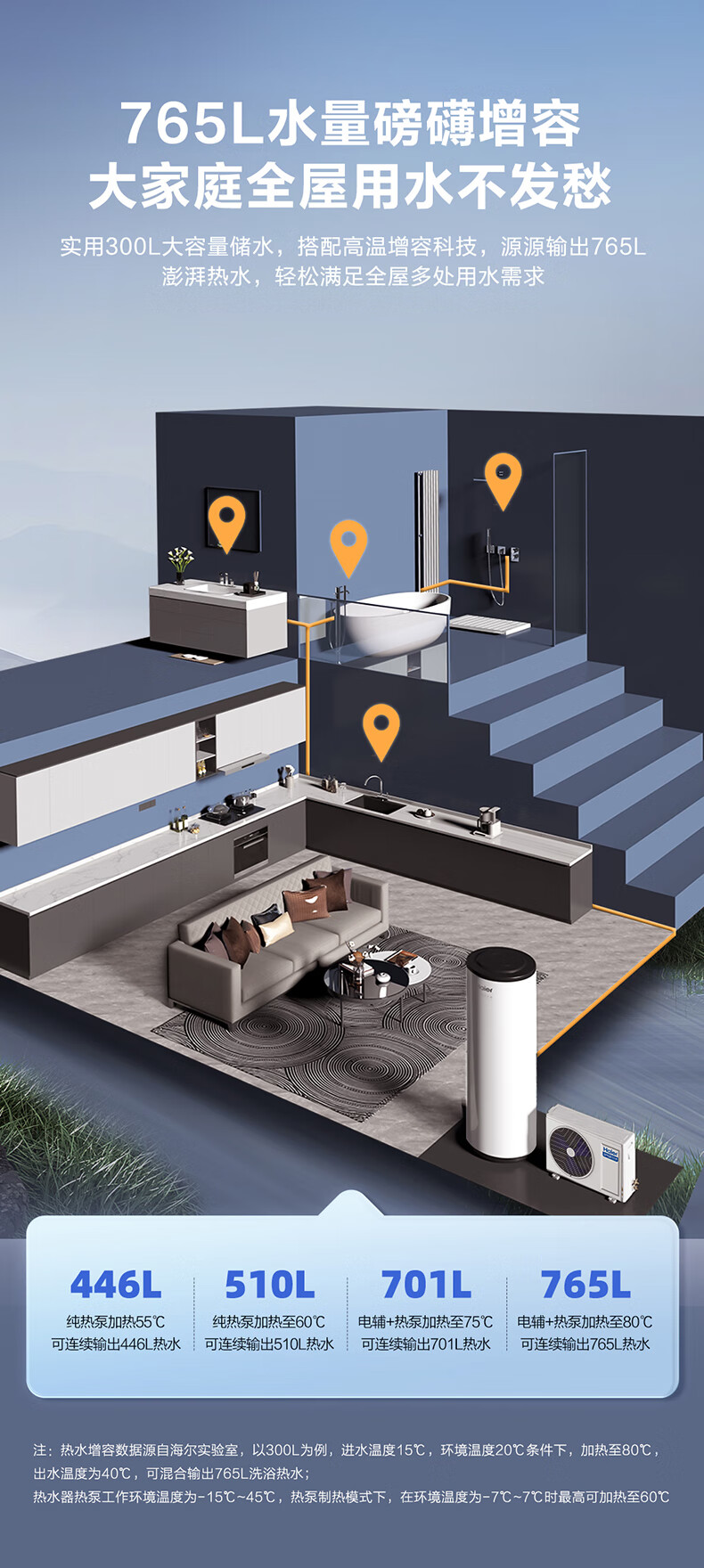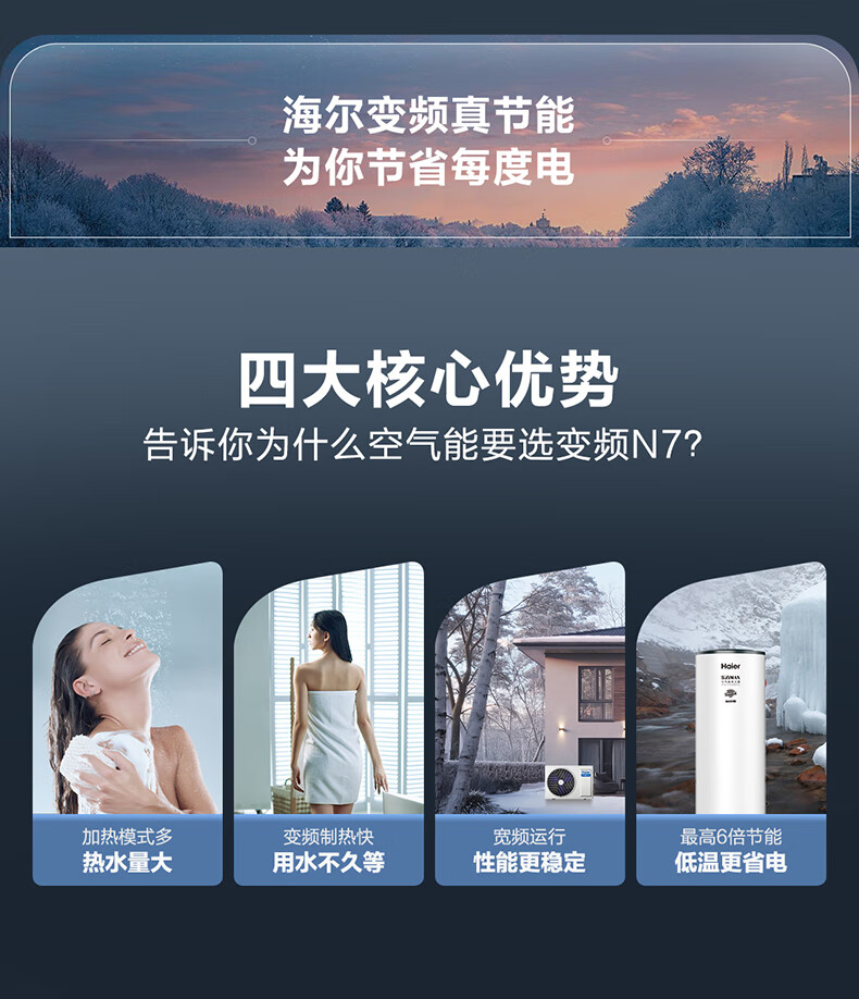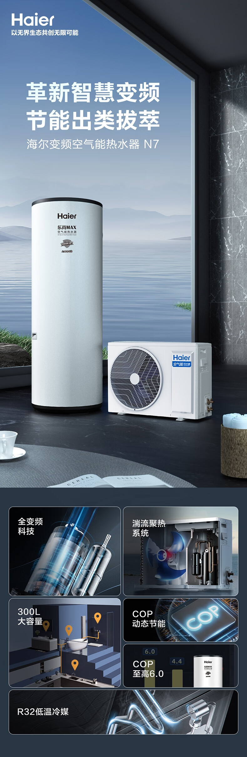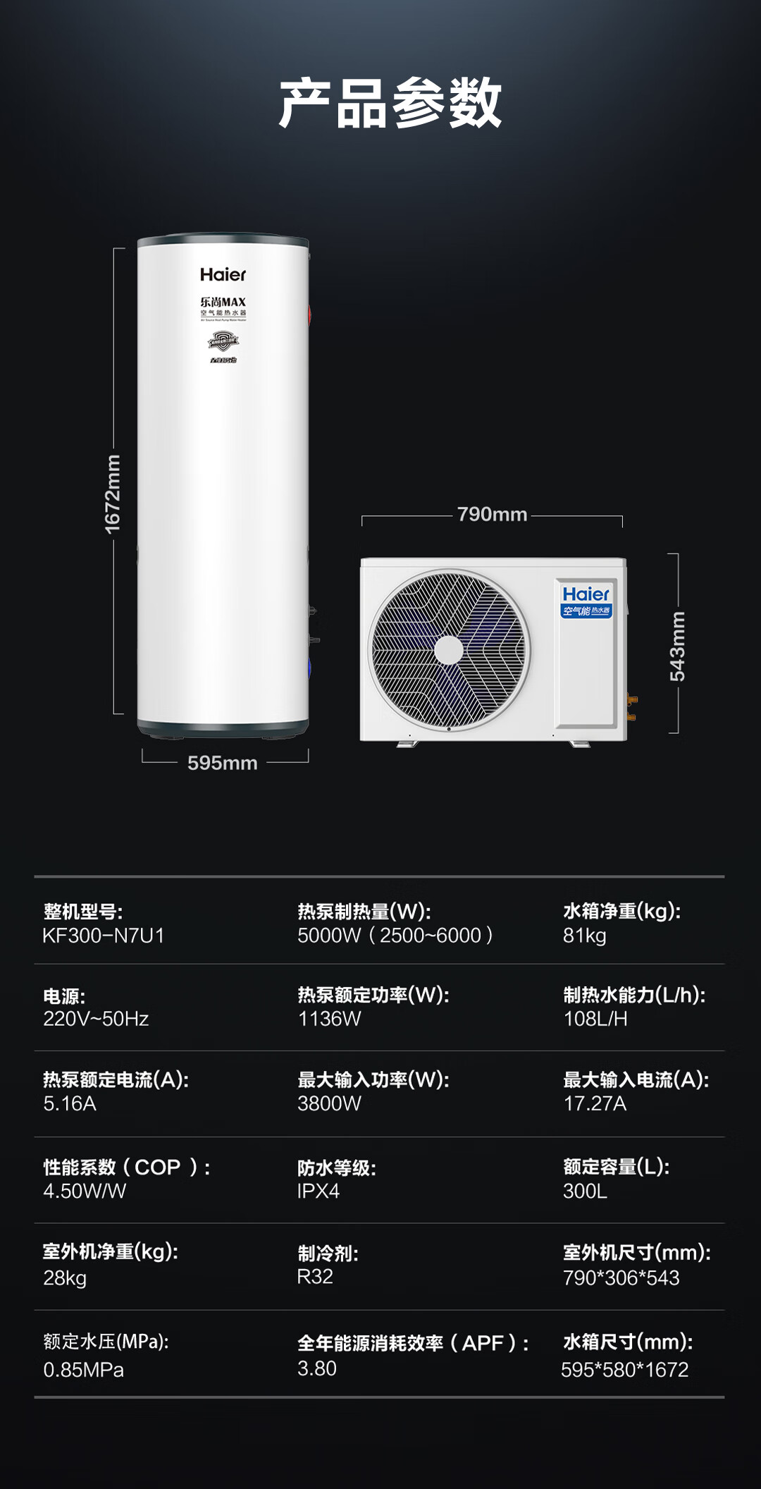 海尔(Haier)空气能热水器300升全变频超一级能效2匹电辅80℃高水温WIFI智控 KF300-N7U1(6-10人)