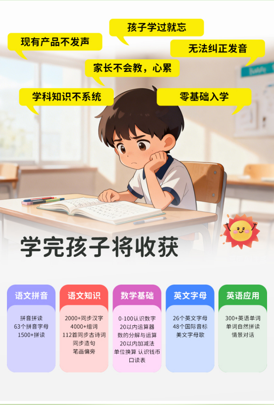 囤一堆启蒙书娃还不买账… 直到挖到小霸王这款语数英点读书DD01,直接把启蒙课堂搬回家! ✅ 一本顶6本!再也不用乱囤书 语数英三大科全覆盖也太香了!2000+汉字+4000+组词,从识字到运用循序渐进; 112首经典古诗带真人朗诵,娃边听边背积累传统文化; 数学基础运算+英文字母+口语启蒙同步拿捏,还能衔接一年级知识点,提前适应小学节奏,幼小衔接无缝过渡 ✅ 英语部分还升级了短句小故事,不是生硬的单词堆砌,娃连蒙带猜就能读懂,重复句型读多了还能自己运用,语感直接拉满~