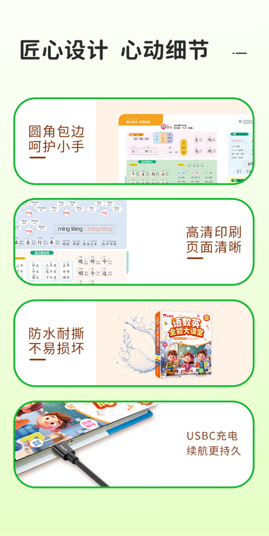✅ 安全耐造!低龄宝闭眼冲 给娃选东西,安全永远排第一!厚实铜版纸+双面覆膜,防水防污还耐撕,不怕娃洒水、乱撕,一台能用好几年; 环保油墨无异味,符合儿童安全标准,近距离翻阅也放心[8]。 圆角切边设计,杜绝尖锐棱角,不用担心划伤宝宝小手,细节拉满✨