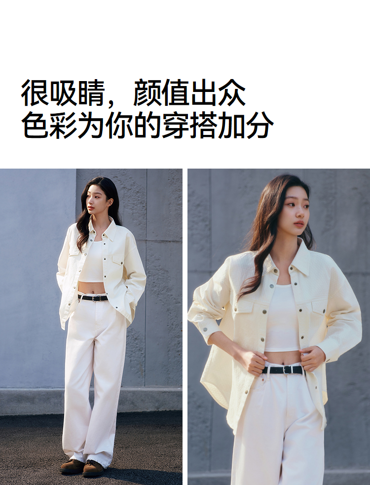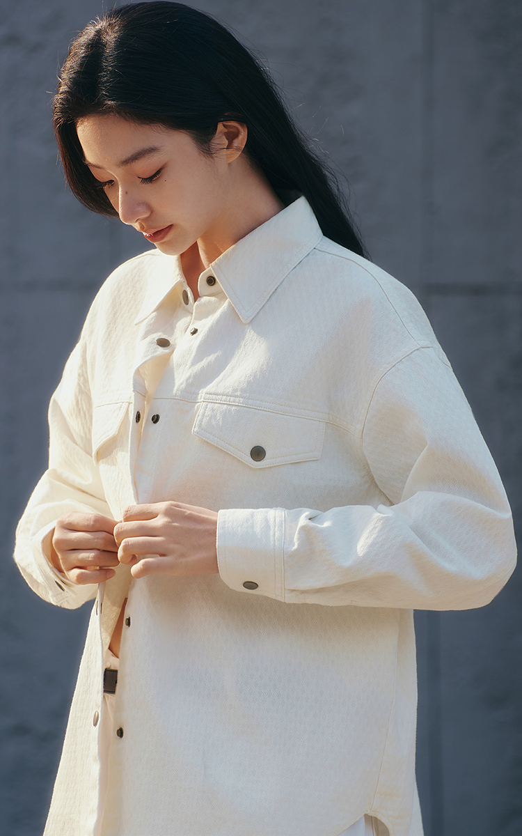 森马长袖衬衫女春中长款菱形格纯棉oversize白色提花肌理通勤衬衣