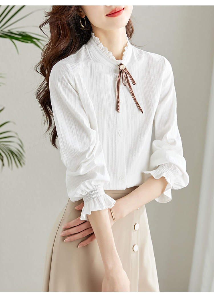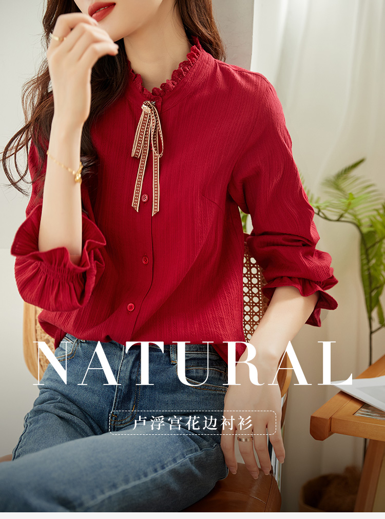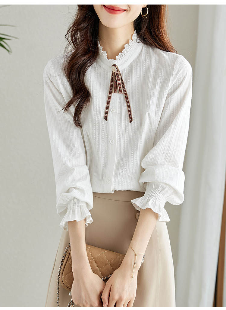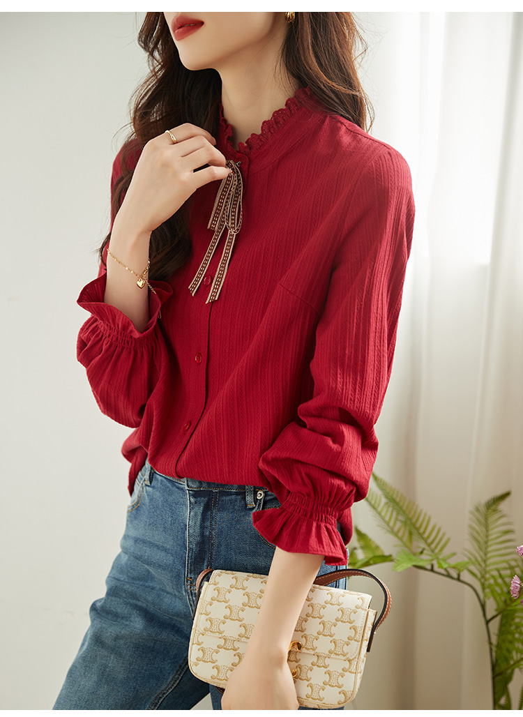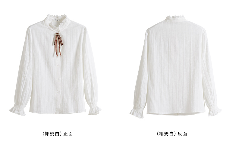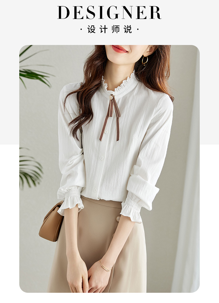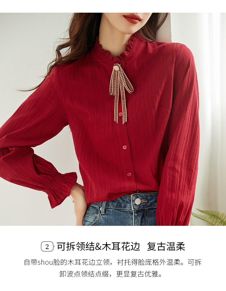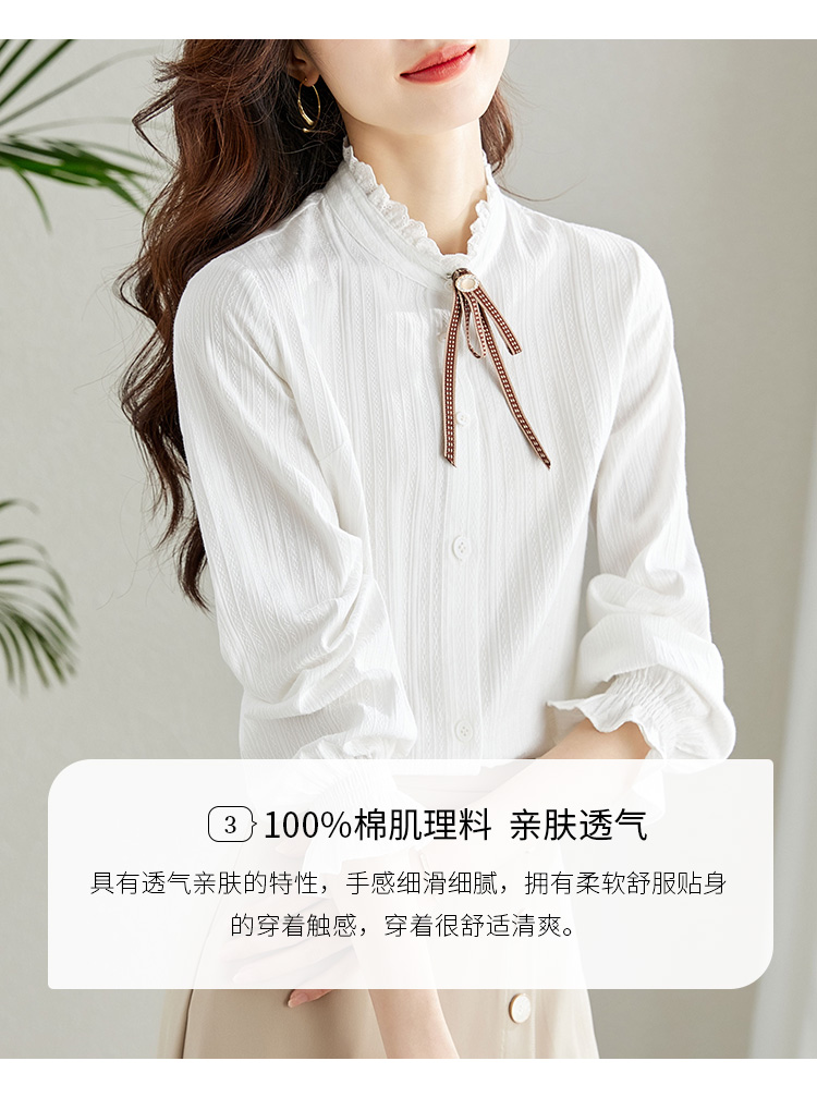【专属特价】熙世界纯棉肌理衬衫设计感小众法式复古木耳边立领秋装上衣女新款