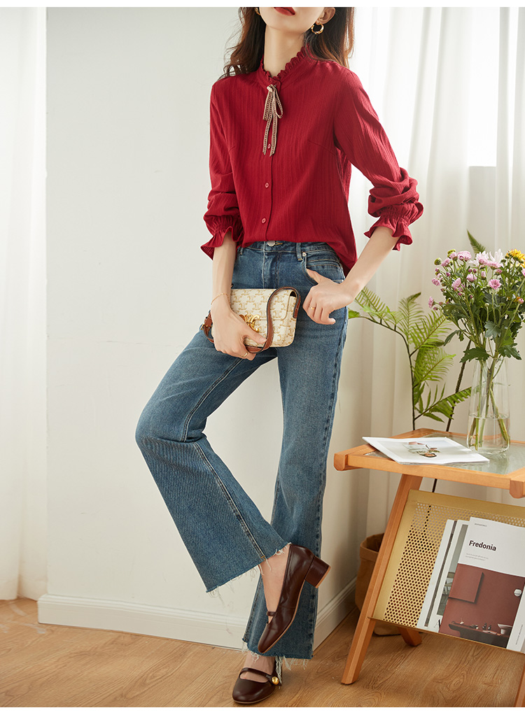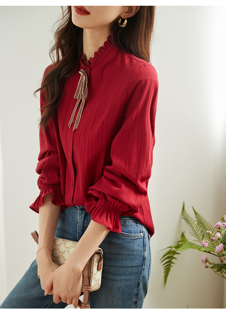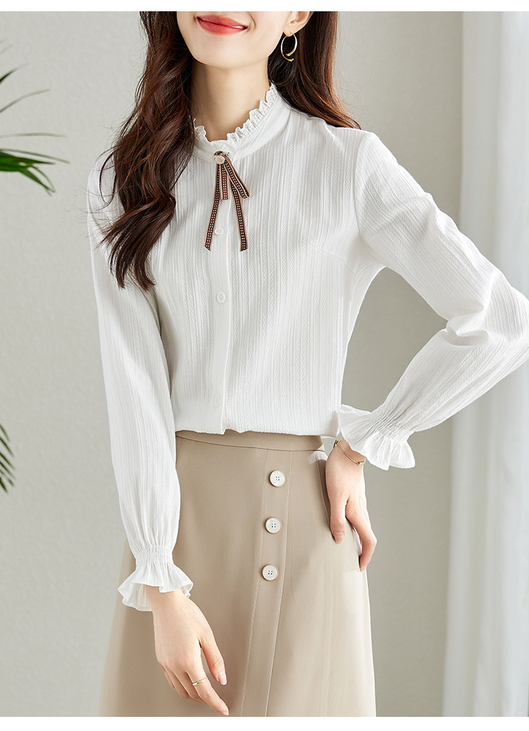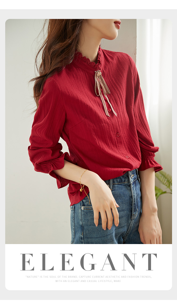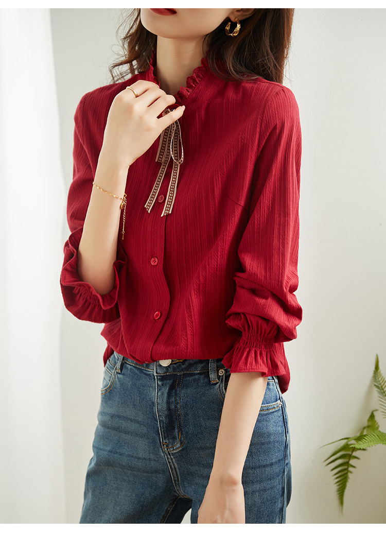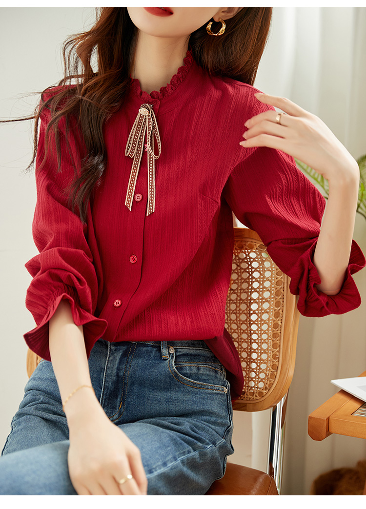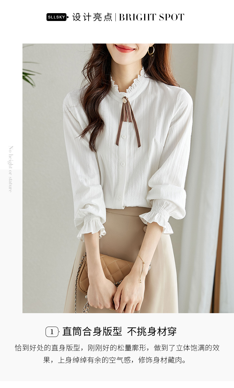 【专属特价】熙世界纯棉肌理衬衫设计感小众法式复古木耳边立领秋装上衣女新款