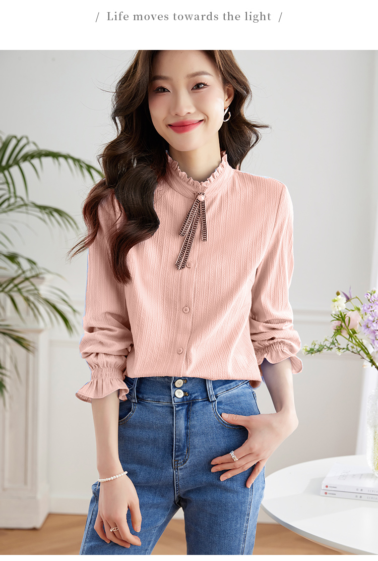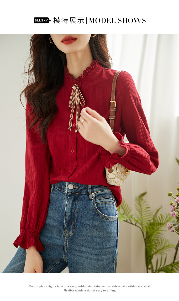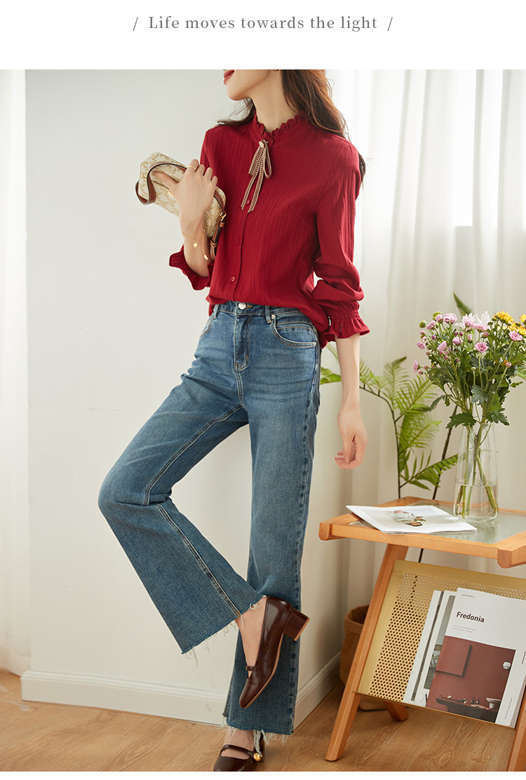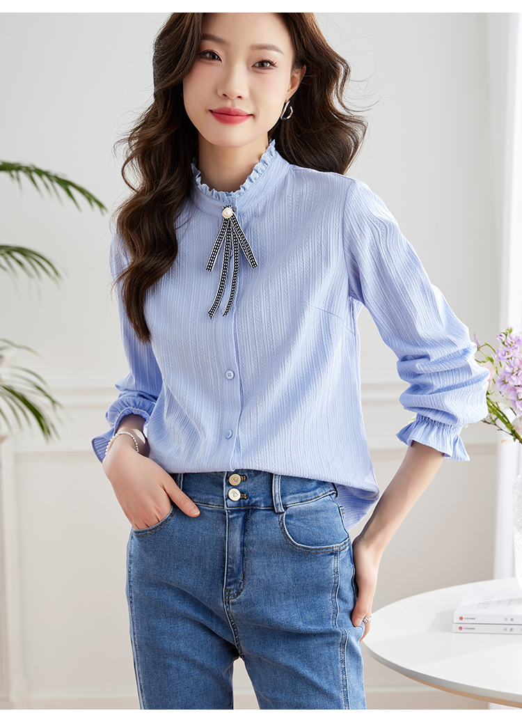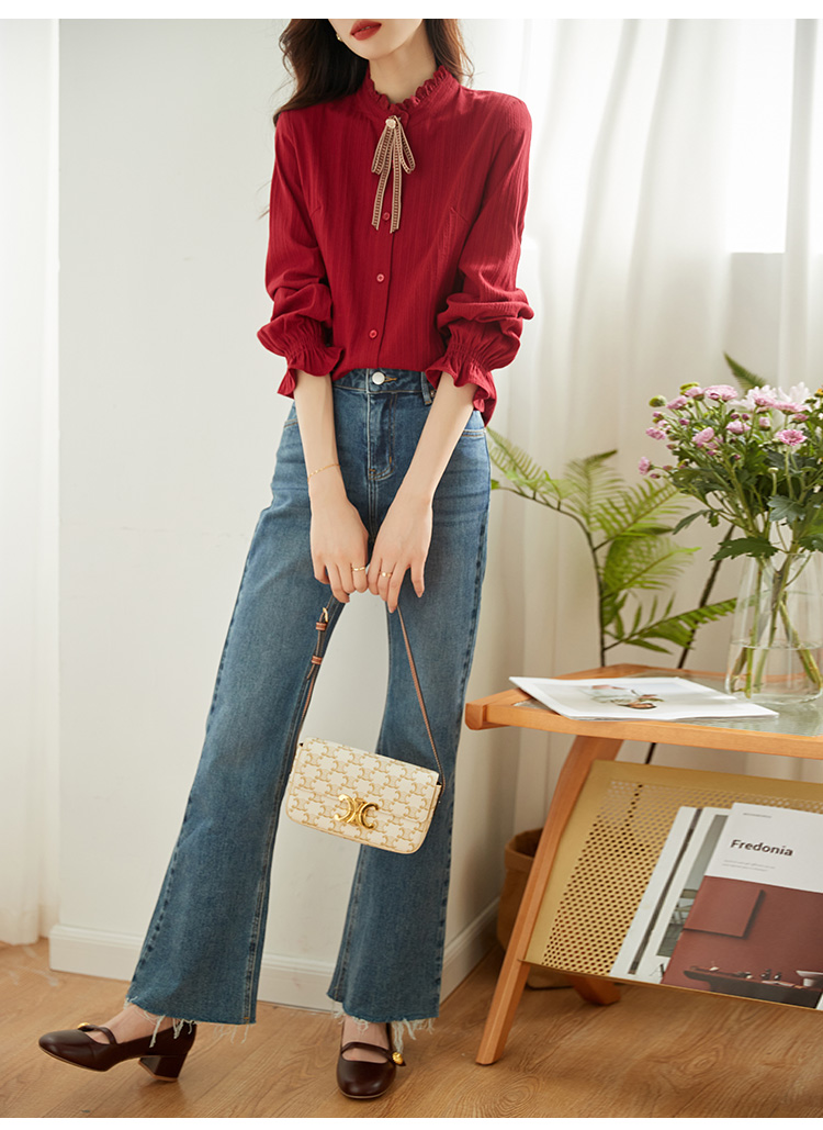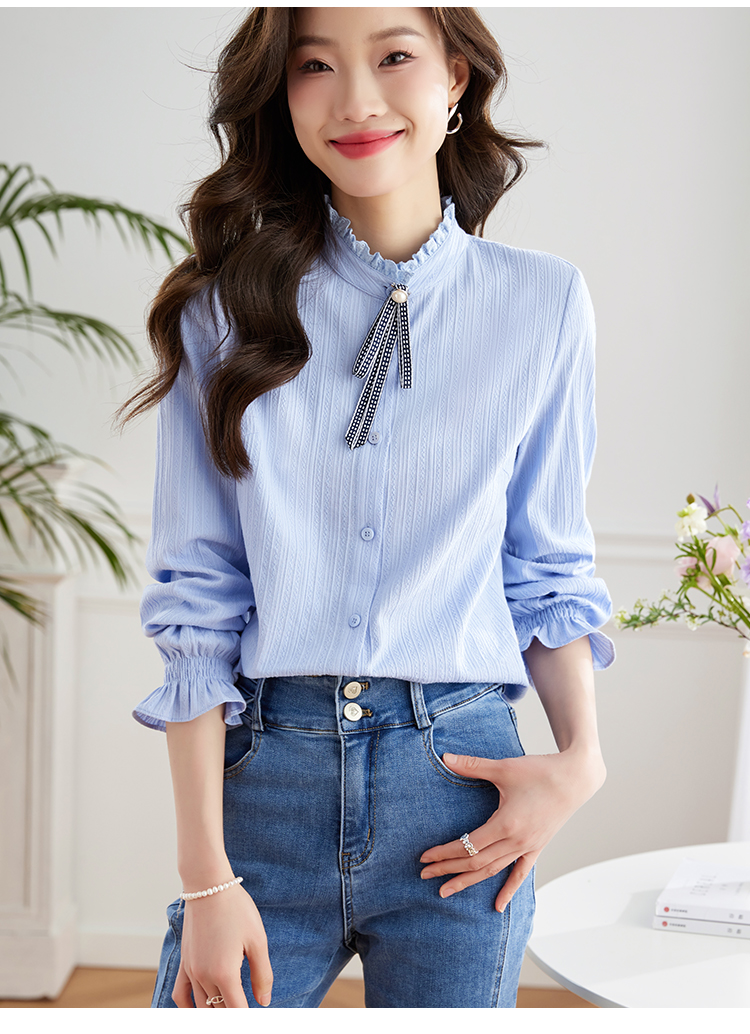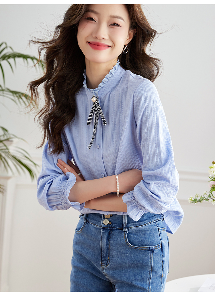 【专属特价】熙世界纯棉肌理衬衫设计感小众法式复古木耳边立领秋装上衣女新款