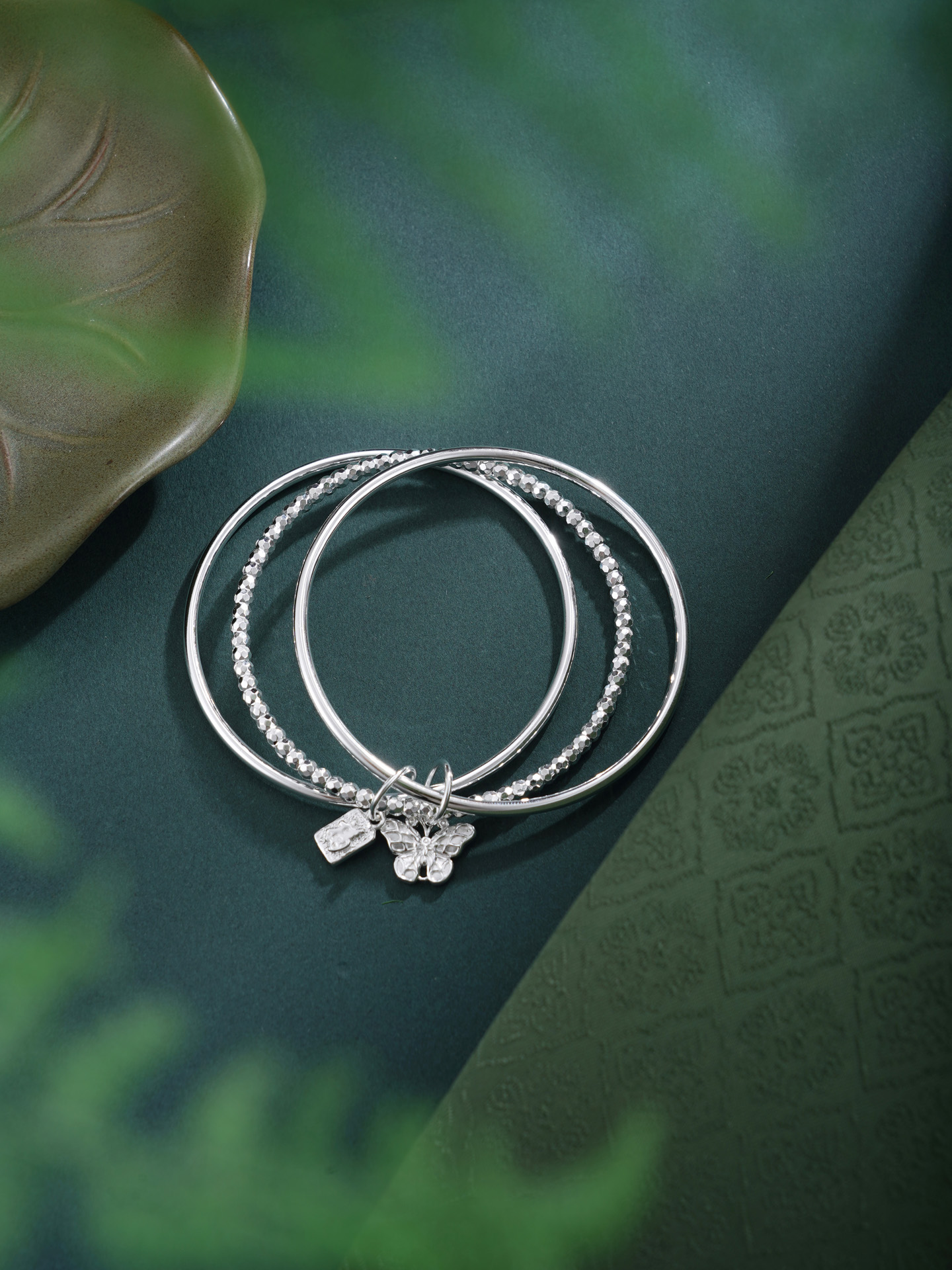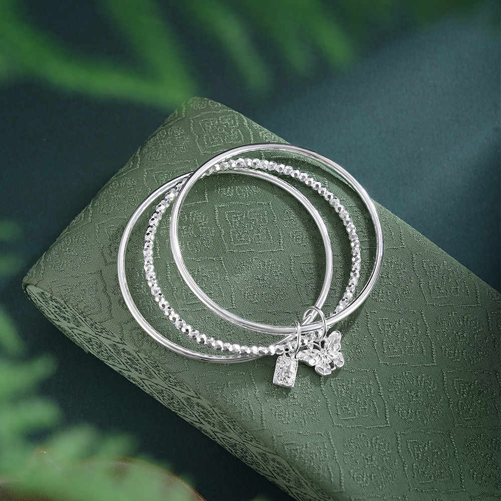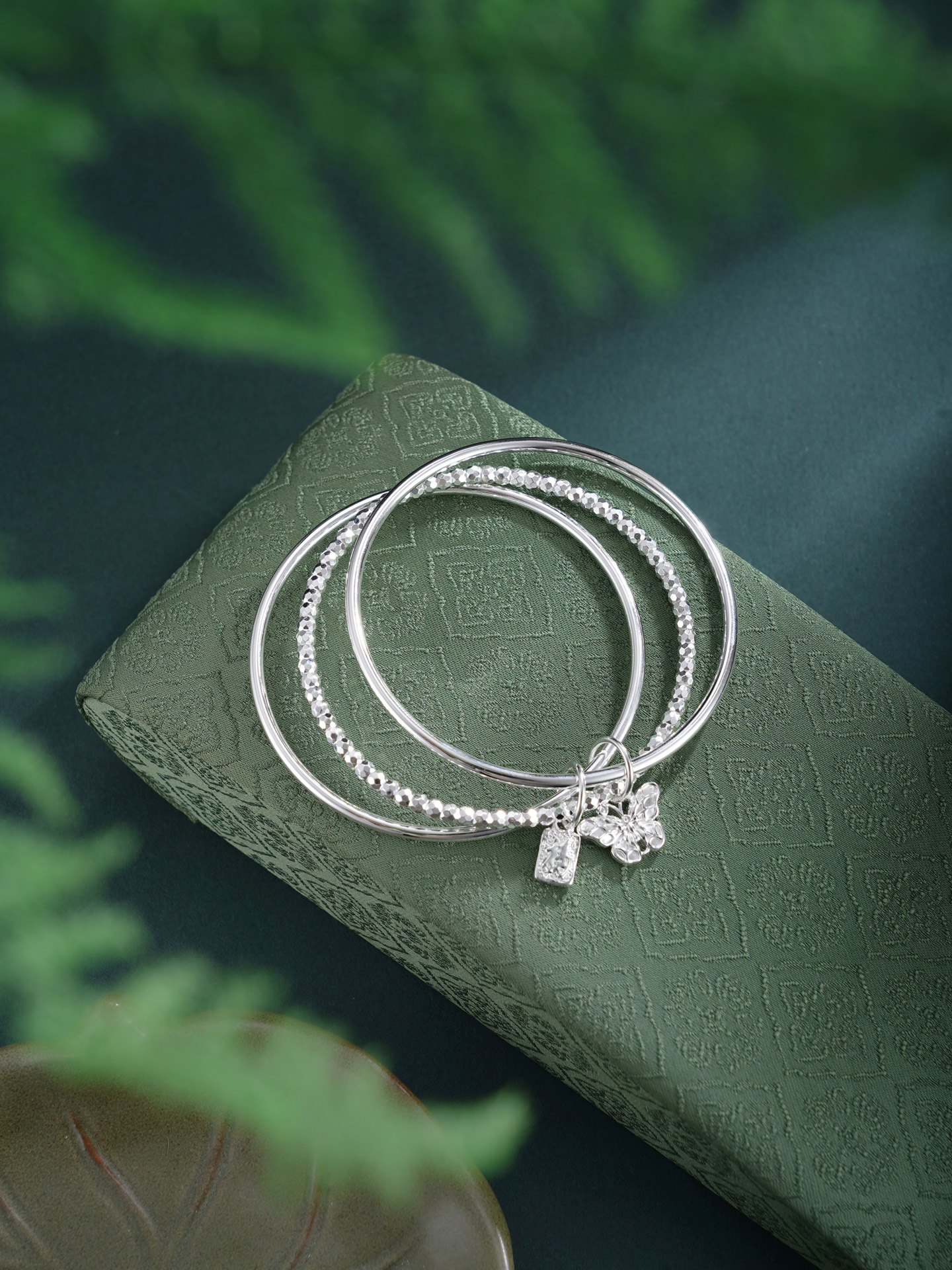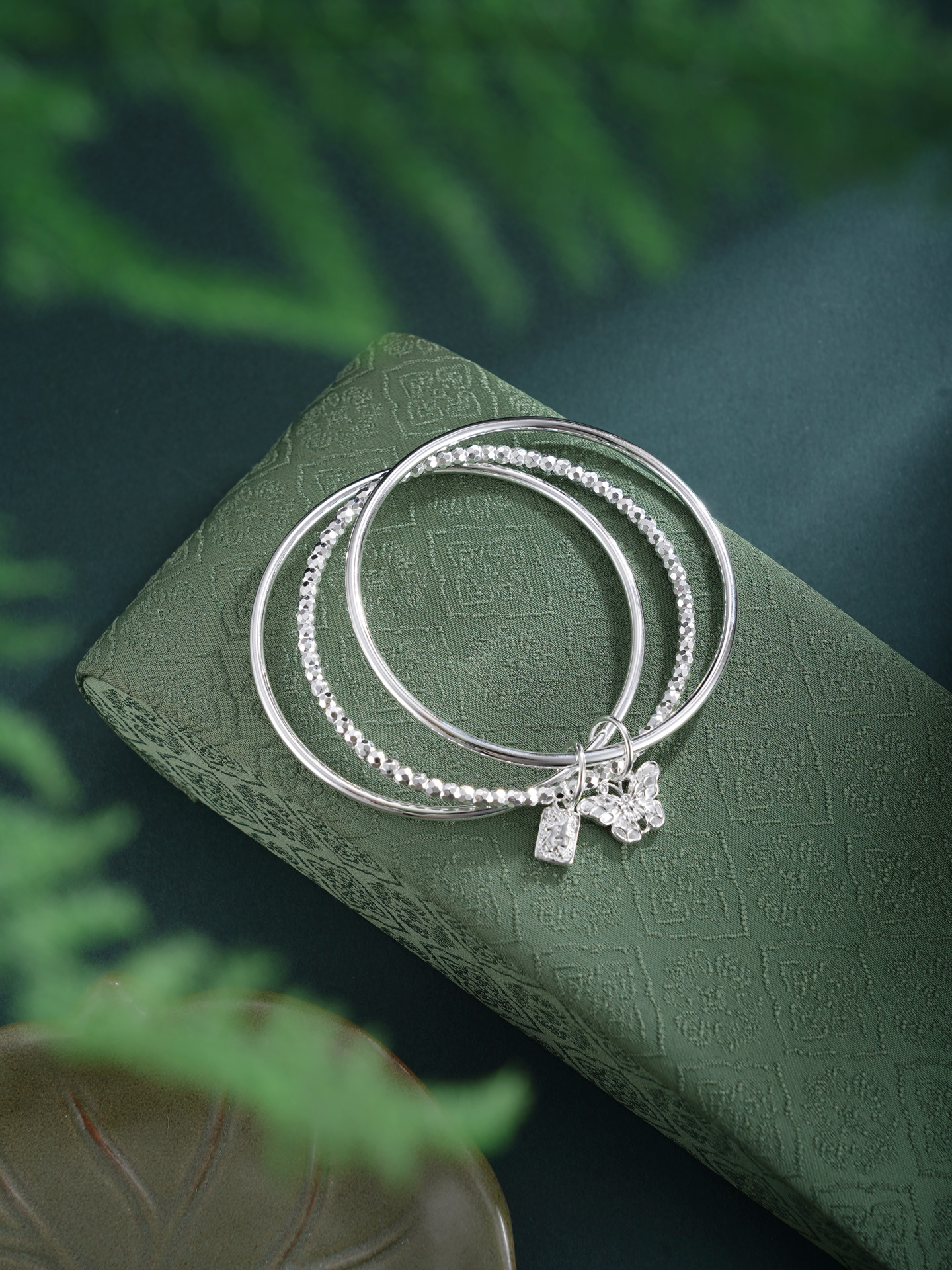 【寓意】:纯银三圈手镯,缀以灵动蝴蝶坠饰。三圈环环相扣,象征生命轮回与缘分绵延;蝴蝶翩跹,寓意蜕变与新生。寓意时光流转,福气常伴。