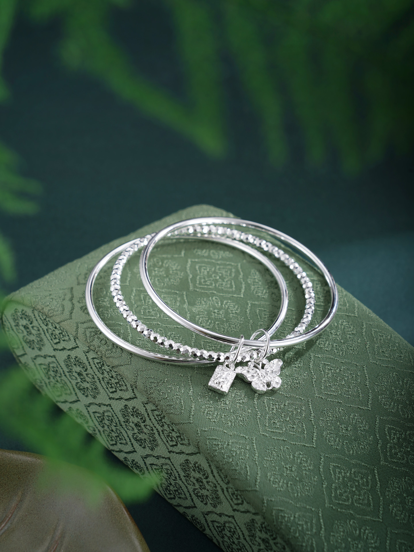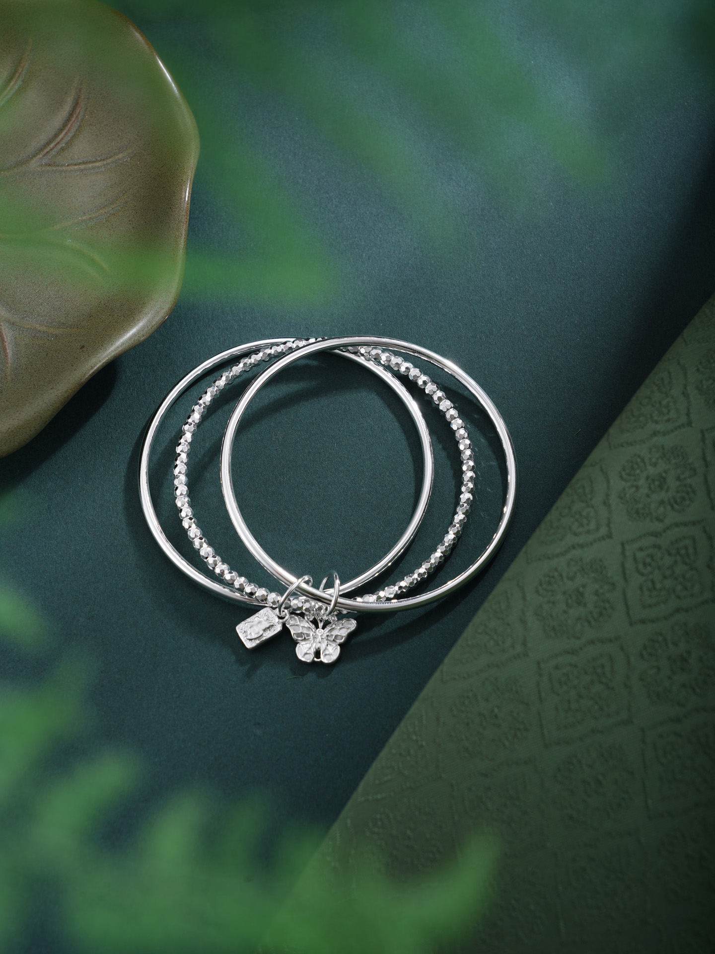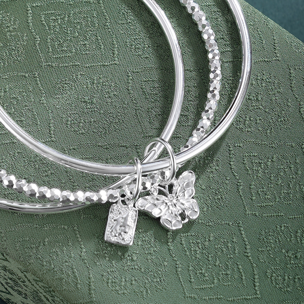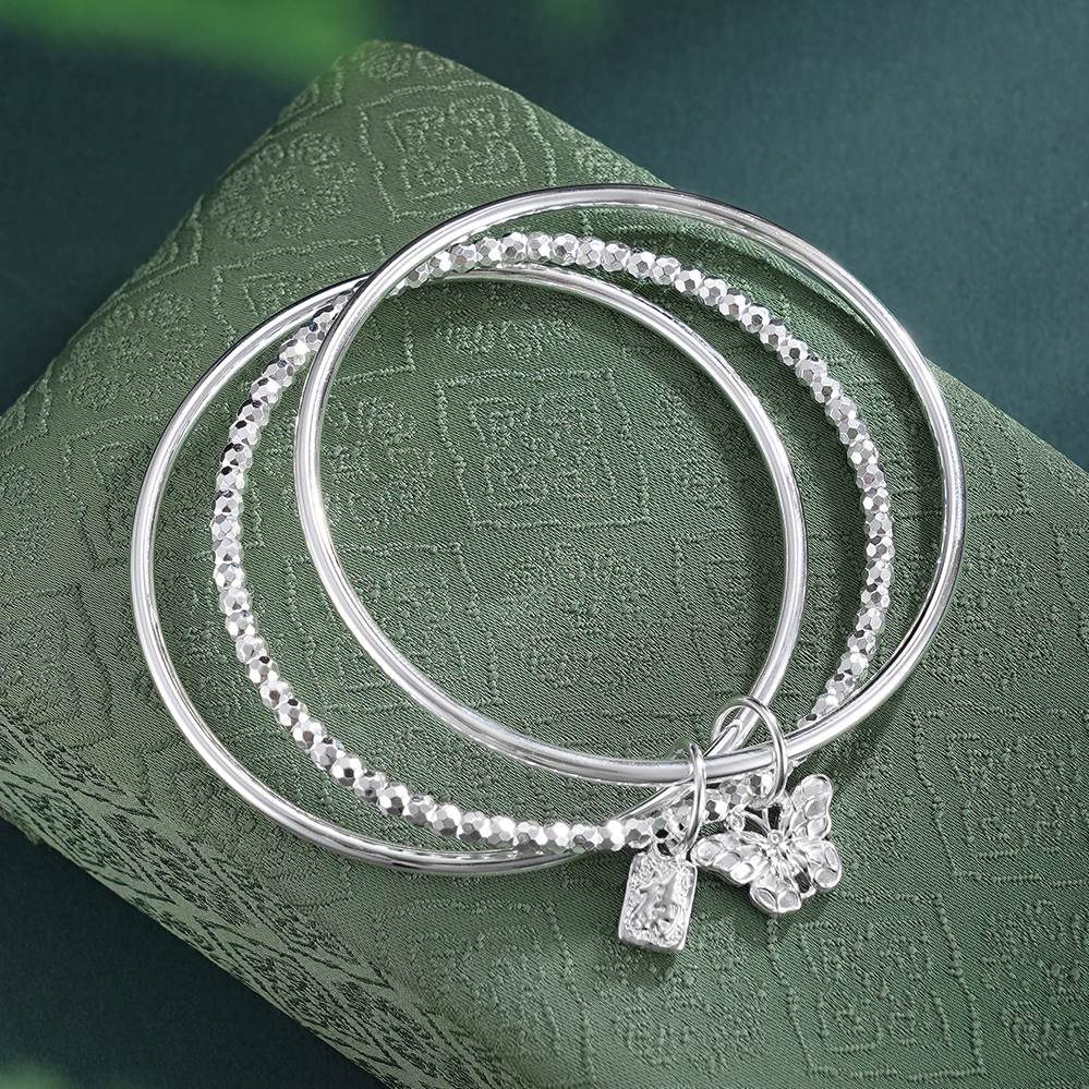 【寓意】:纯银三圈手镯,缀以灵动蝴蝶坠饰。三圈环环相扣,象征生命轮回与缘分绵延;蝴蝶翩跹,寓意蜕变与新生。寓意时光流转,福气常伴。