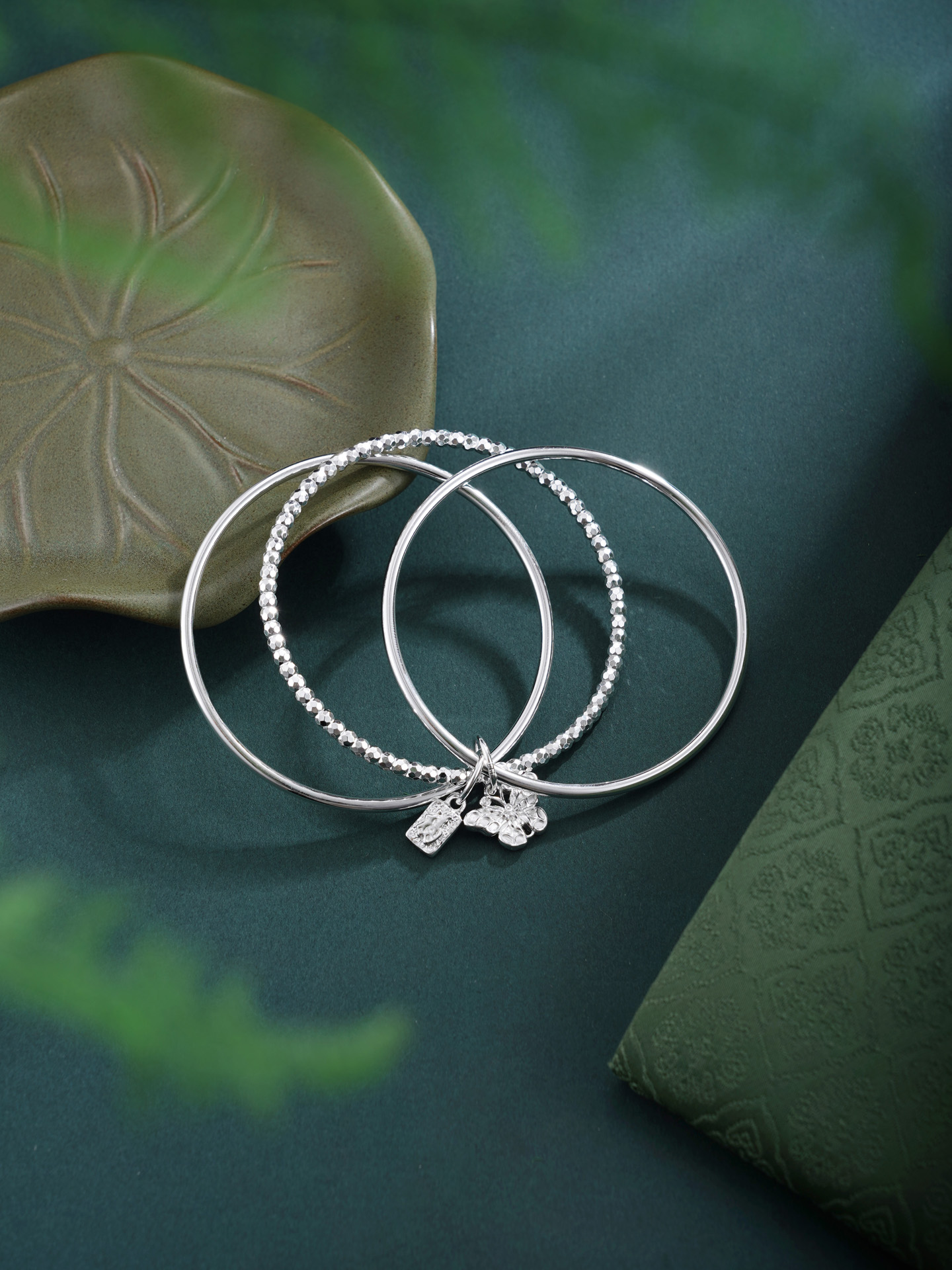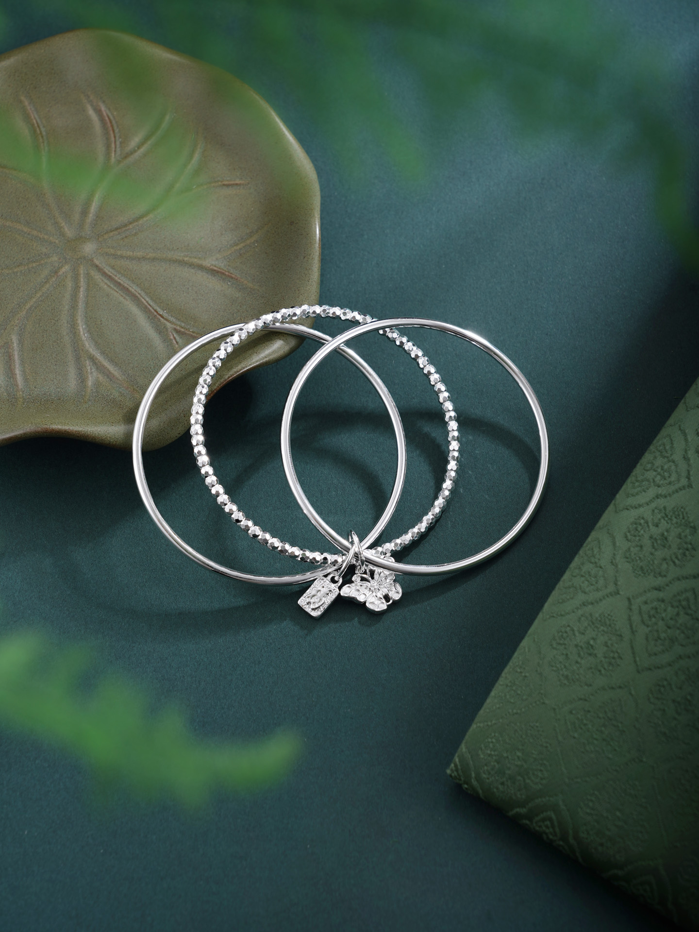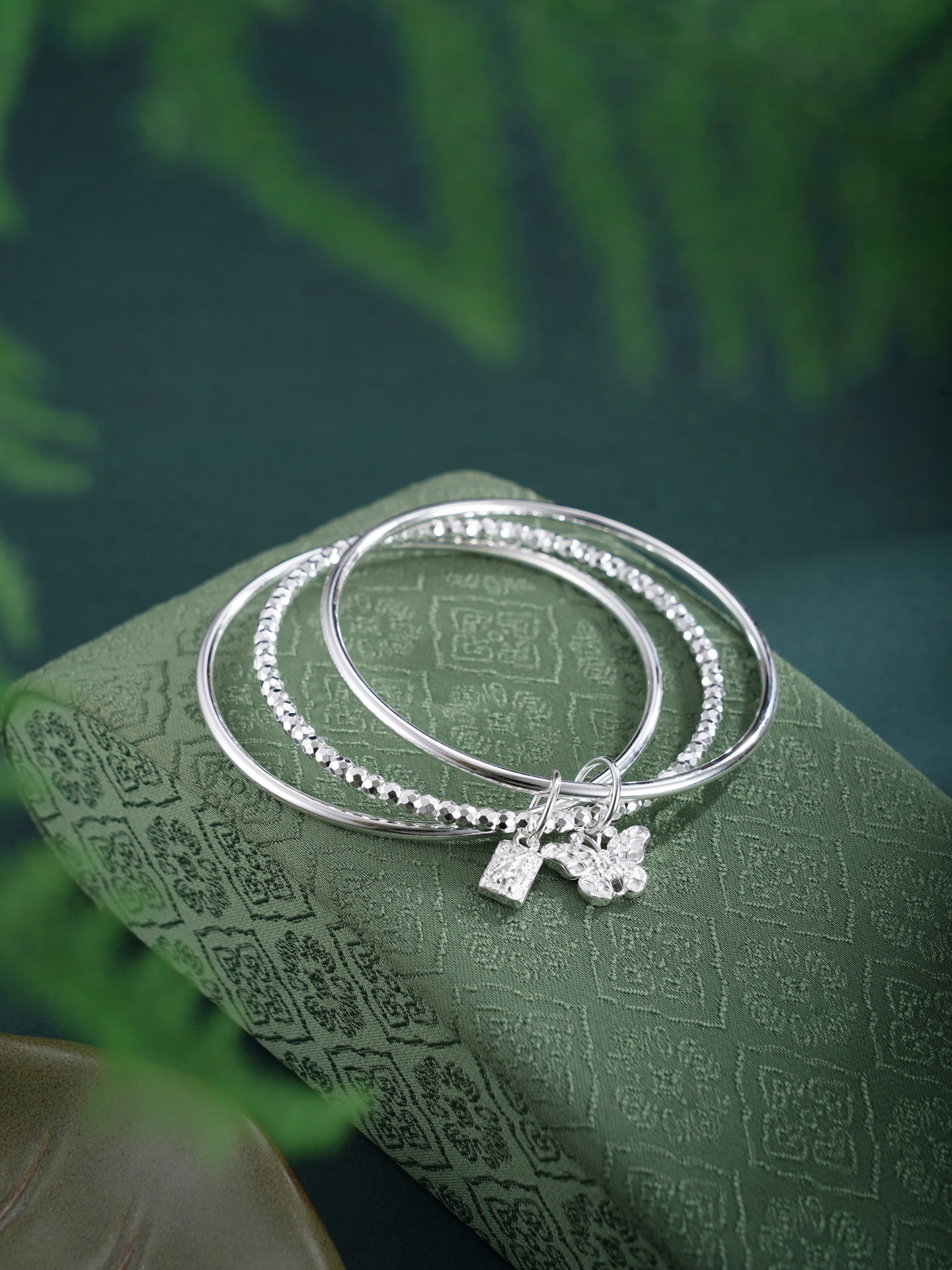 【寓意】:纯银三圈手镯,缀以灵动蝴蝶坠饰。三圈环环相扣,象征生命轮回与缘分绵延;蝴蝶翩跹,寓意蜕变与新生。寓意时光流转,福气常伴。