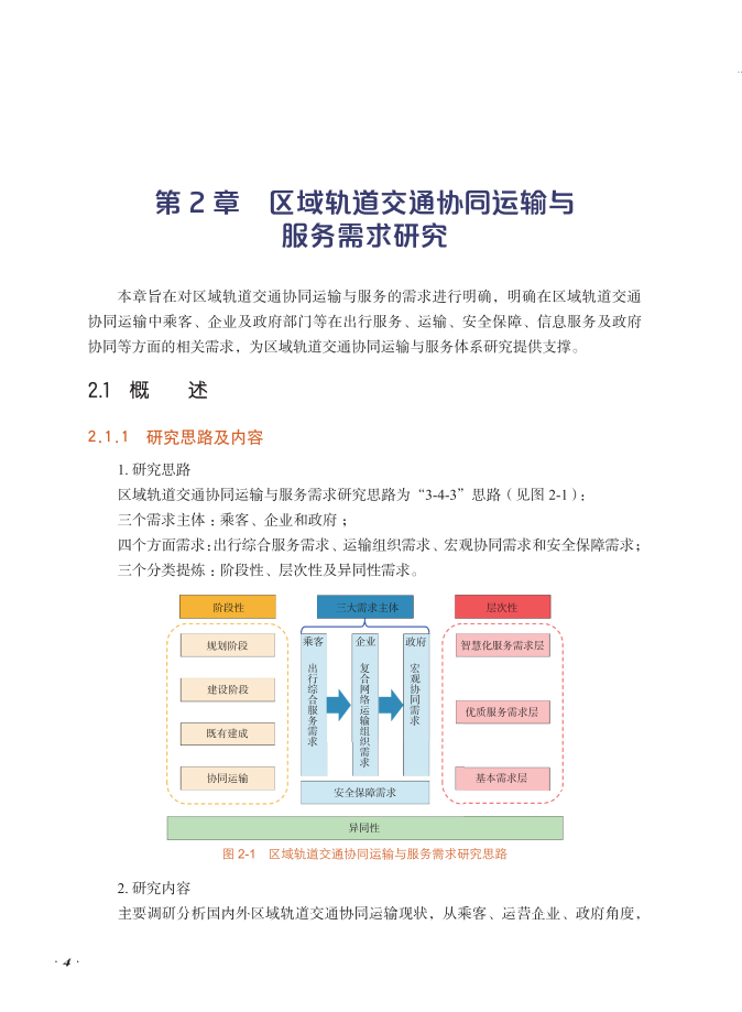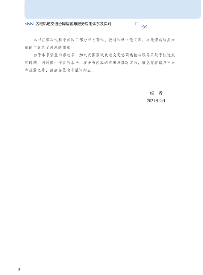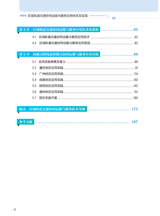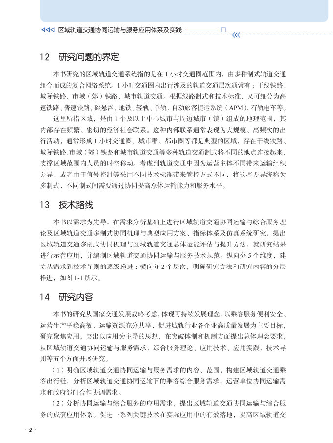 本书的研究成果可作为我国区域轨道交通建设的重要支撑。在规划层面,涉及线网规划、客流分析、区域发展、资源共享等多个方面;在标准方面,涉及规划设计、系统装备、运营管理等方面的规范指导;在应用层面,涉及协同运输组织、综合安全保障、智能信息服务等技术服务领域。后续可从学术上、技术上和应用实践上进行深化研究,对区域轨道交通技术导则进行细化完善,以指导我国城轨交通网络化有序、规范发展,使研究成果尽快转化为生产力,在城市轨道交通建设中发挥更大作用。