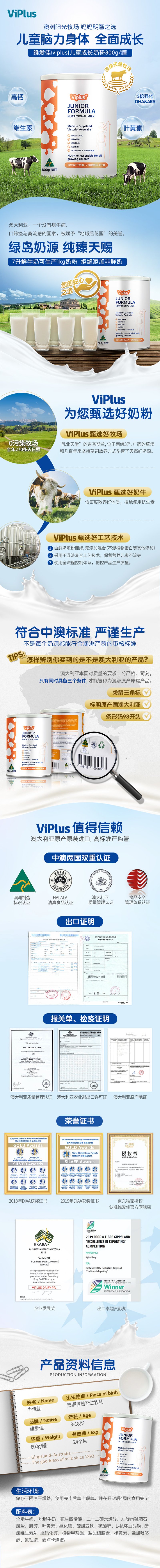 【儿童成长】澳洲进Viplus维爱佳儿童成长配方奶粉3倍强化DHAARA青少年学生800g/罐【维爱佳】