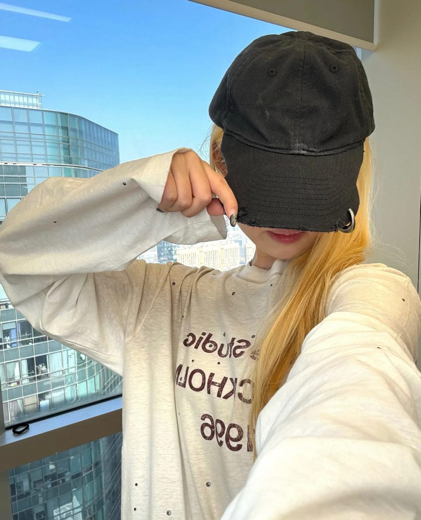 历经茶染水洗工艺,把胸前的部分做出脏脏的感觉,就像咖色字母晕染出来的一样,与下半部分呈现了渐变的效果,让衣服有自然微透的复古做旧风格。宽松长袖夸张长袖,打造袖长过裆的效果,显身材比例好。