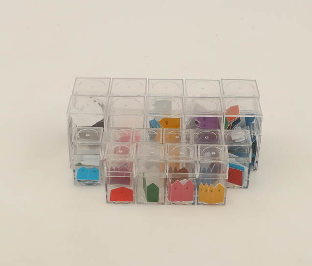 教具构成:收纳容器20个。搭配串珠棚使用的珠子数数的标签。材质:盒子亚克力,内容PVC。包装方式:纸盒。包装尺寸:23*10*11cm
