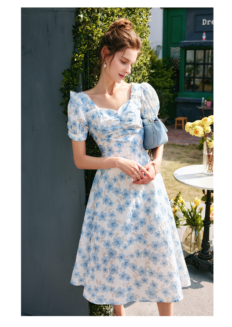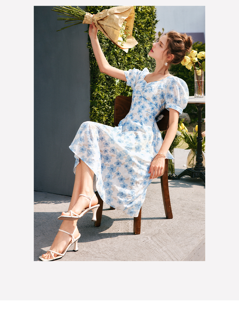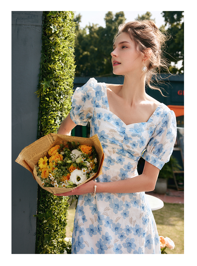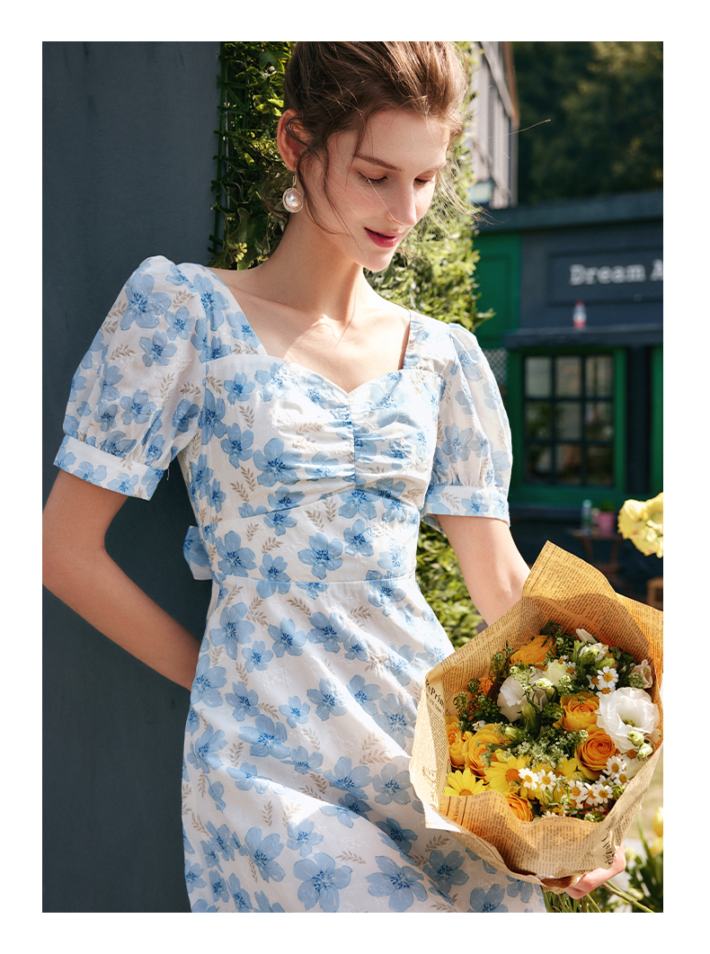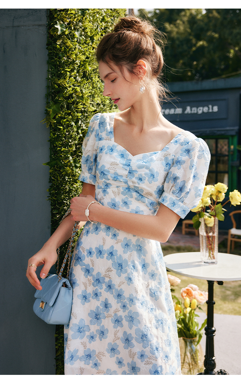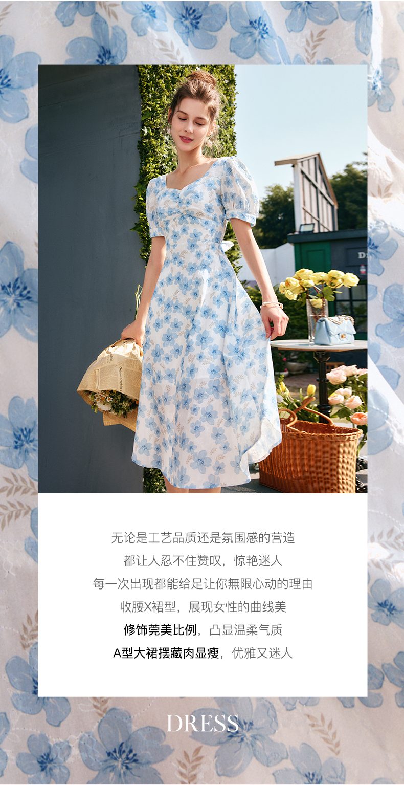 欧芮儿碎花连衣裙女夏季2022年新款收腰时尚法式方领泡泡袖茶歇裙
