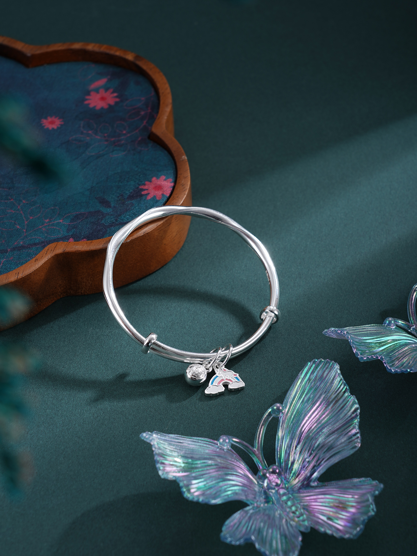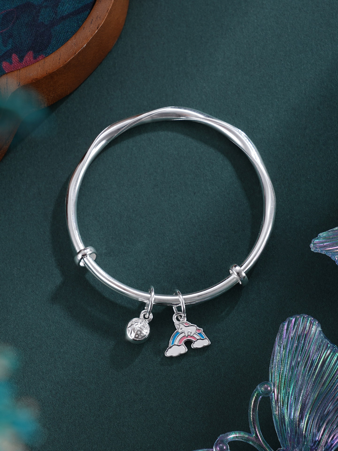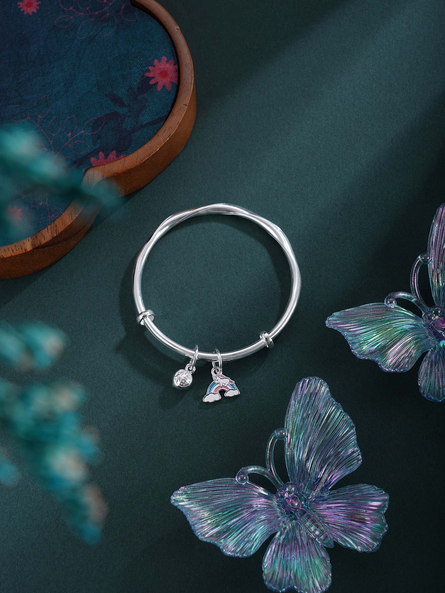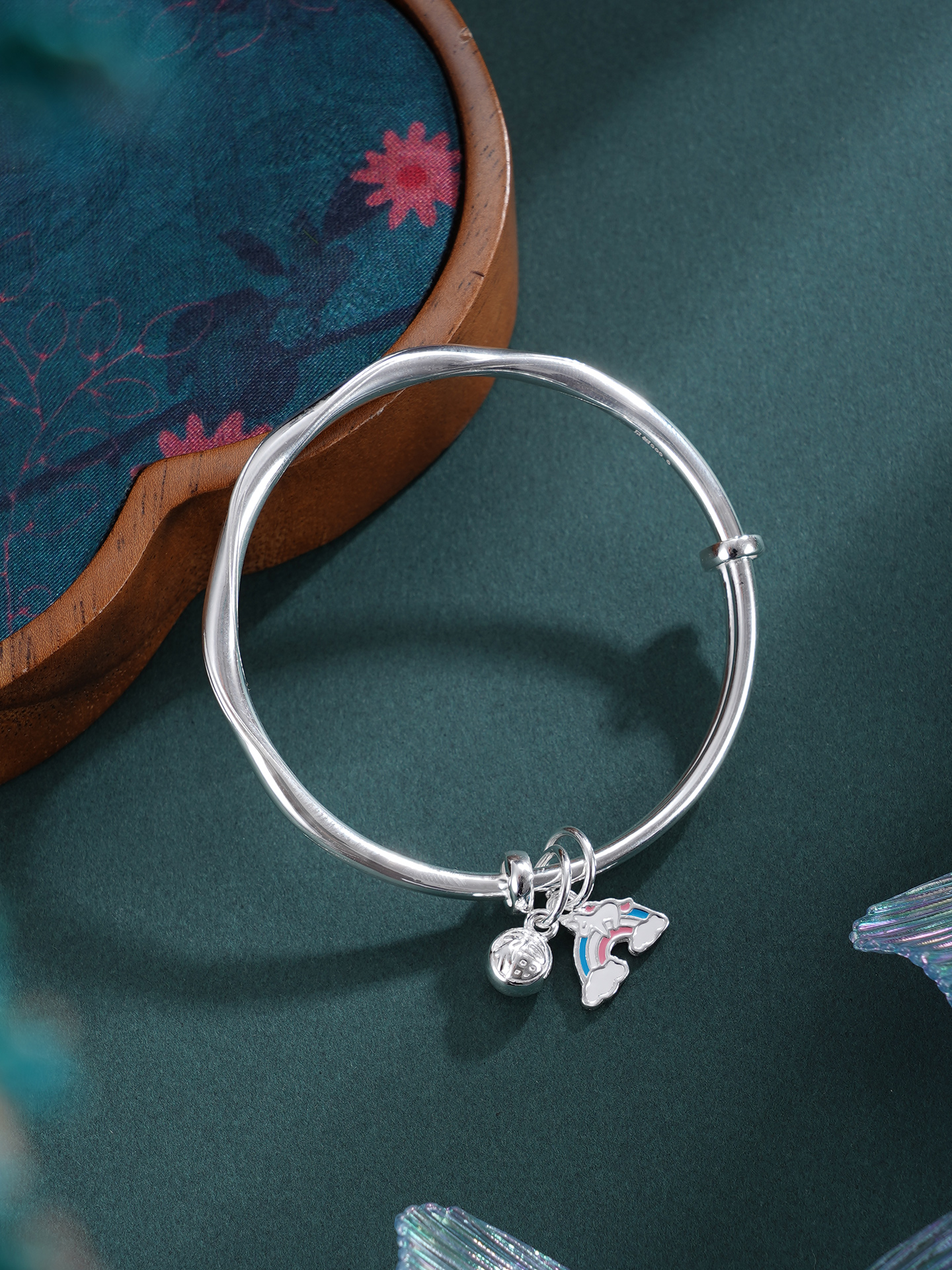 【寓意】:作品巧妙汲取“小马宝莉”灵动神韵,以纯银雕琢而成。“彩虹小马”配以福字铃铛,寓意汲取小马宝莉自信勇敢特质,人生道路福泽相随,勇毅向前。