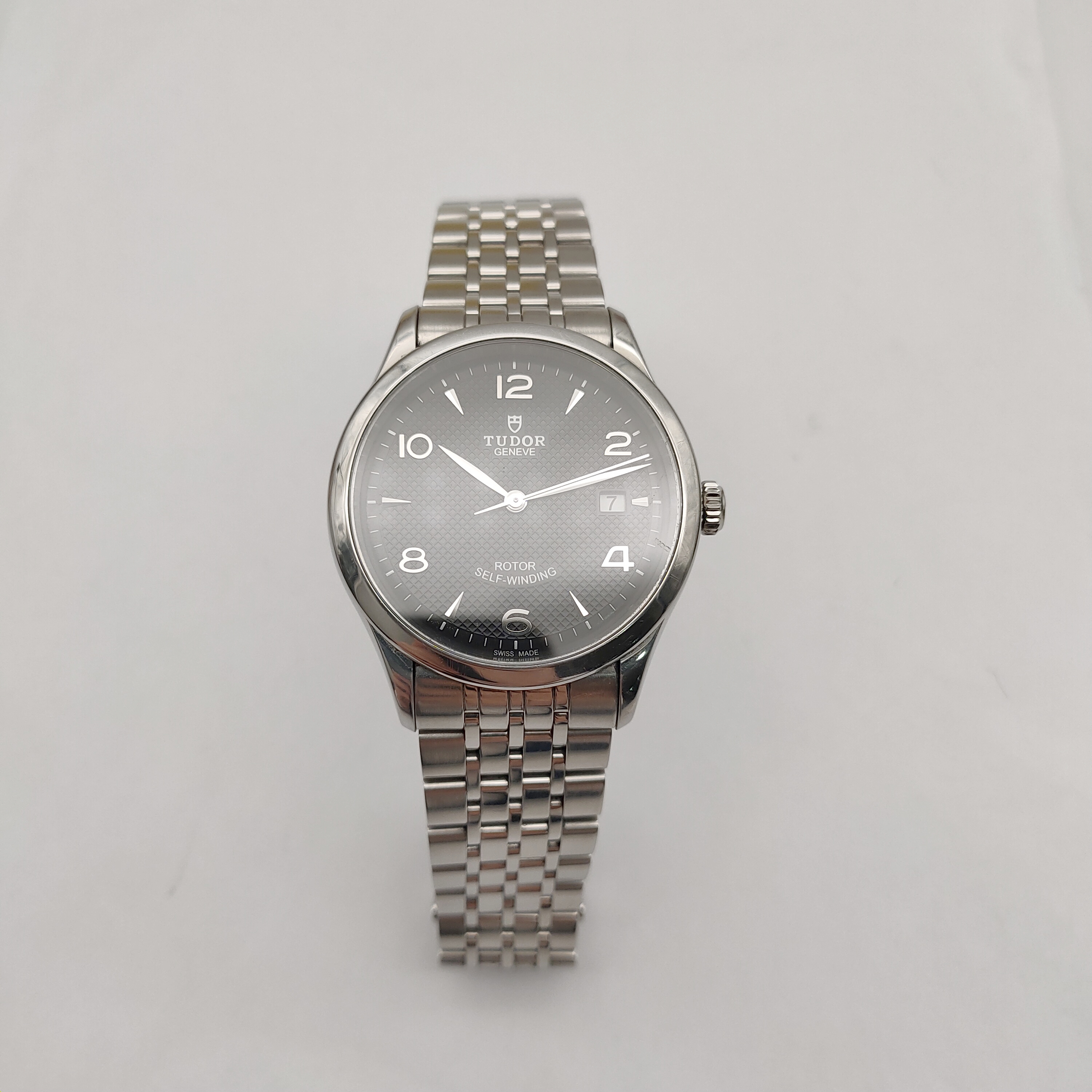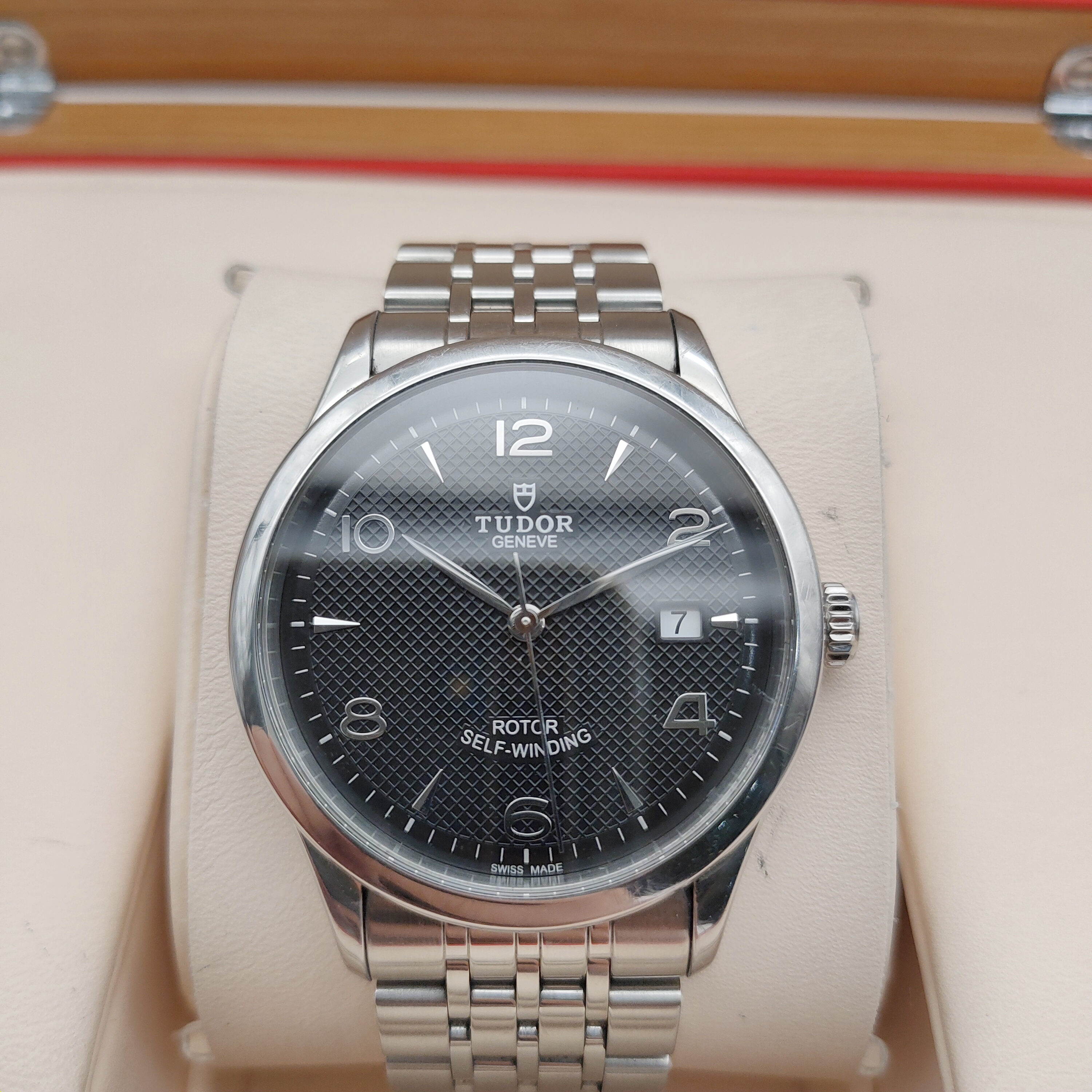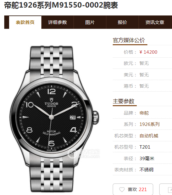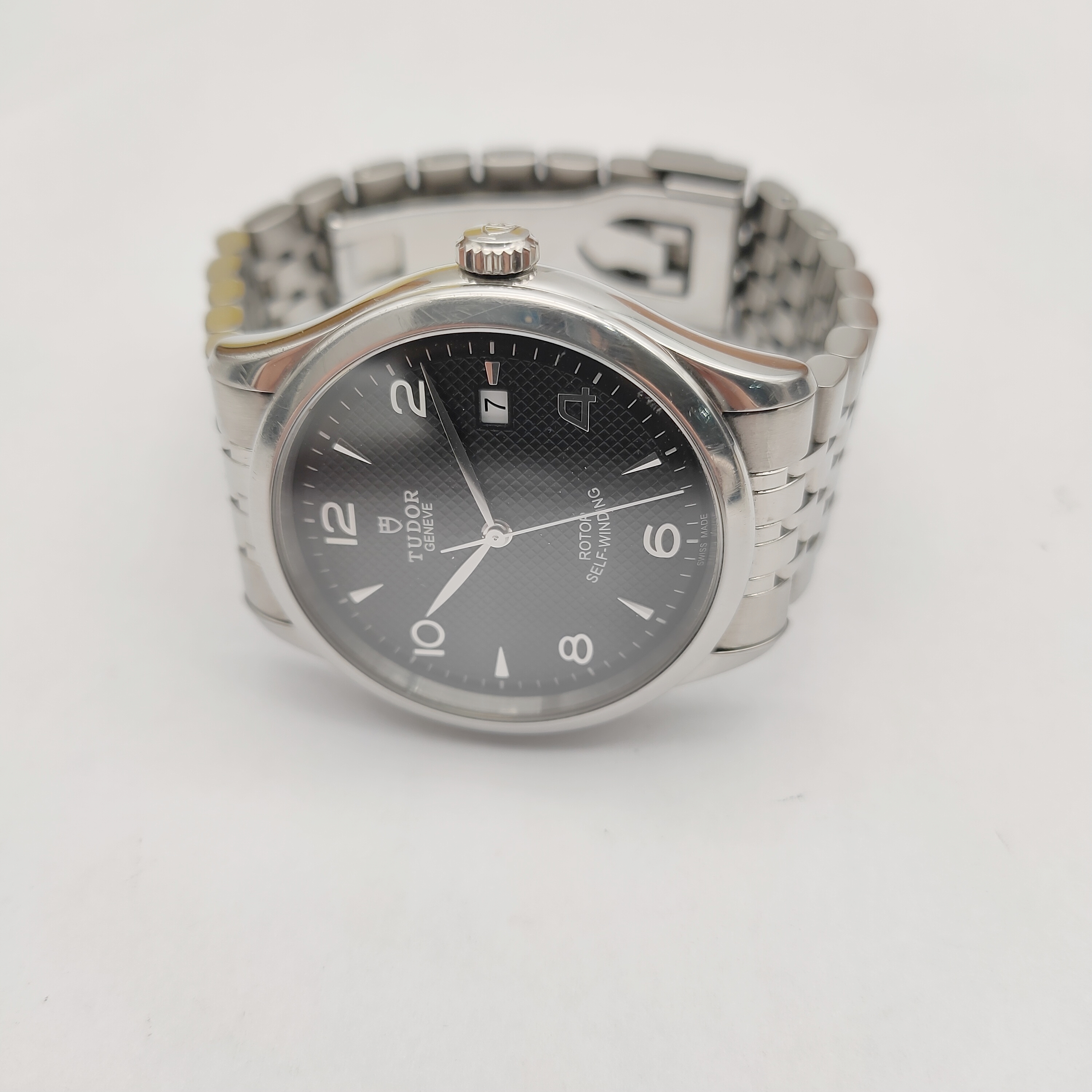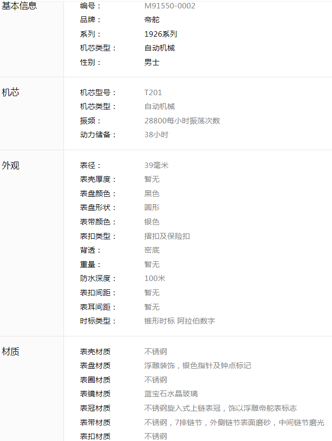 帝舵1926系列M91550-0002男款机械表,39mm表径,黑色浮雕装饰表盘,银色指针,阿拉伯数字刻度,精钢表壳表链,日期显示,9成新,附件保卡吊牌,2018年购买,专柜价14200,现好价