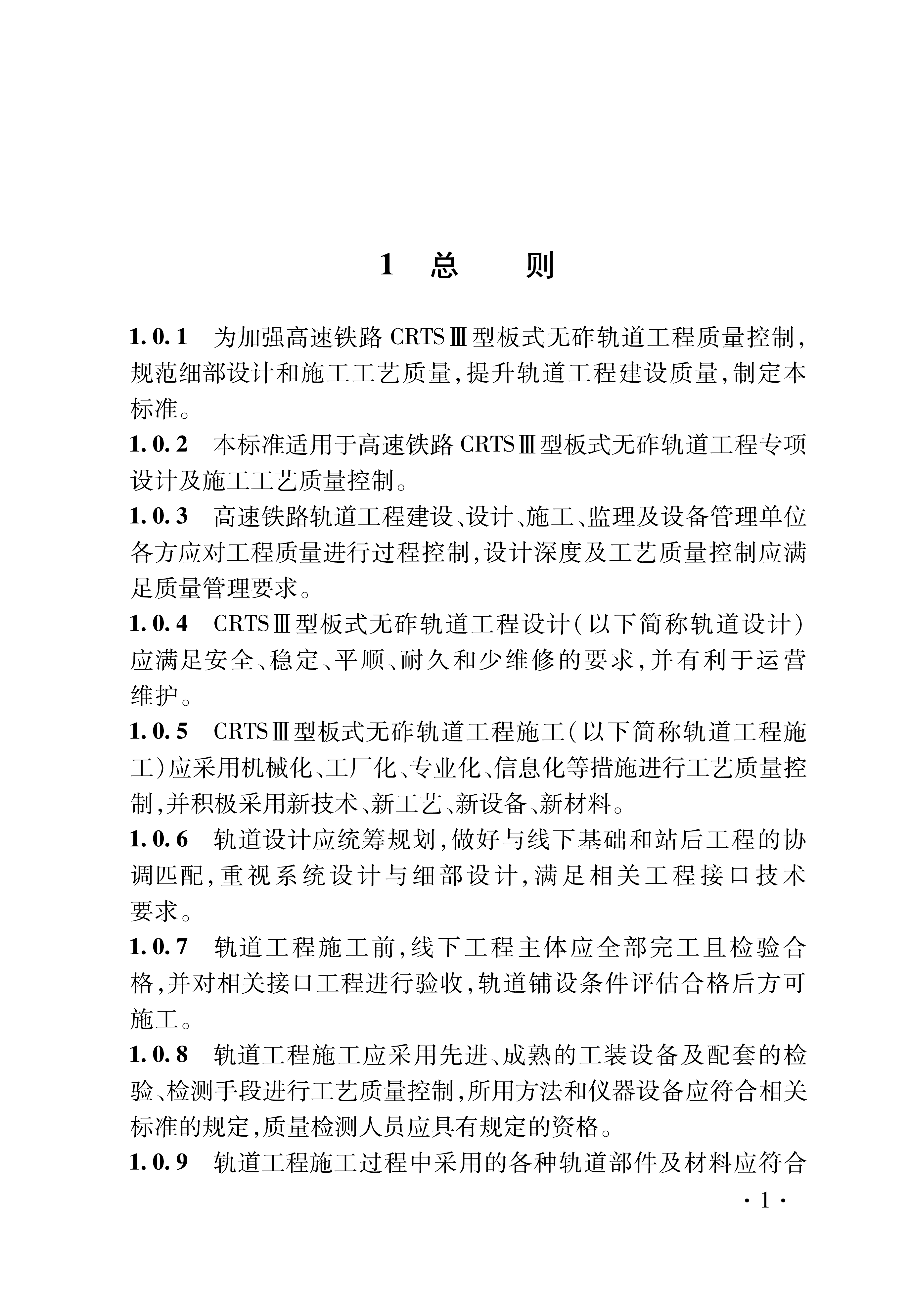 本标准共分9章,主要包括:总则、术语、基本规定、轨道与线下工程的交接、施工控制网、CRTSⅢ型板式无砟轨道设计与施工、轨道结构过渡段、轨道精调、轨道工程信息化等。