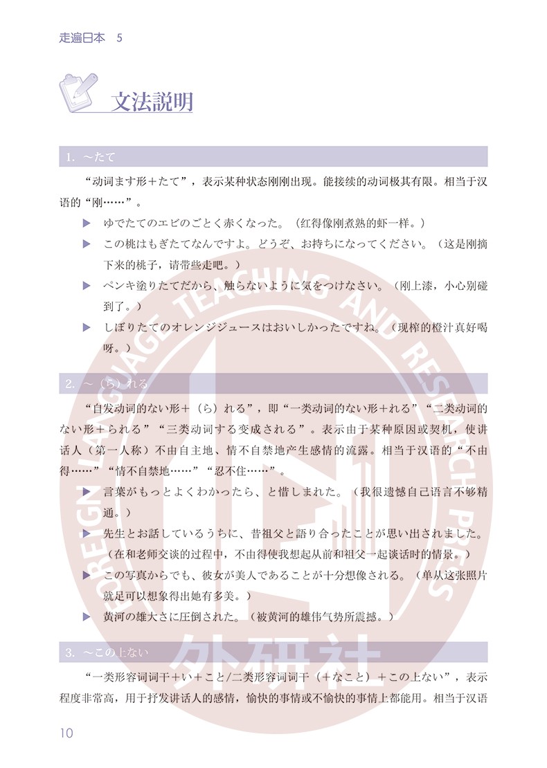 《走遍日本5》为"走遍日本"系列教材的第5册,按照新日本语能力考试N1水平和要求进行编写的。该教材主要以中国留学生在日本的学习和生活为主线,介绍了日本社会方方面面的知识。通过本册的学习,学习者不仅能掌握高级阶段语言知识,更能运用所掌握的知识解决生活、工作中常见的问题,以提高其语言交际能力和实际运用能力。同时学习者还能是很如了解日本的生活习惯、风俗、文化等,为今后的深造、工作和交际奠定基础。