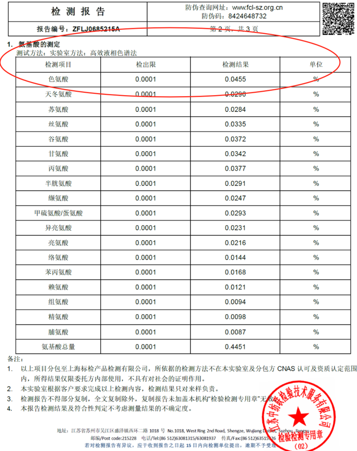 moimoi的丝麻棉纤维是由蚕丝和黄红麻再生后和棉纤维混纺获得,而蚕丝蛋白中天然含有18种氨基酸,同时具有亲肤和护肤的作用。因此可以出具氨基酸报告: