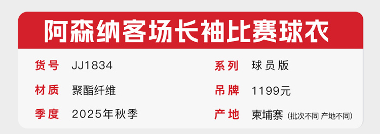 小李子阿迪达斯25/26赛季阿森纳球员版客场长袖球衣成人JJ1834