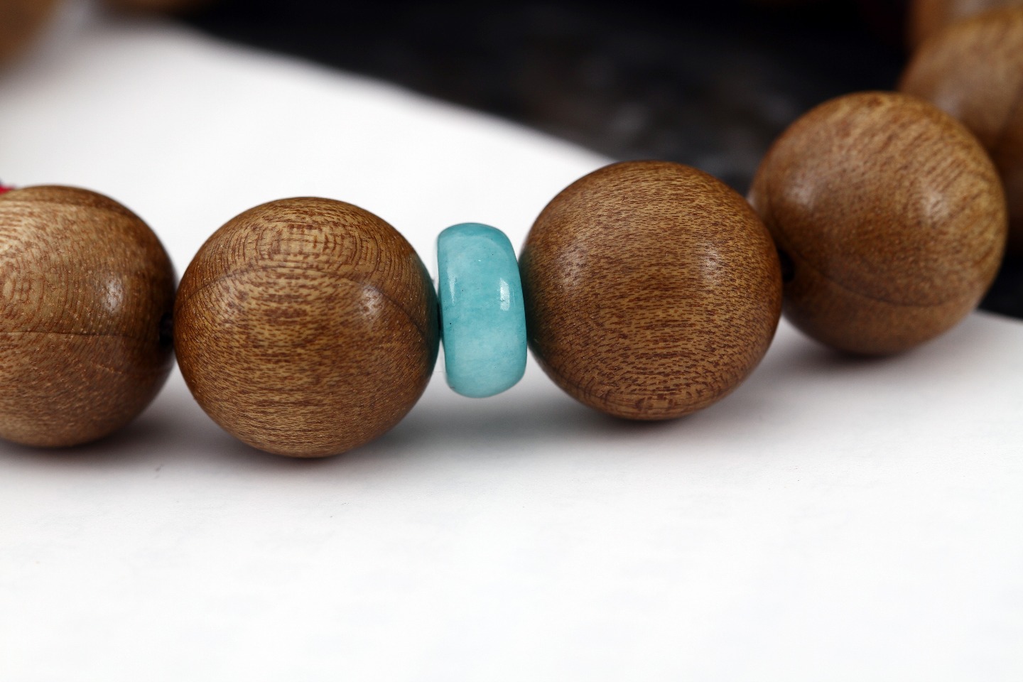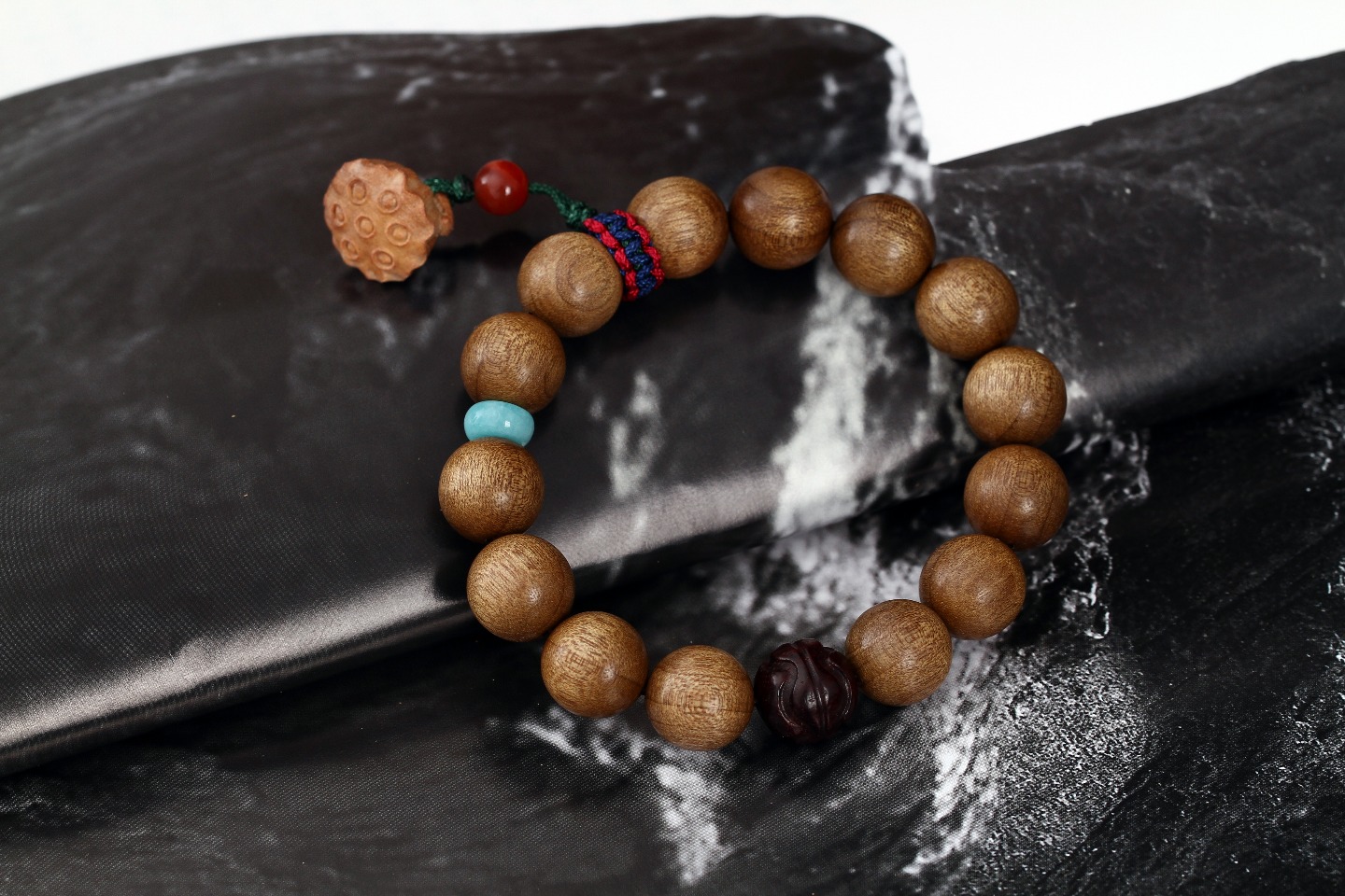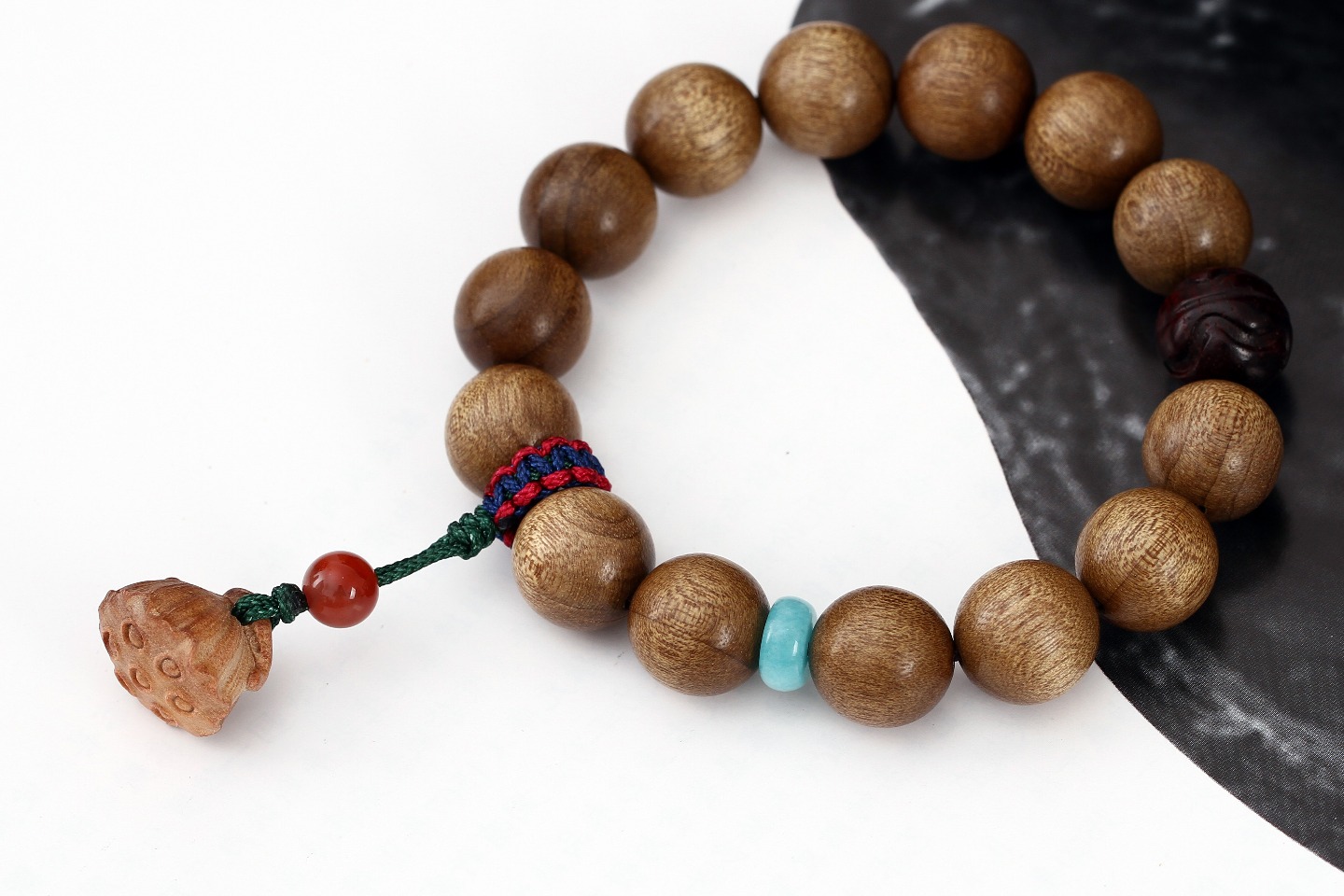 搭配:拆房老料金丝楠木为主,搭配紫檀彩球及老山莲蓬,配饰高品质原矿南红,天河石、大简若繁