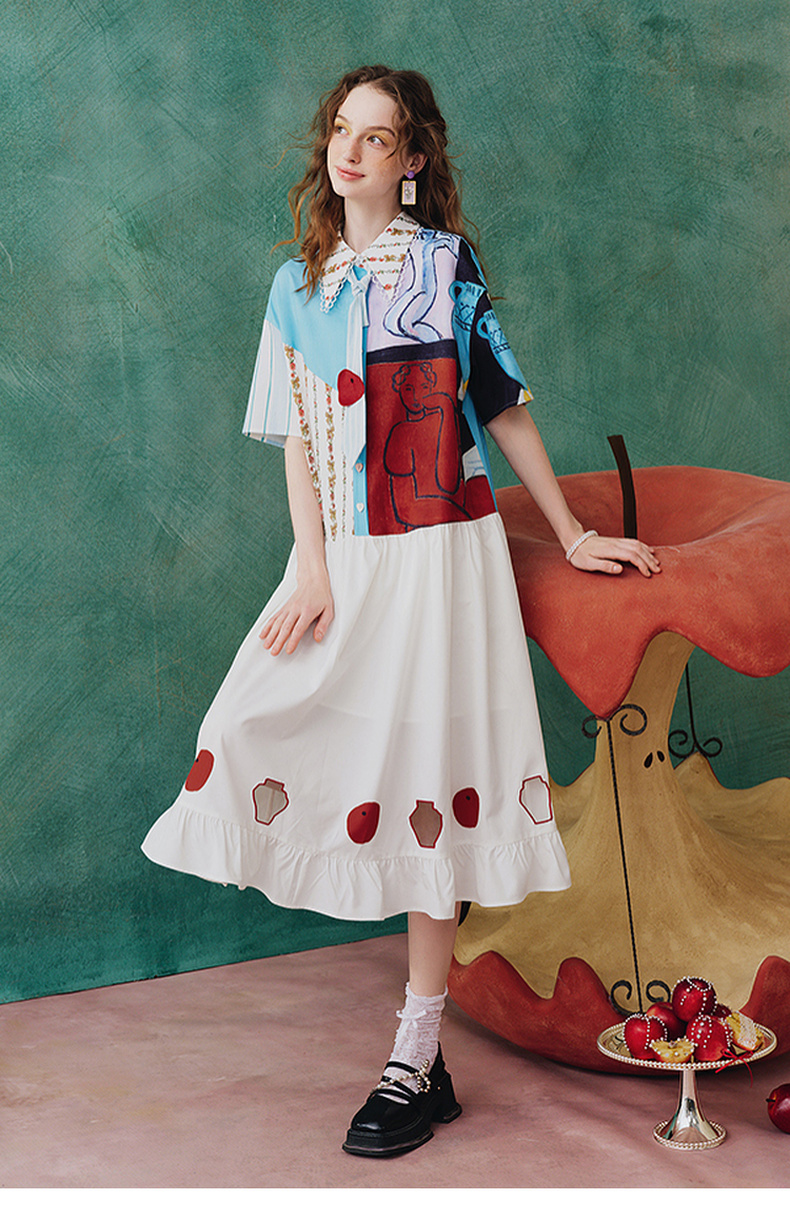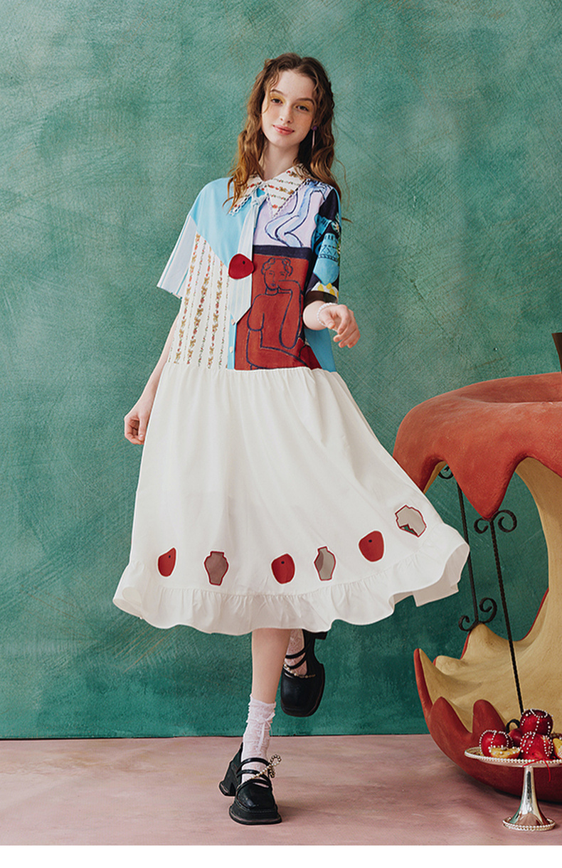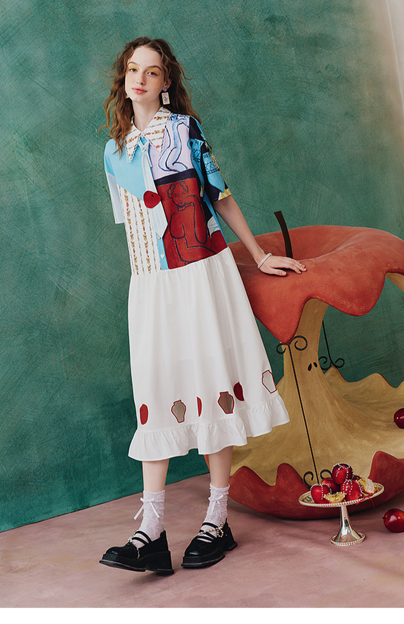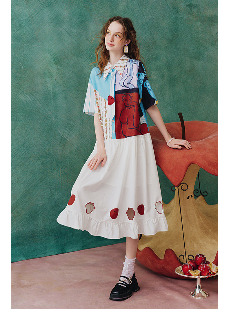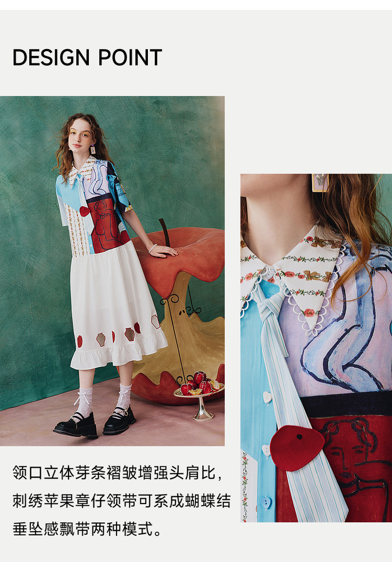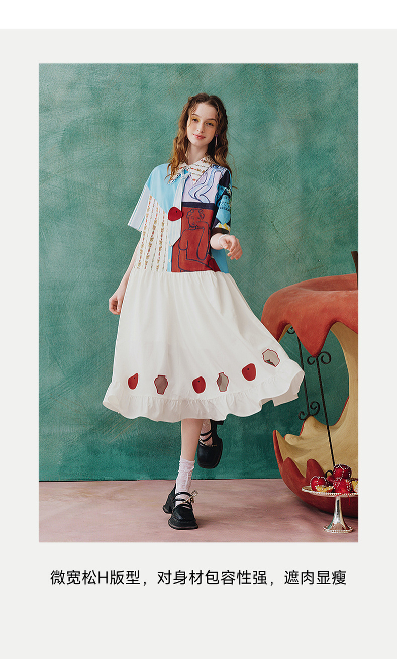 两三事抽象失序2025夏季新款文艺风抽象印花镂空荷叶边裙摆连衣裙