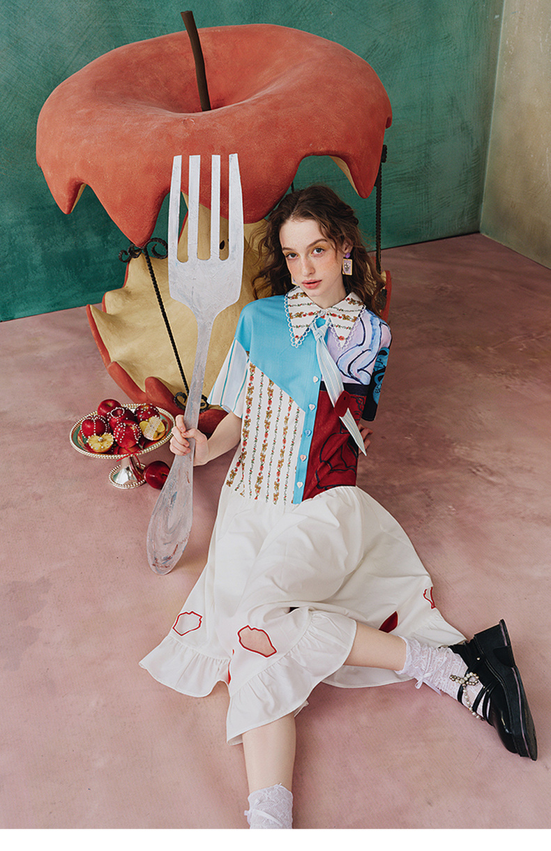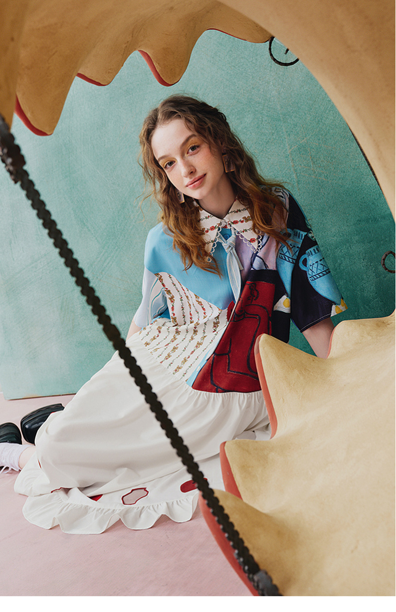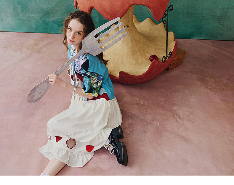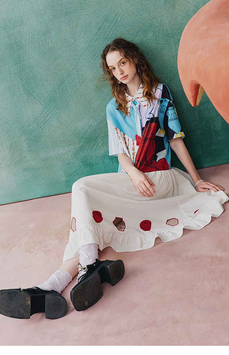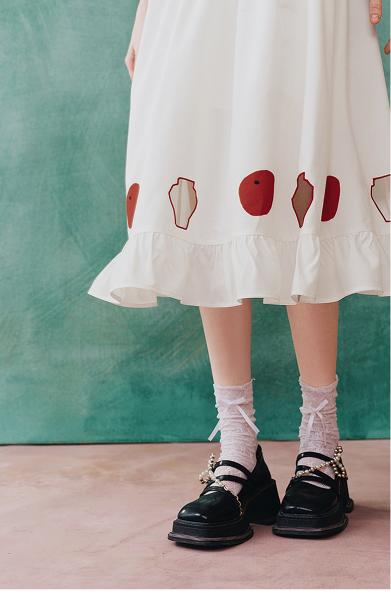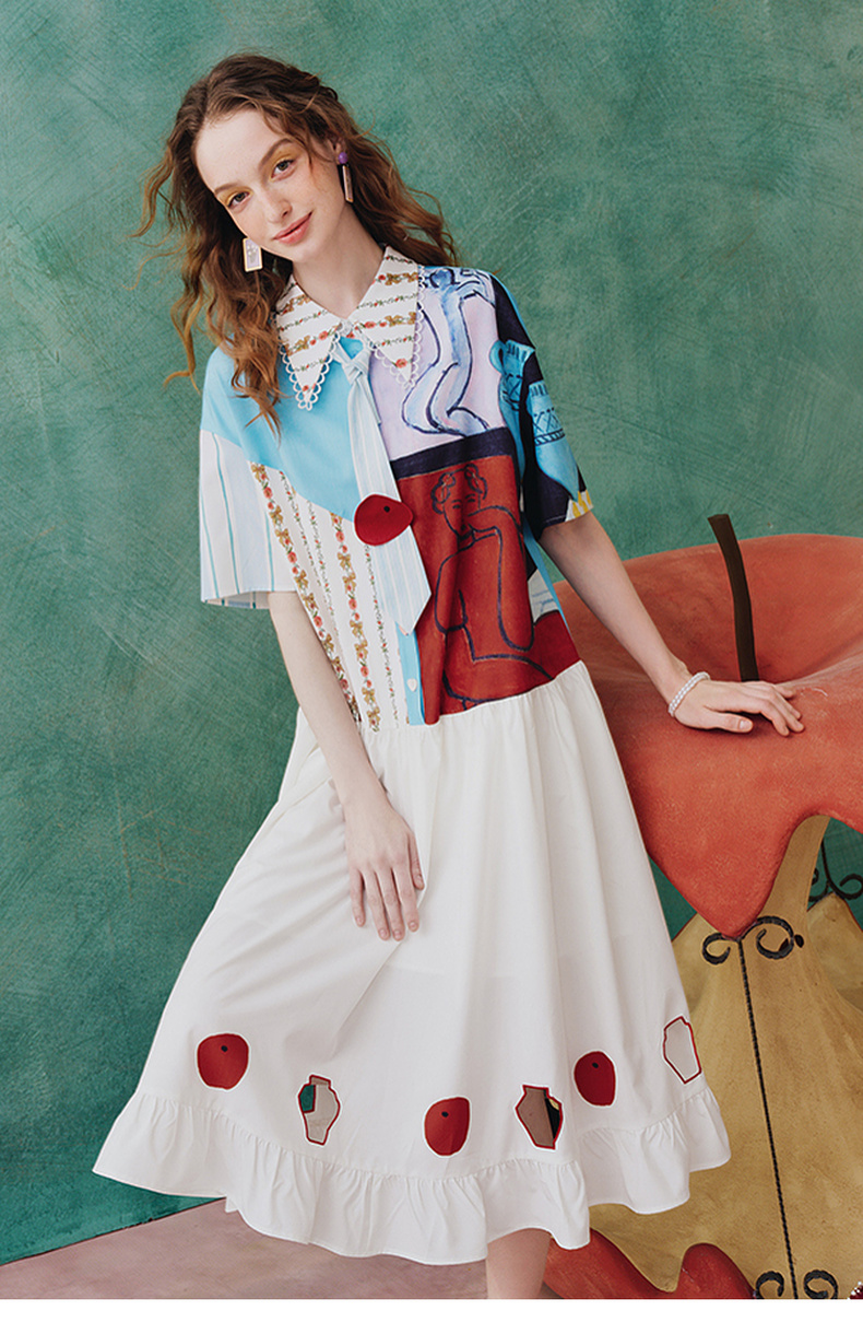 两三事抽象失序2025夏季新款文艺风抽象印花镂空荷叶边裙摆连衣裙