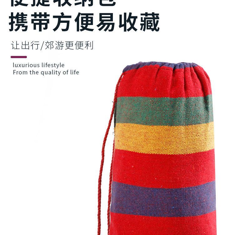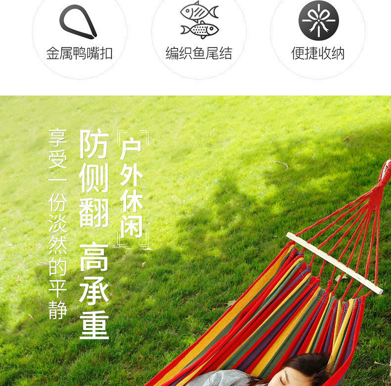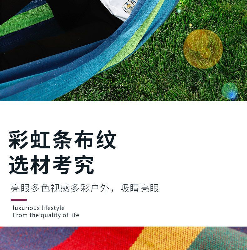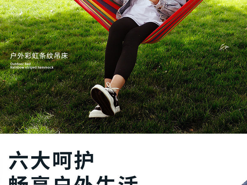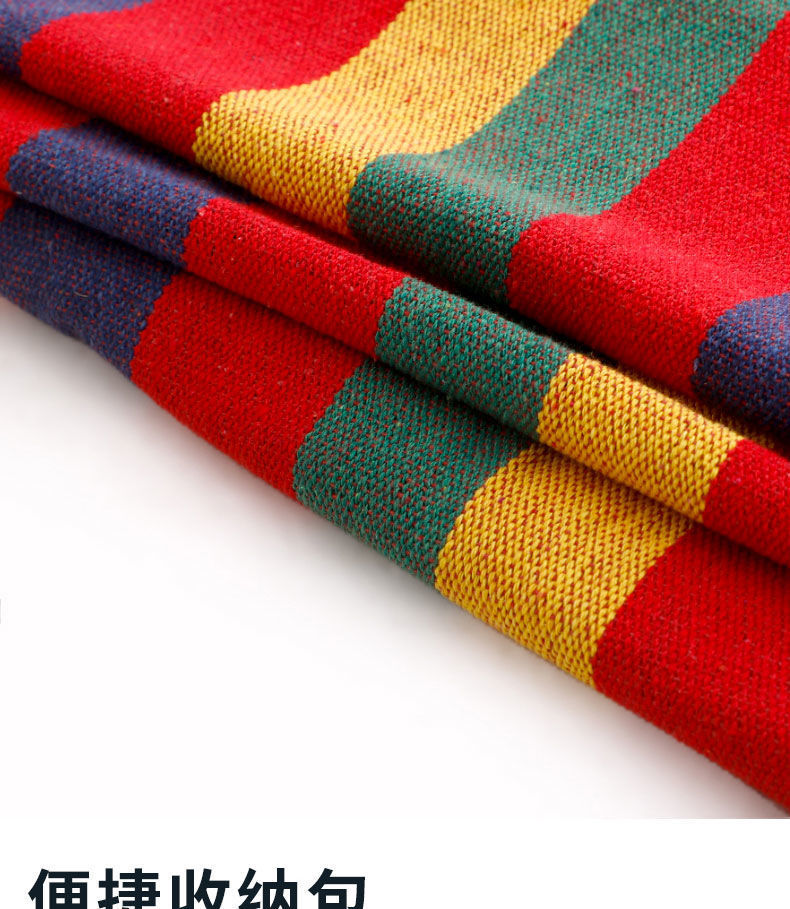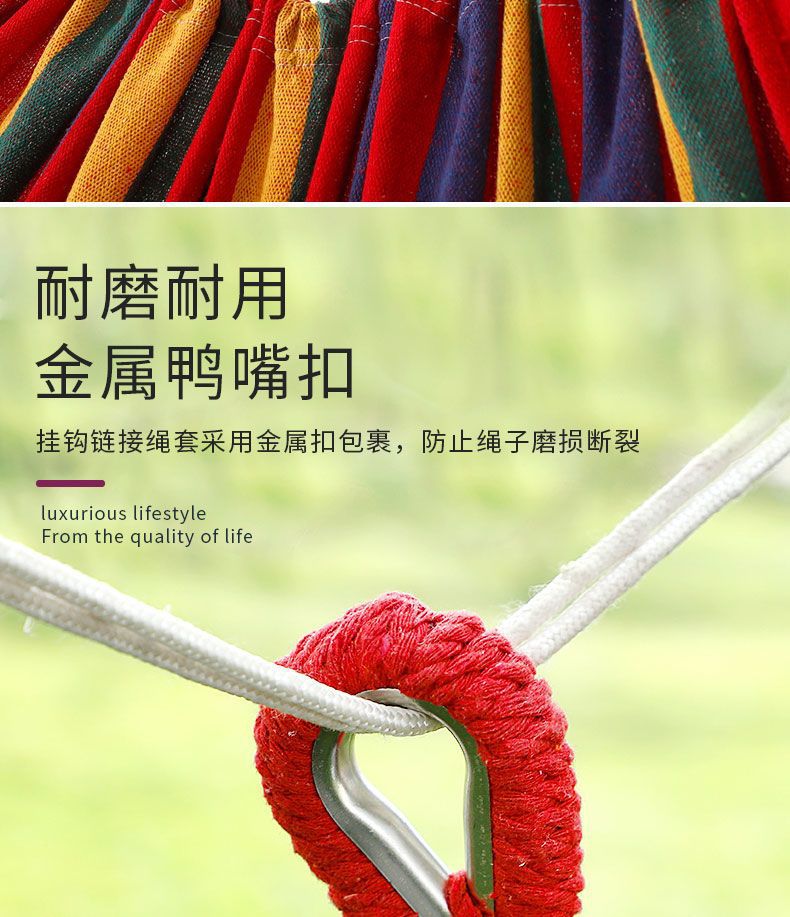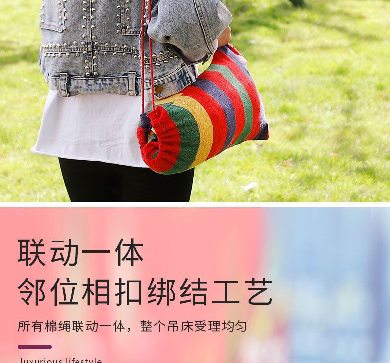 【送绑绳+收纳袋+鸭嘴扣】彩虹吊床,时空悠远,尽享舒适。彩条设计,耐磨材料,鸭嘴扣固定,多色选择,防侧翻安全保障,大人儿童皆适用。多功能实用性强,户外休闲享受!