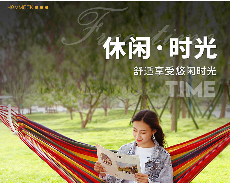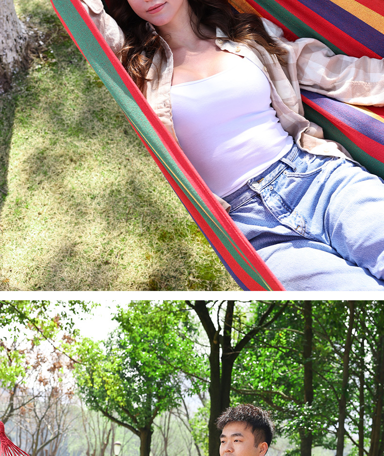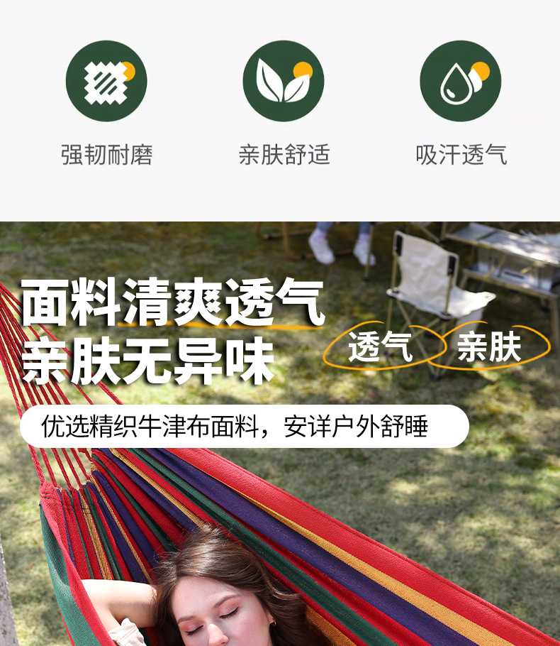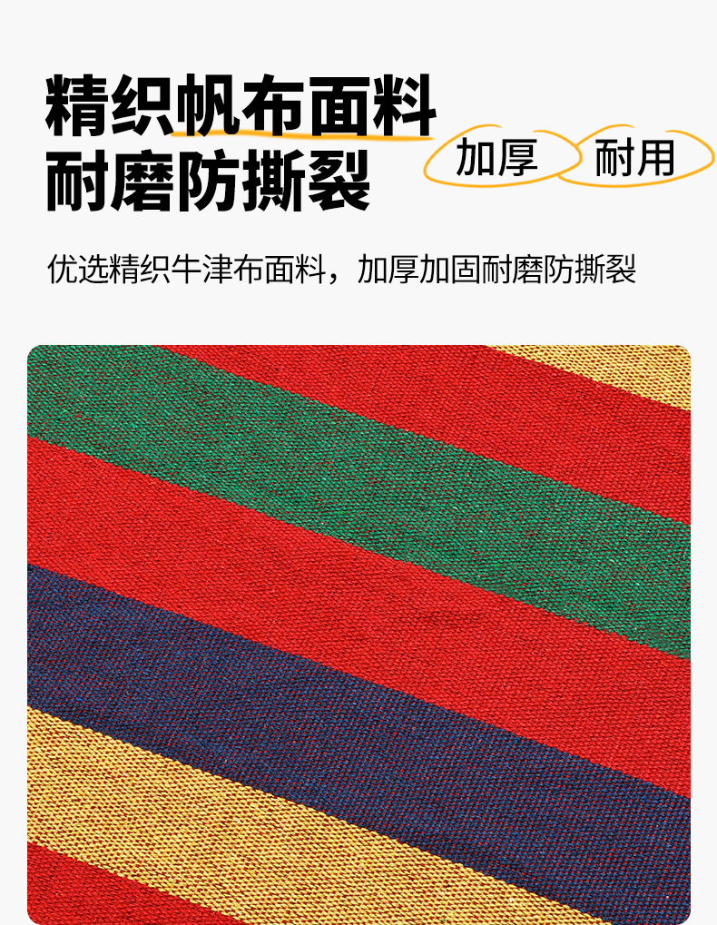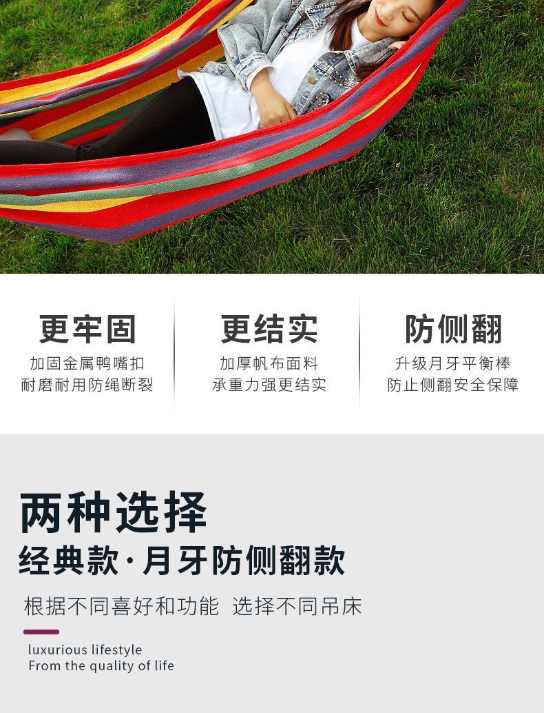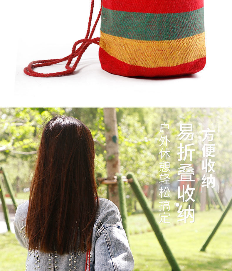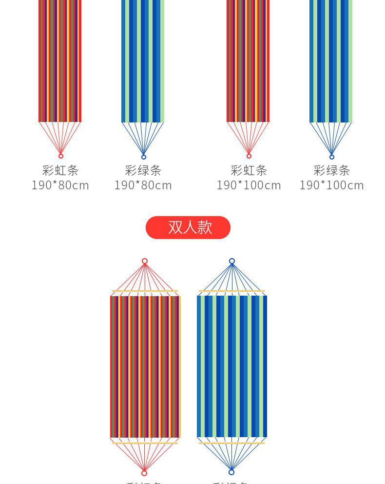 【送绑绳+收纳袋+鸭嘴扣】彩虹吊床,时空悠远,尽享舒适。彩条设计,耐磨材料,鸭嘴扣固定,多色选择,防侧翻安全保障,大人儿童皆适用。多功能实用性强,户外休闲享受!