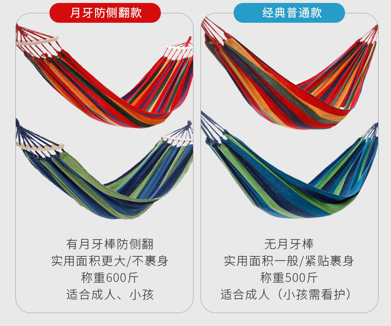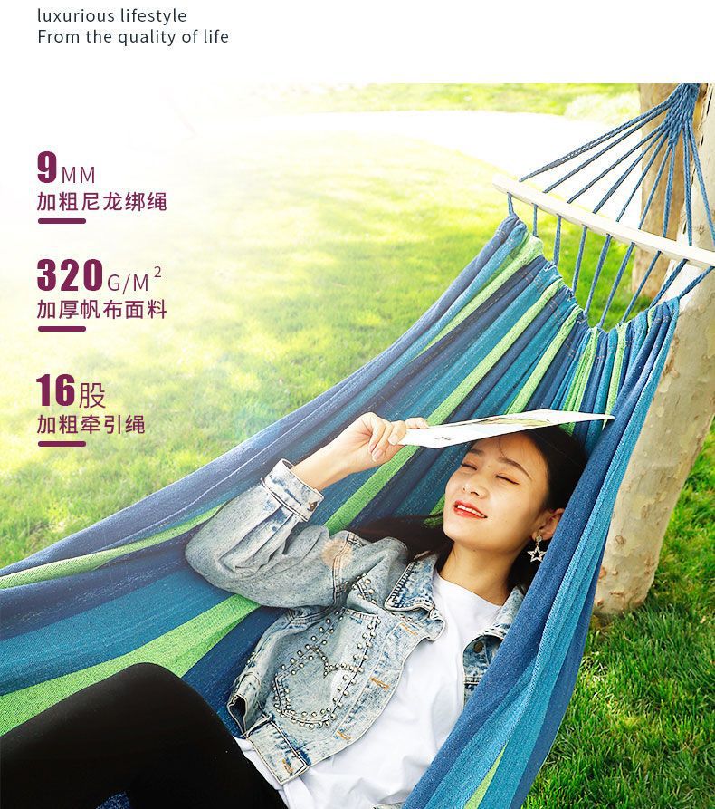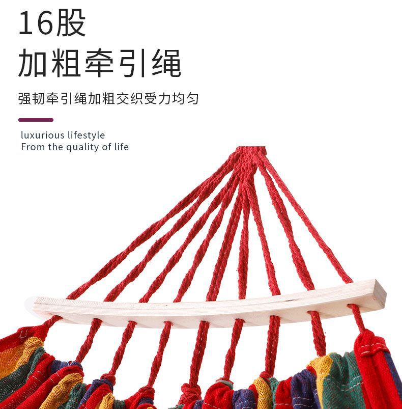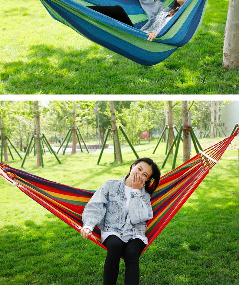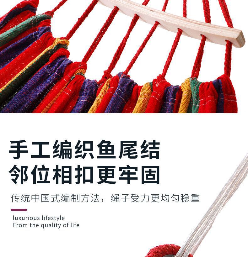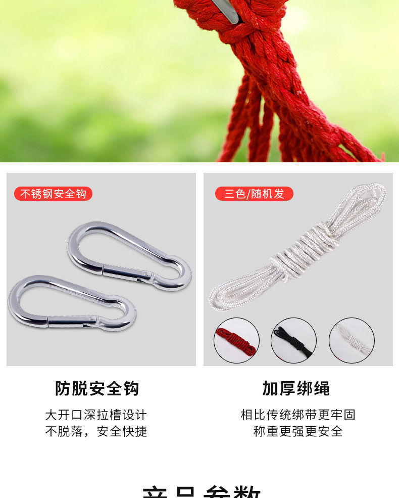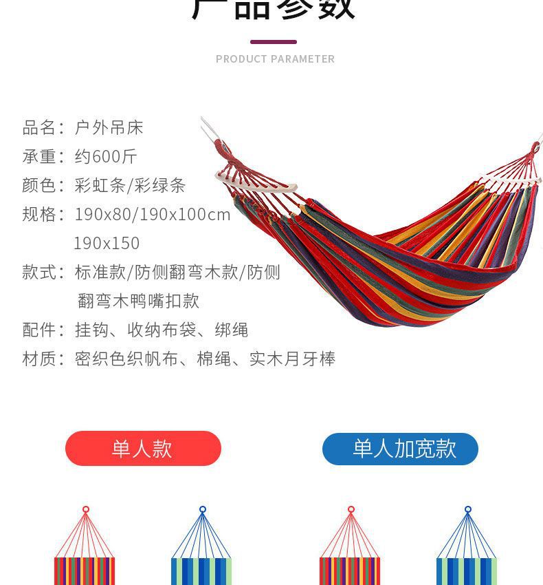 【送绑绳+收纳袋+鸭嘴扣】彩虹吊床,时空悠远,尽享舒适。彩条设计,耐磨材料,鸭嘴扣固定,多色选择,防侧翻安全保障,大人儿童皆适用。多功能实用性强,户外休闲享受!