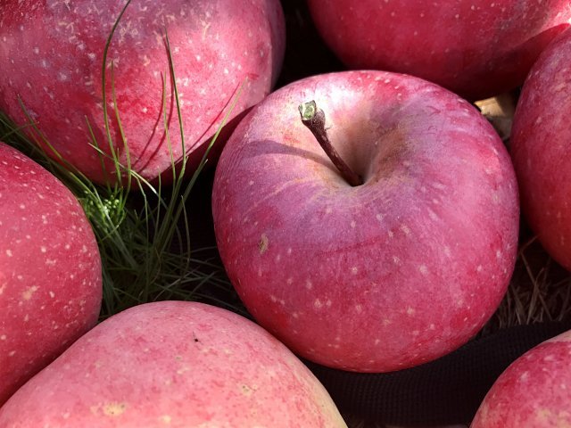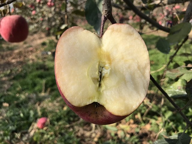 【生产方式】苹果2011年起生态种植,不使用任何化肥、农药、生长调节剂等,施用花生麸,自制石硫合剂,波尔多液以及云杆菌防治病虫等,种植草、野豌豆当绿肥并控制杂草,人工除草,不打蜡。