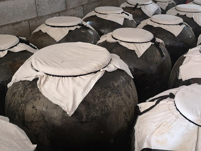 苹果汁原浆倒入大瓮,厌氧发酵,变为苹果酒