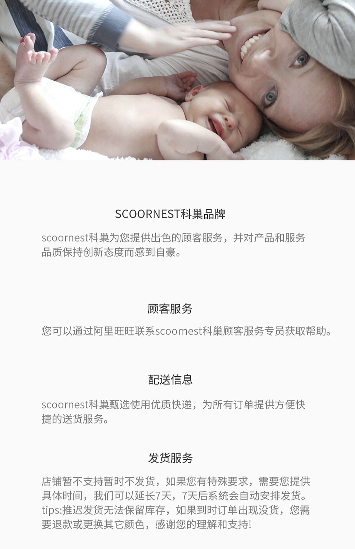 - Scoornest始终秉承给每一位宝宝送去科学的、关心的、创新的成长体验,通过提供商品和服务,使顾客形成守护、发展、巩固这种弥足珍贵的亲情的爱。