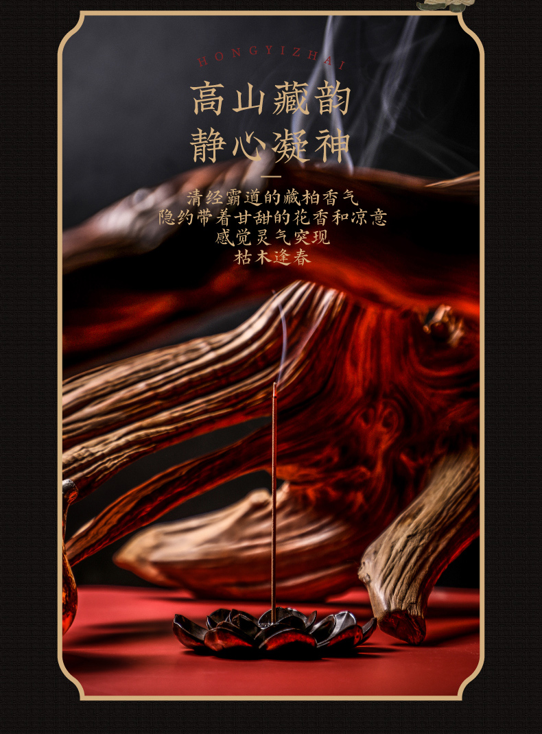 初燃,藏柏木的霸道气息全无遮挡,甘甜馥郁,极具异域风情;渐渐地,清雅的草药香与枯干的草叶香交织,沉稳中带一丝萧瑟;仔细品闻,隐约又有软绵的花香与凉意。