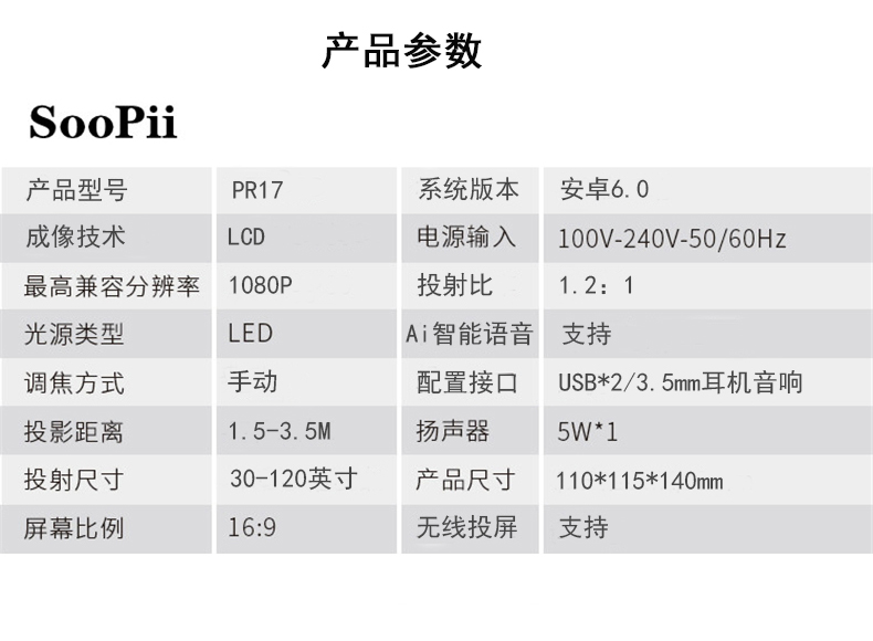 soopii(首佩)无线安卓AI语音投影仪 PR17