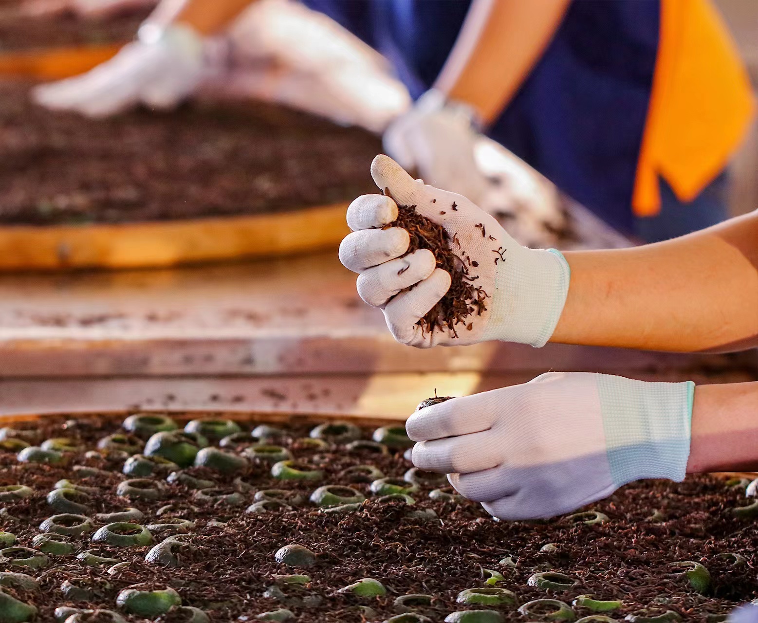 人工将宫廷级别普洱熟茶料填入晾干的果壳内