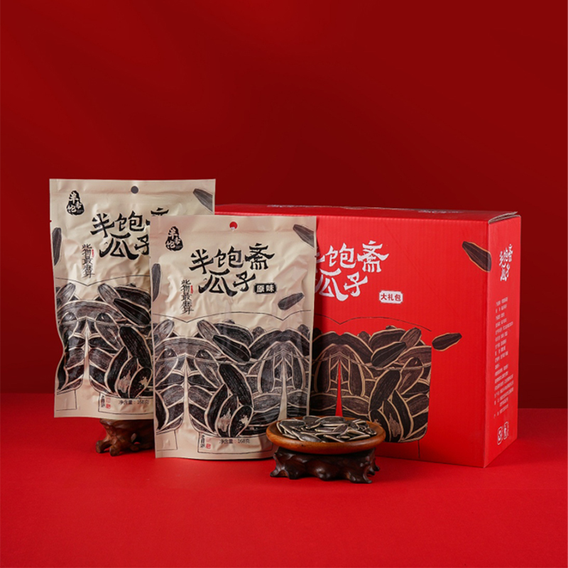 半饱斋瓜子包装低调有内涵,“此物最磨牙”画出自著名画家老圃之手。自己吃,送人,都非常大气。