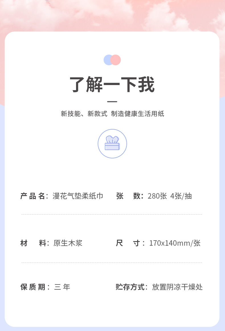 【漫花气垫纸巾整箱30包】4D压花家用抽纸,漫花纸巾,恍若梦境。原木四层,压花气垫。温暖如春日阳光,柔软似彩云飘逸。快来抓住这份梦幻,留住至美瞬间!