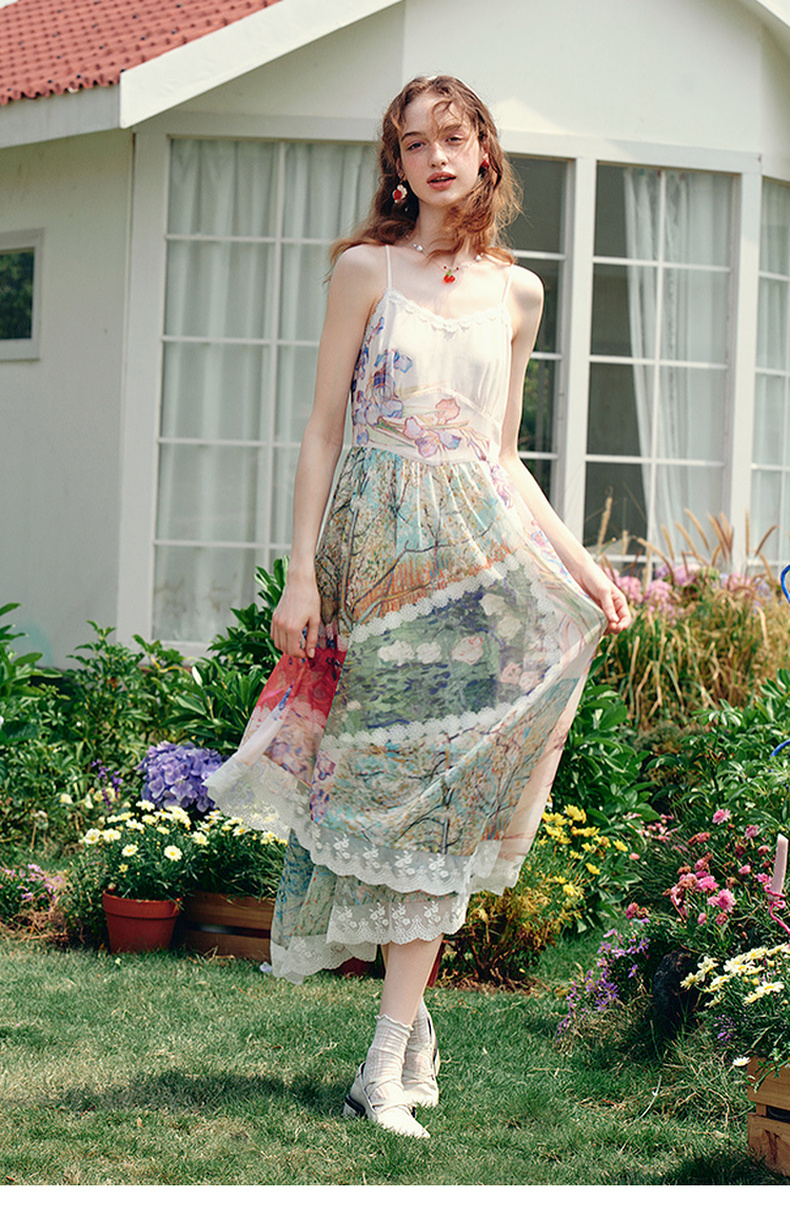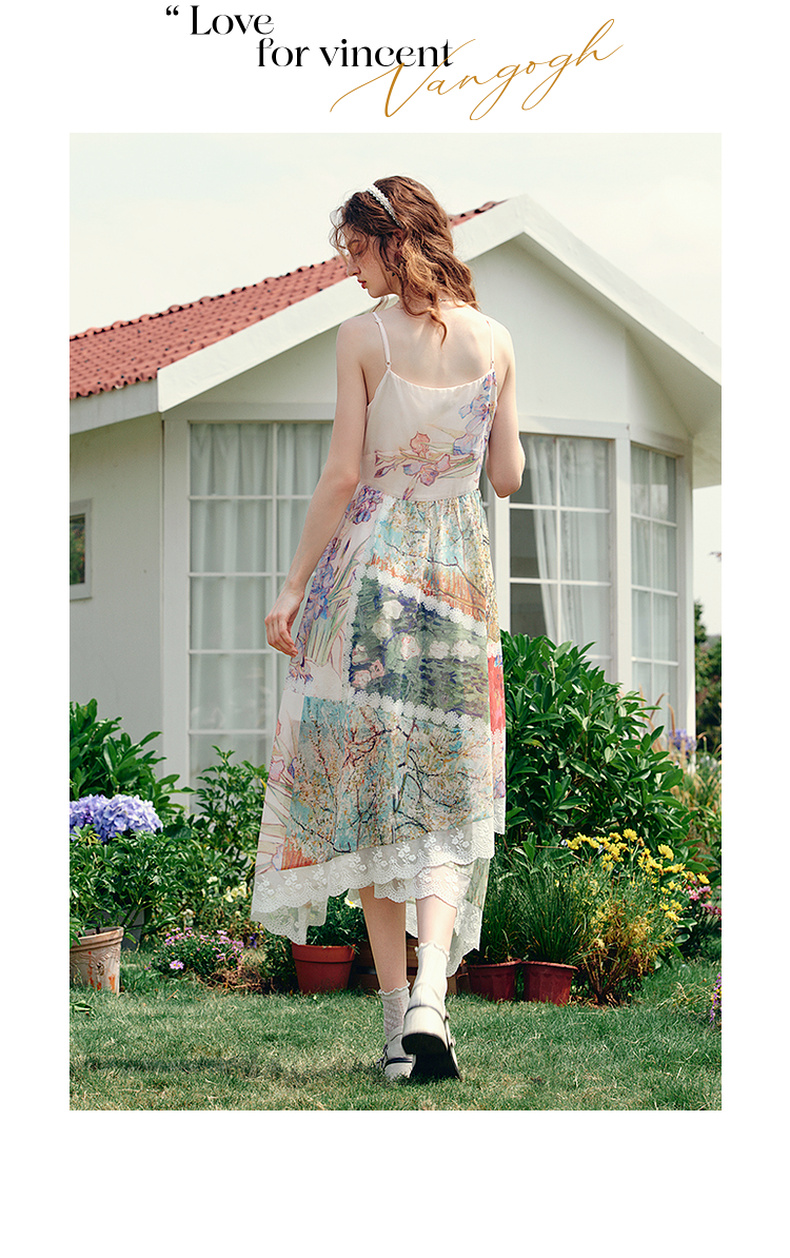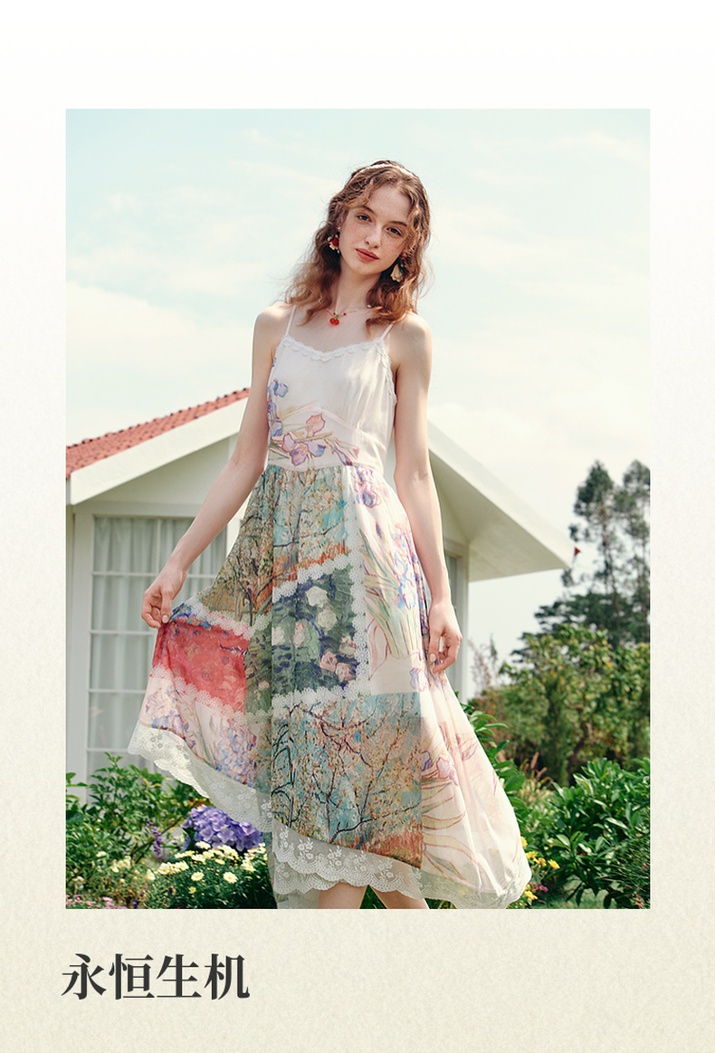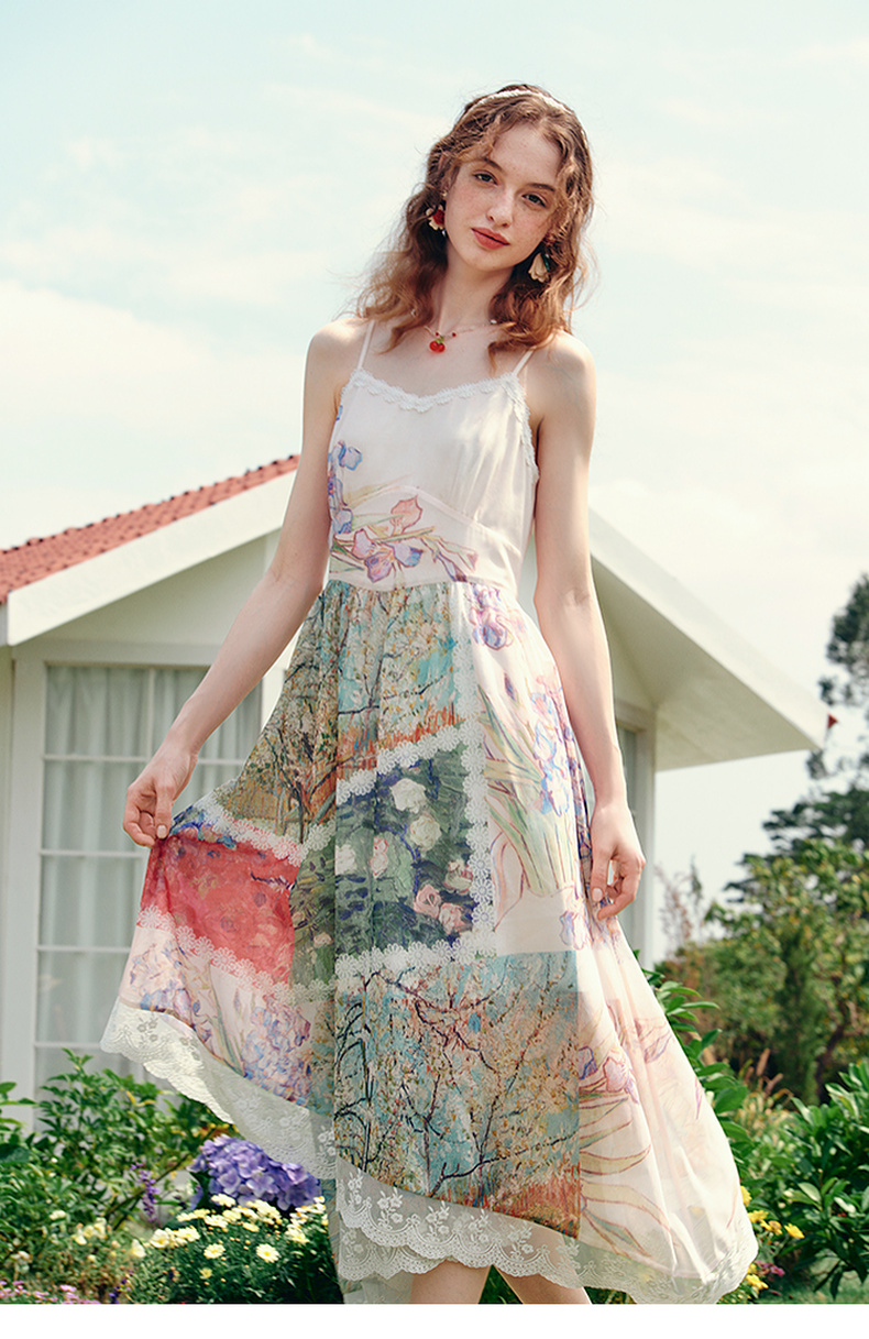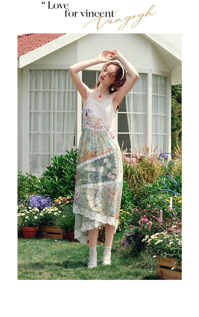 两三事梵高文艺永恒生机2025夏新款法式蕾丝拼接印花吊带裙连衣裙