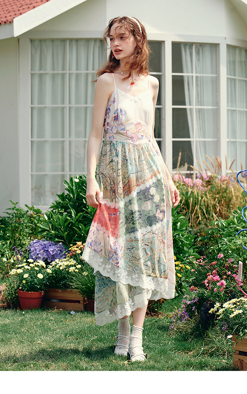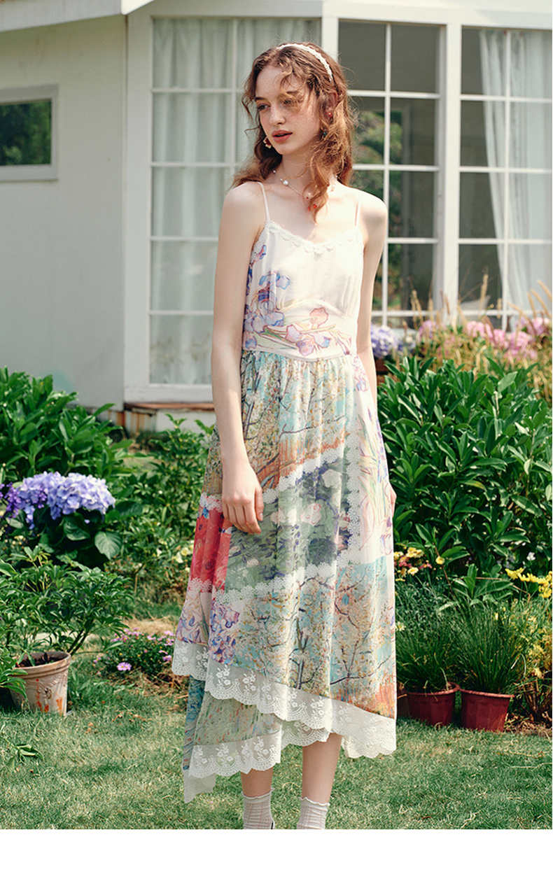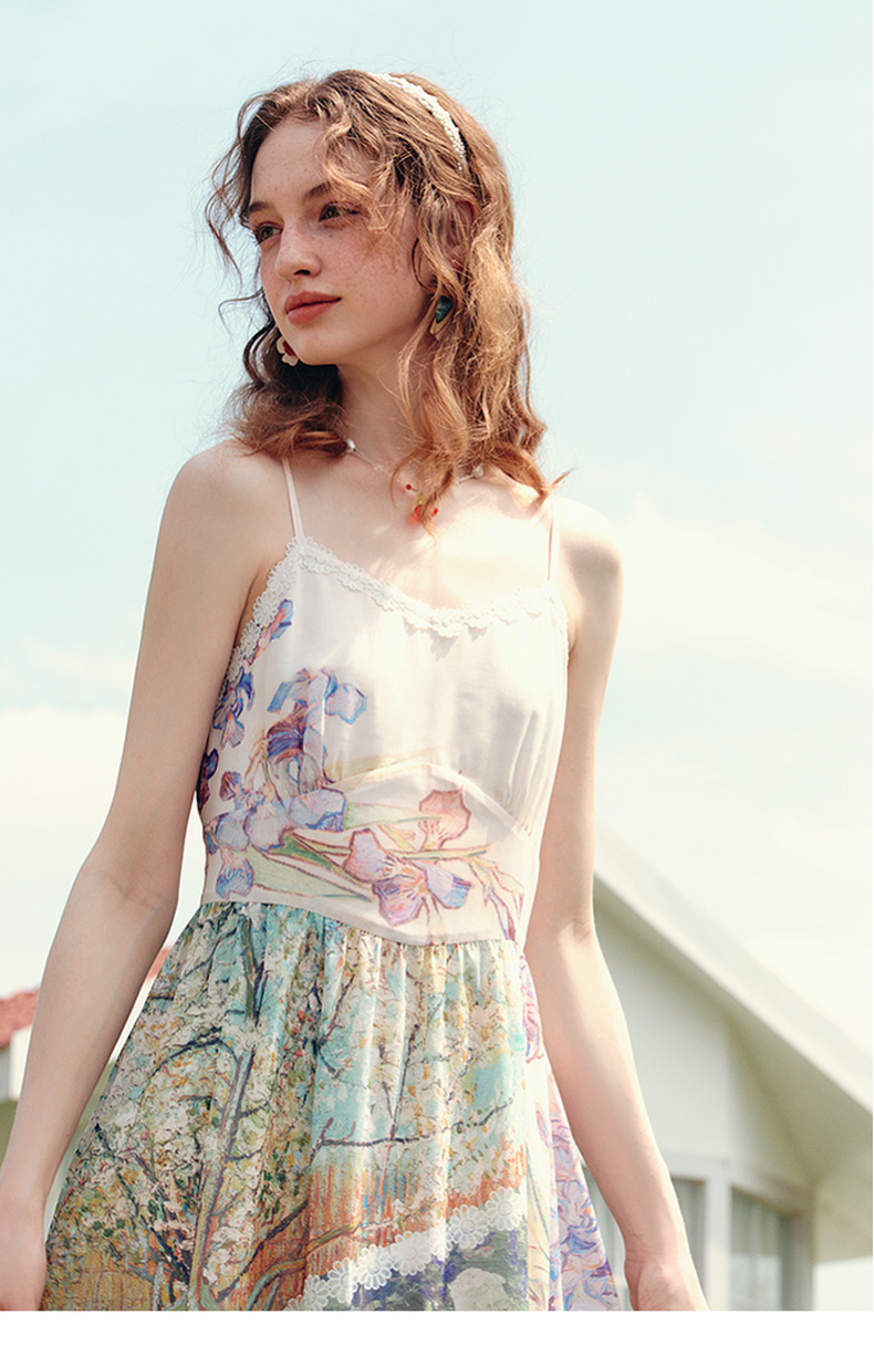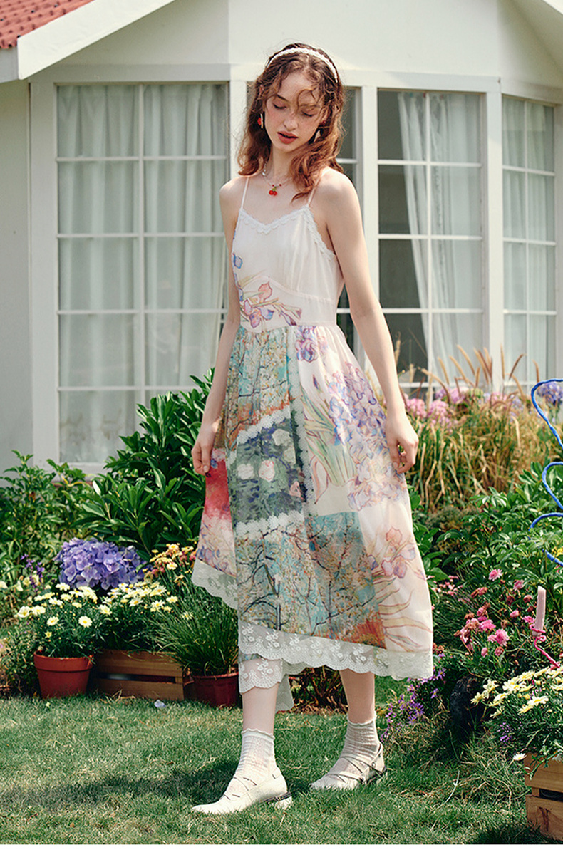 两三事梵高文艺永恒生机2025夏新款法式蕾丝拼接印花吊带裙连衣裙