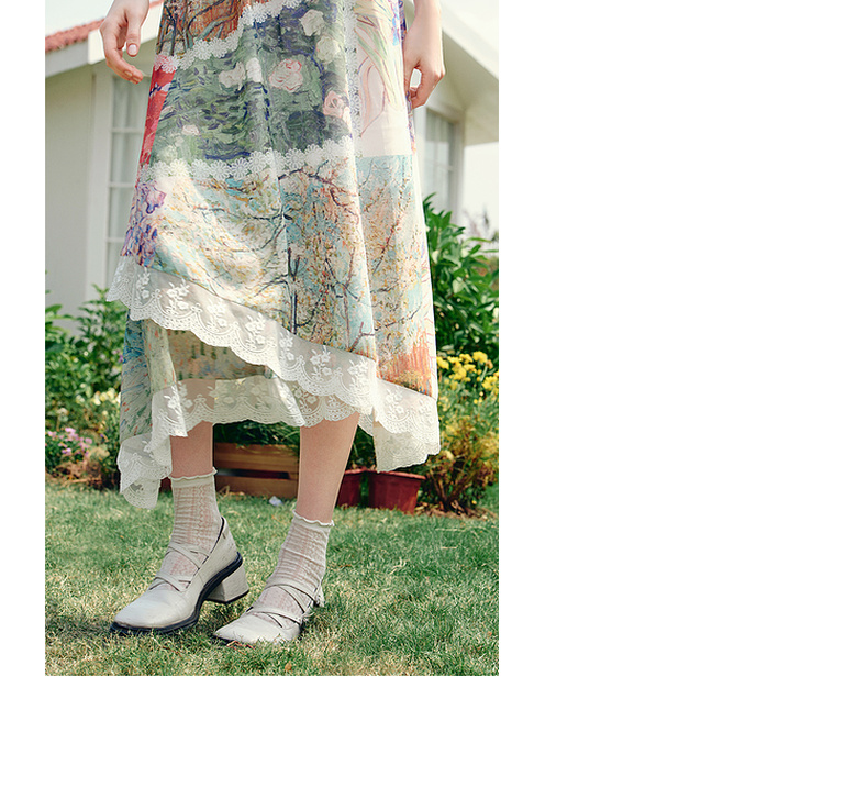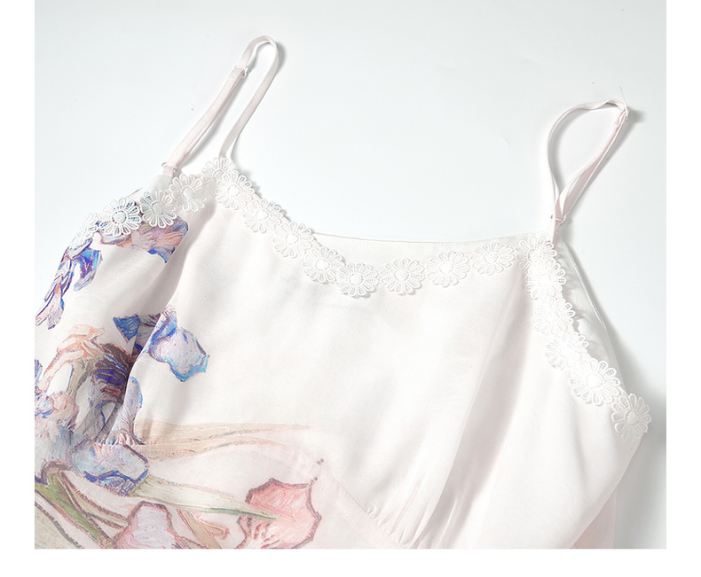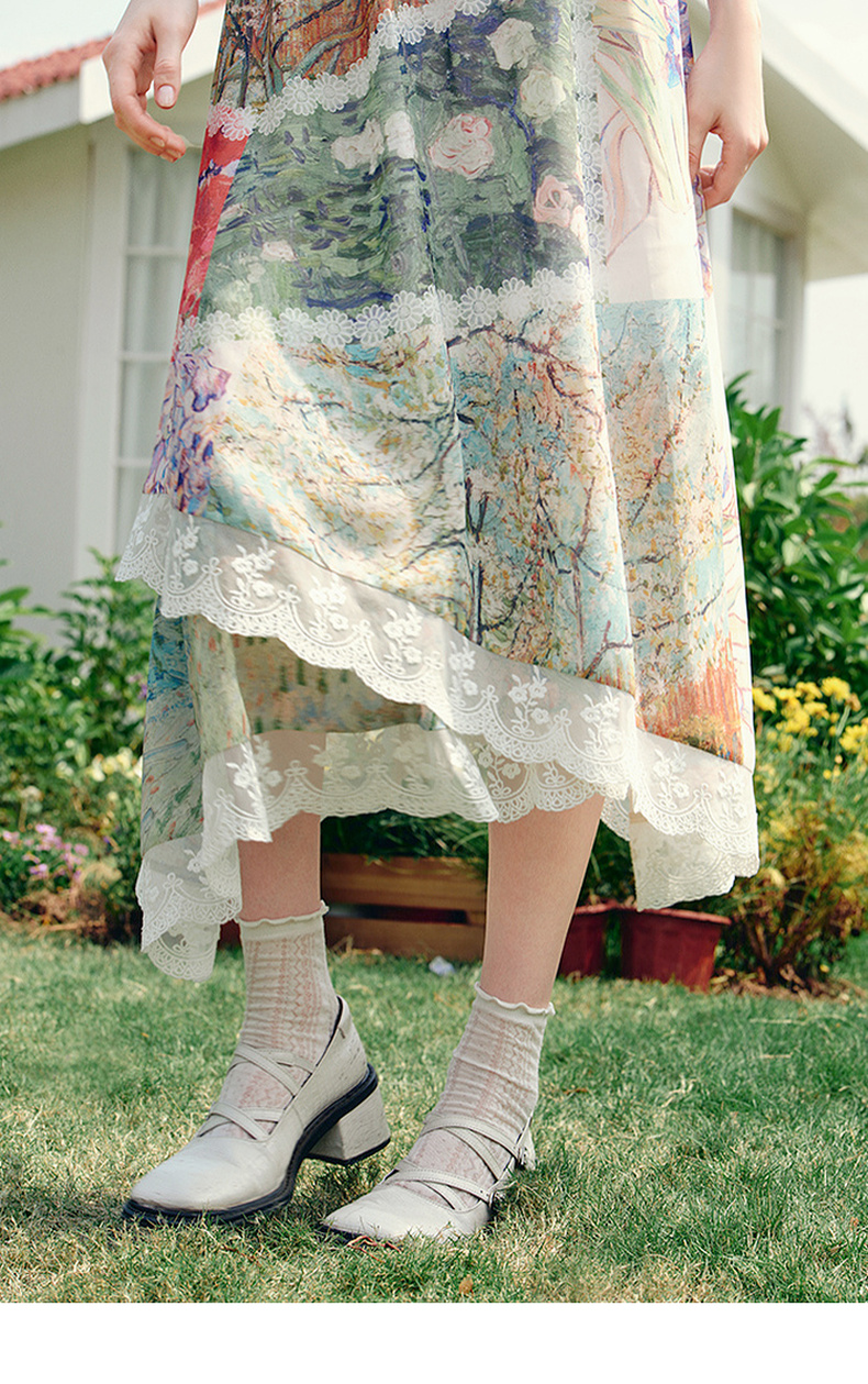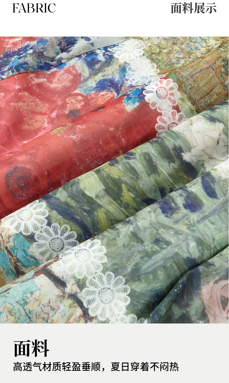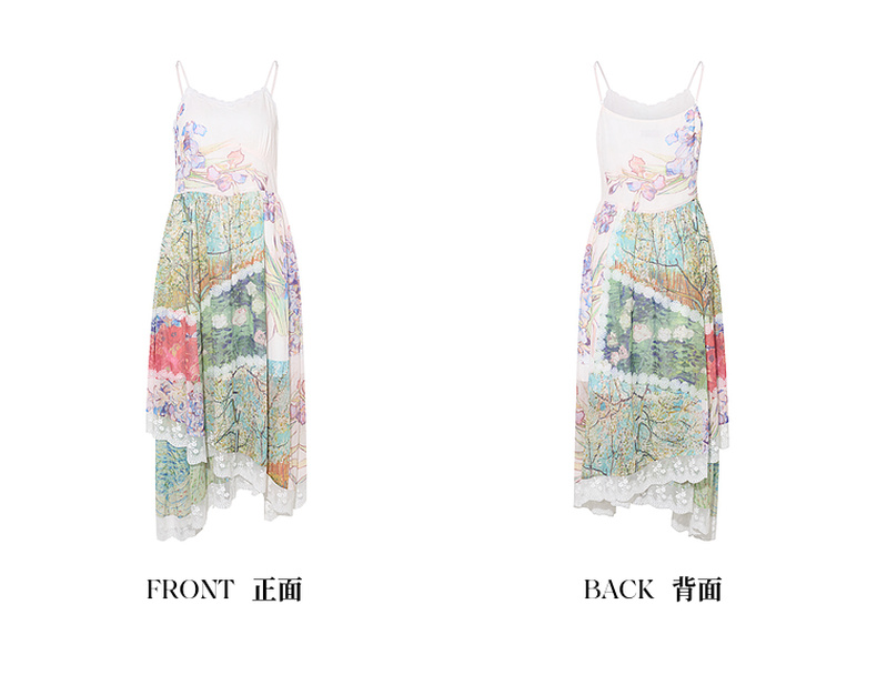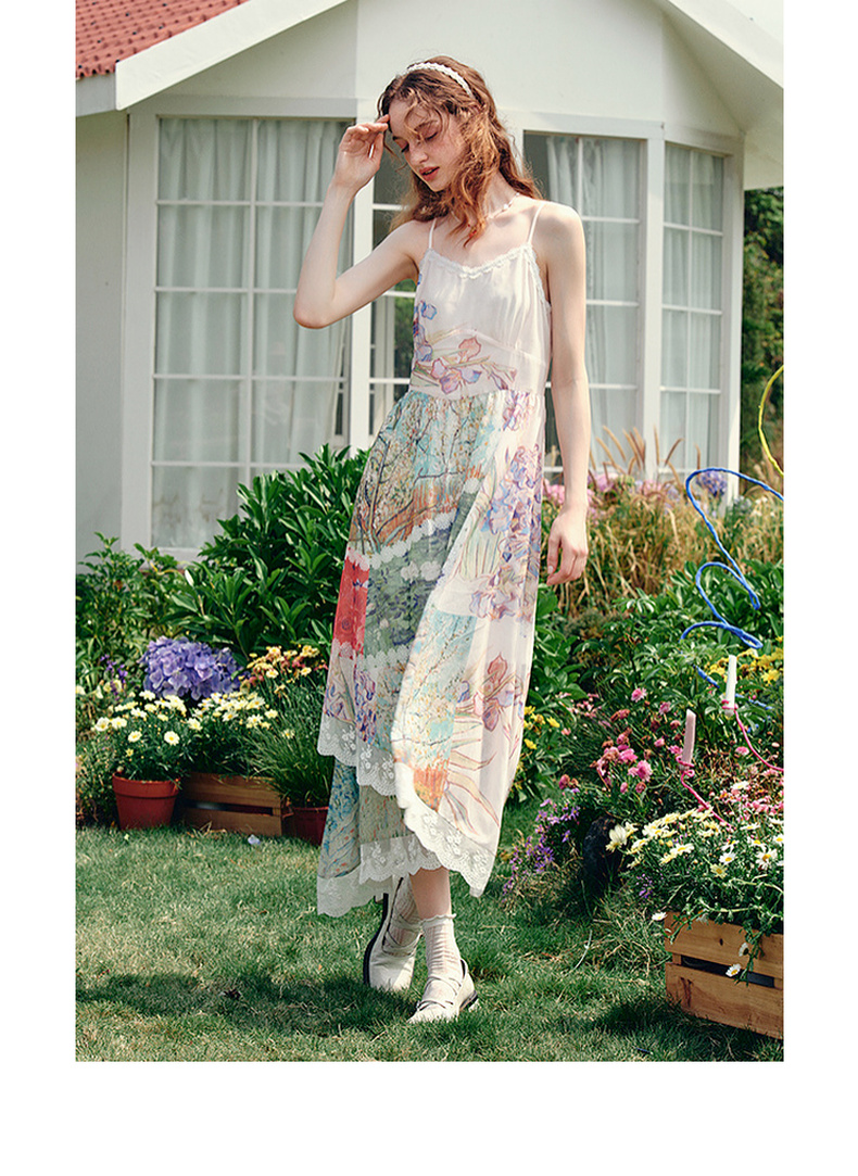 两三事梵高文艺永恒生机2025夏新款法式蕾丝拼接印花吊带裙连衣裙