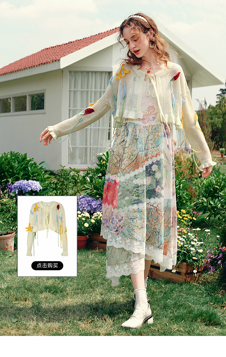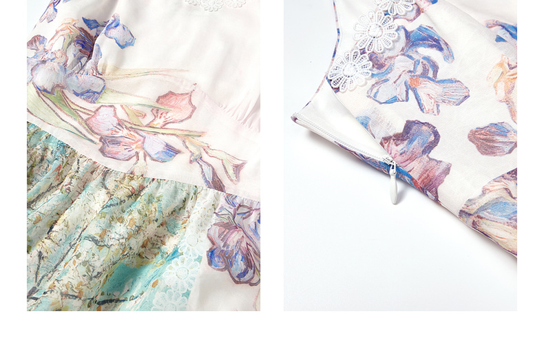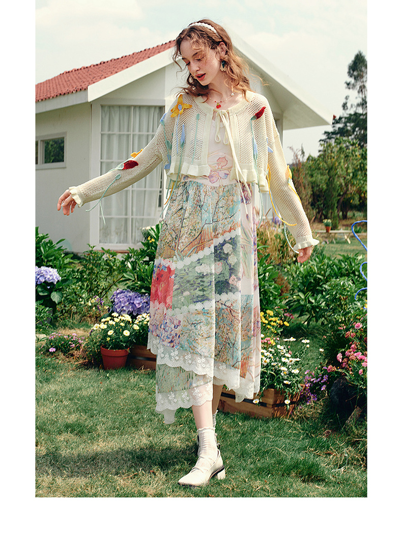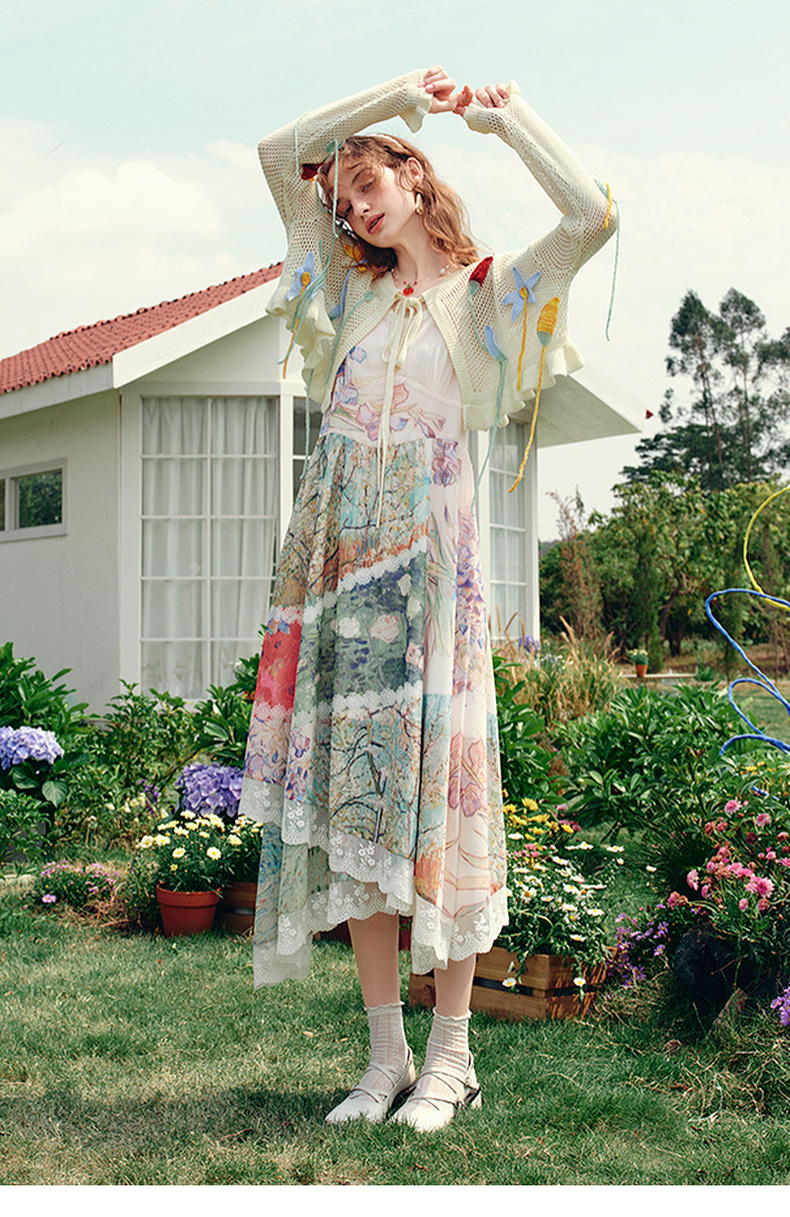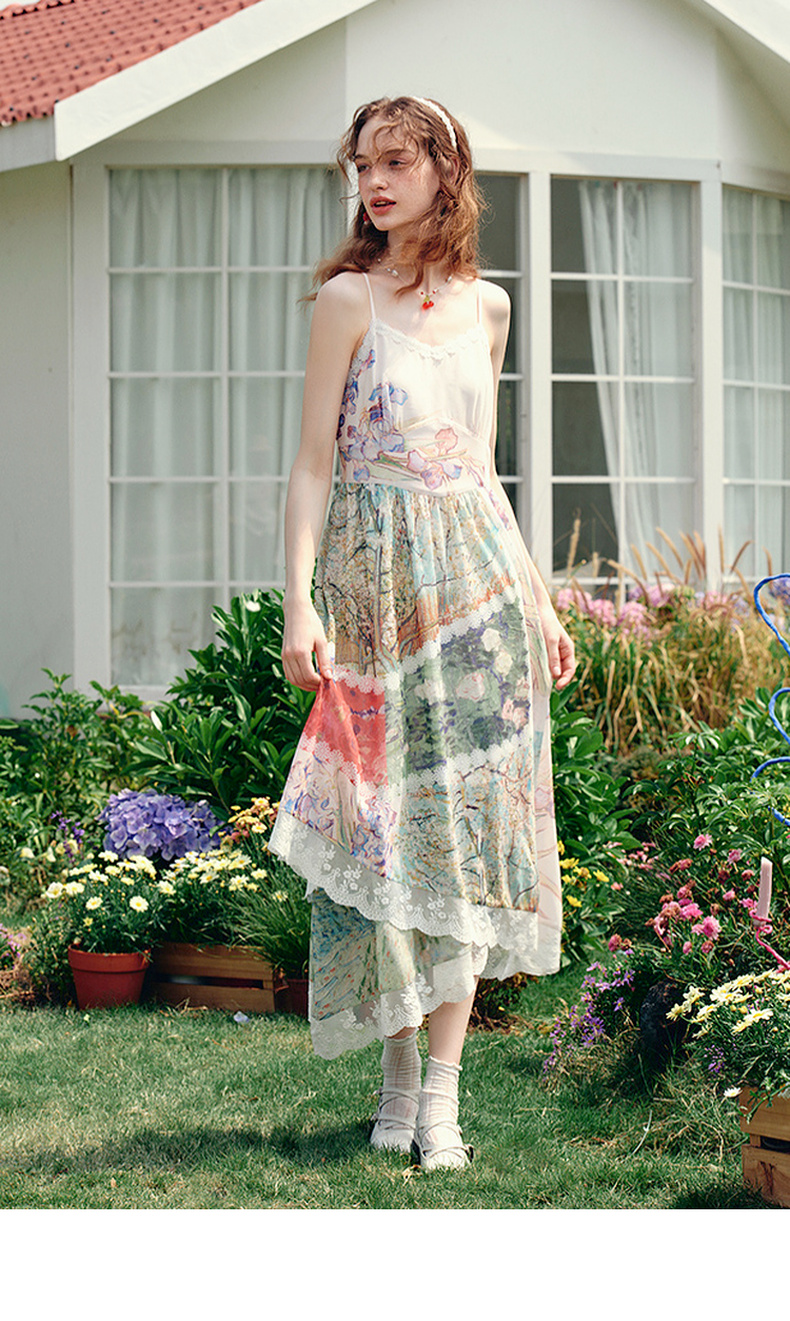 两三事梵高文艺 花屿捕梦 2025夏季新款拼布印花荷叶边吊带连衣裙